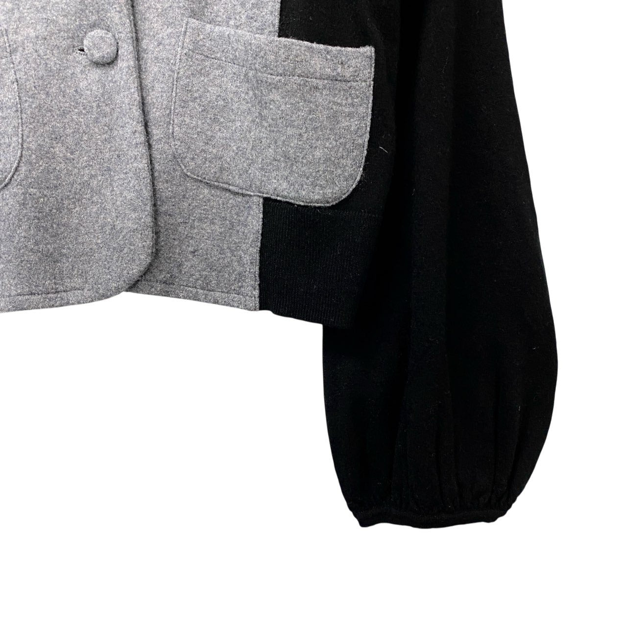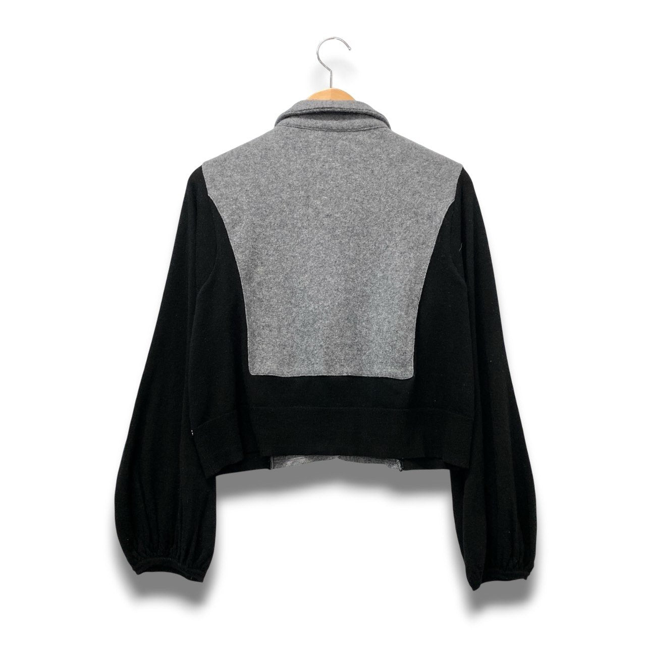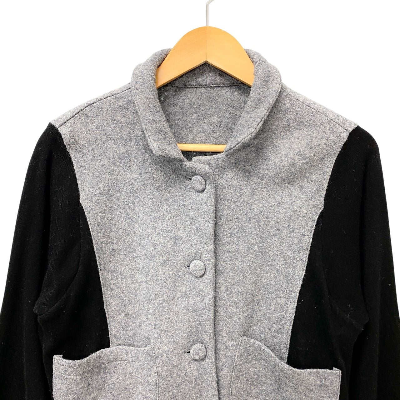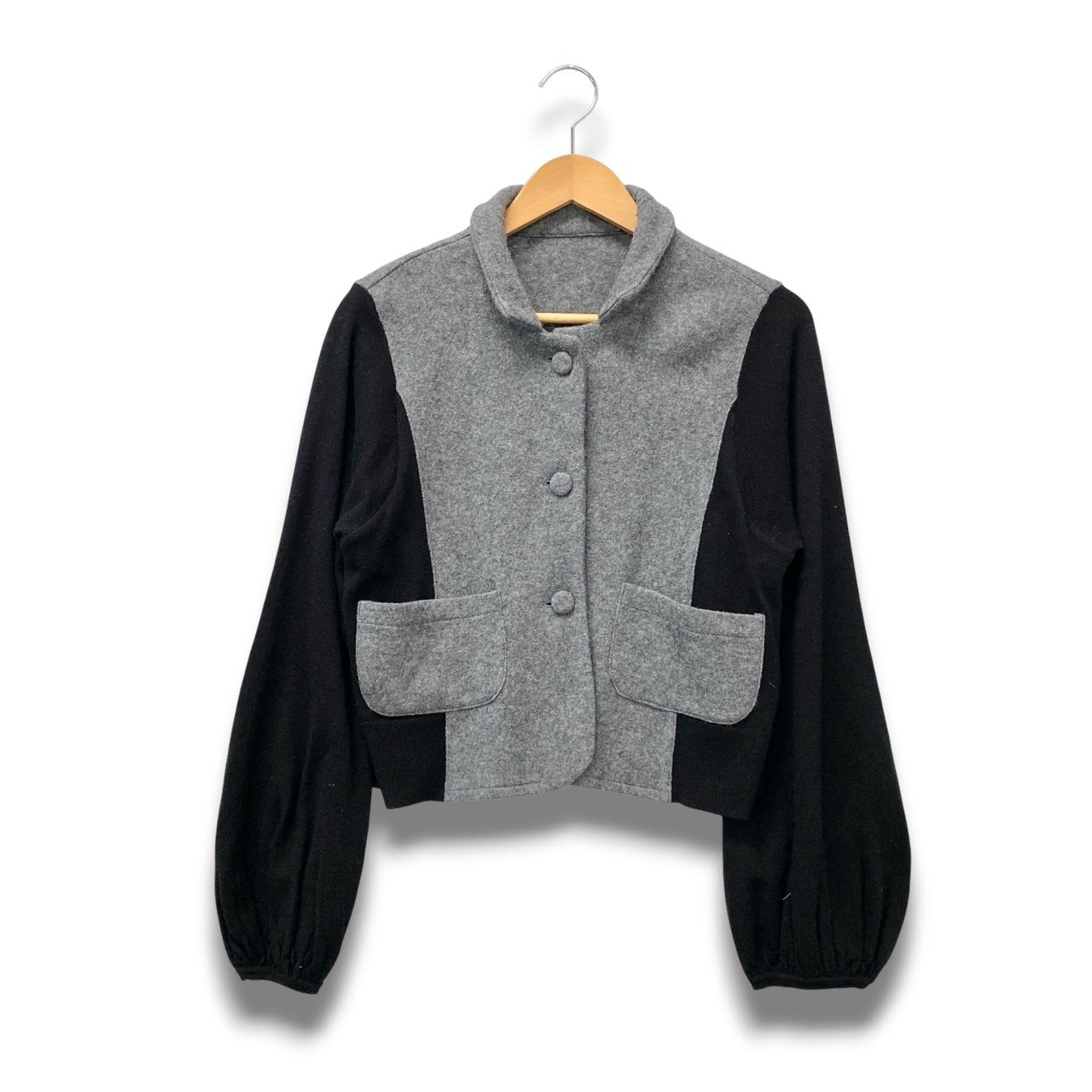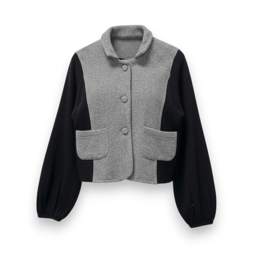 落ち着いたライトグレー(杢グレー系)とブラックのバイカラーデザインが印象的なウールジャケットです。マットで毛足の短いウール100%素材が上品な温かみを演出。サイドのブラック切替と立体感のある丸みボタン、フラップポケットがアクセントになっています。ふんわりボリュームのあるスリーブとショート丈シルエットで、スカートやワンピースと好相性。秋冬のきれいめスタイルに活躍する一着です。
