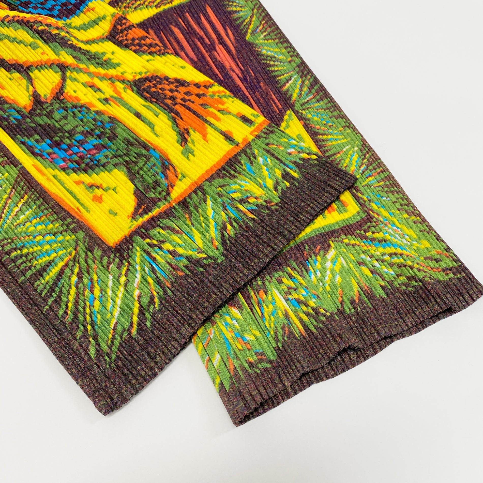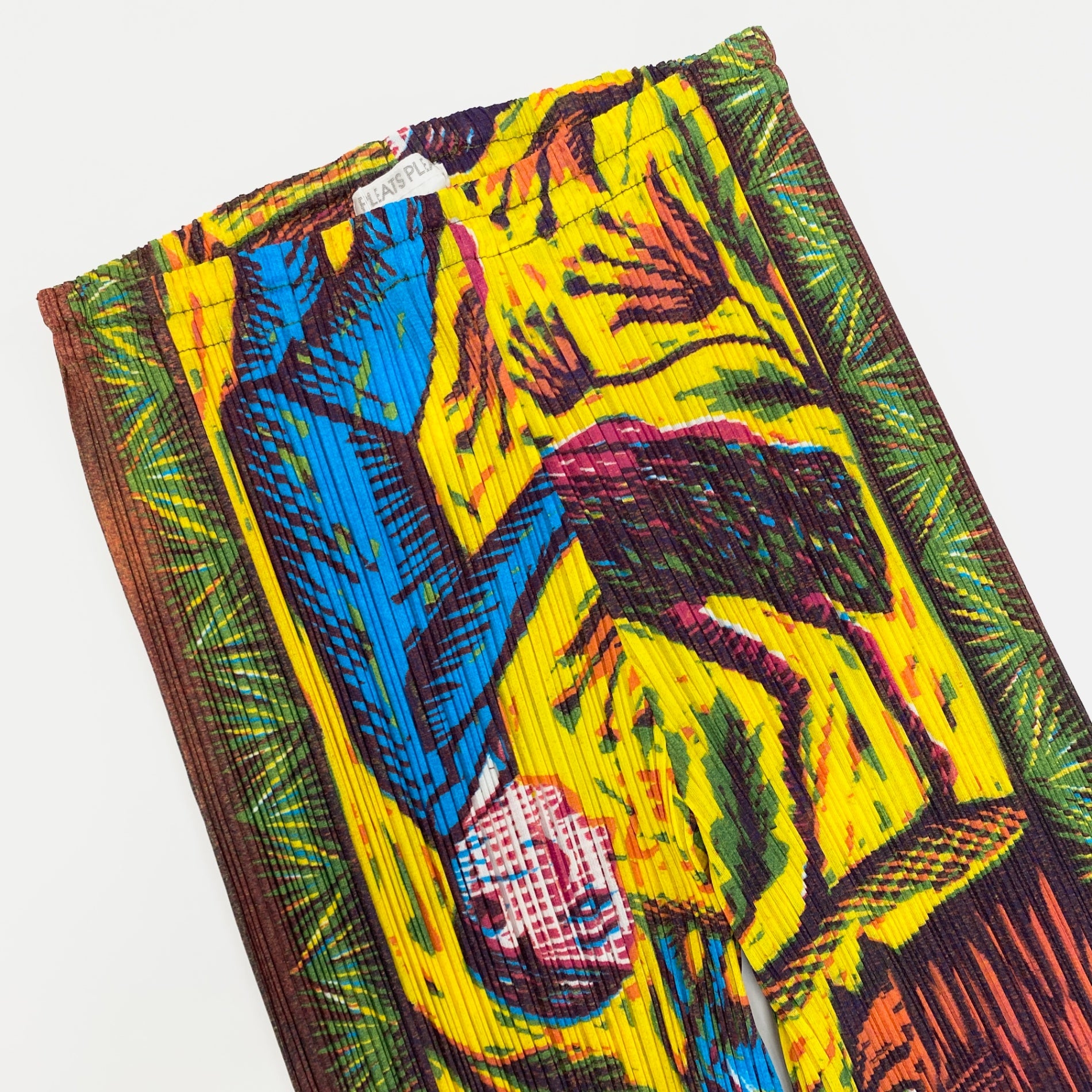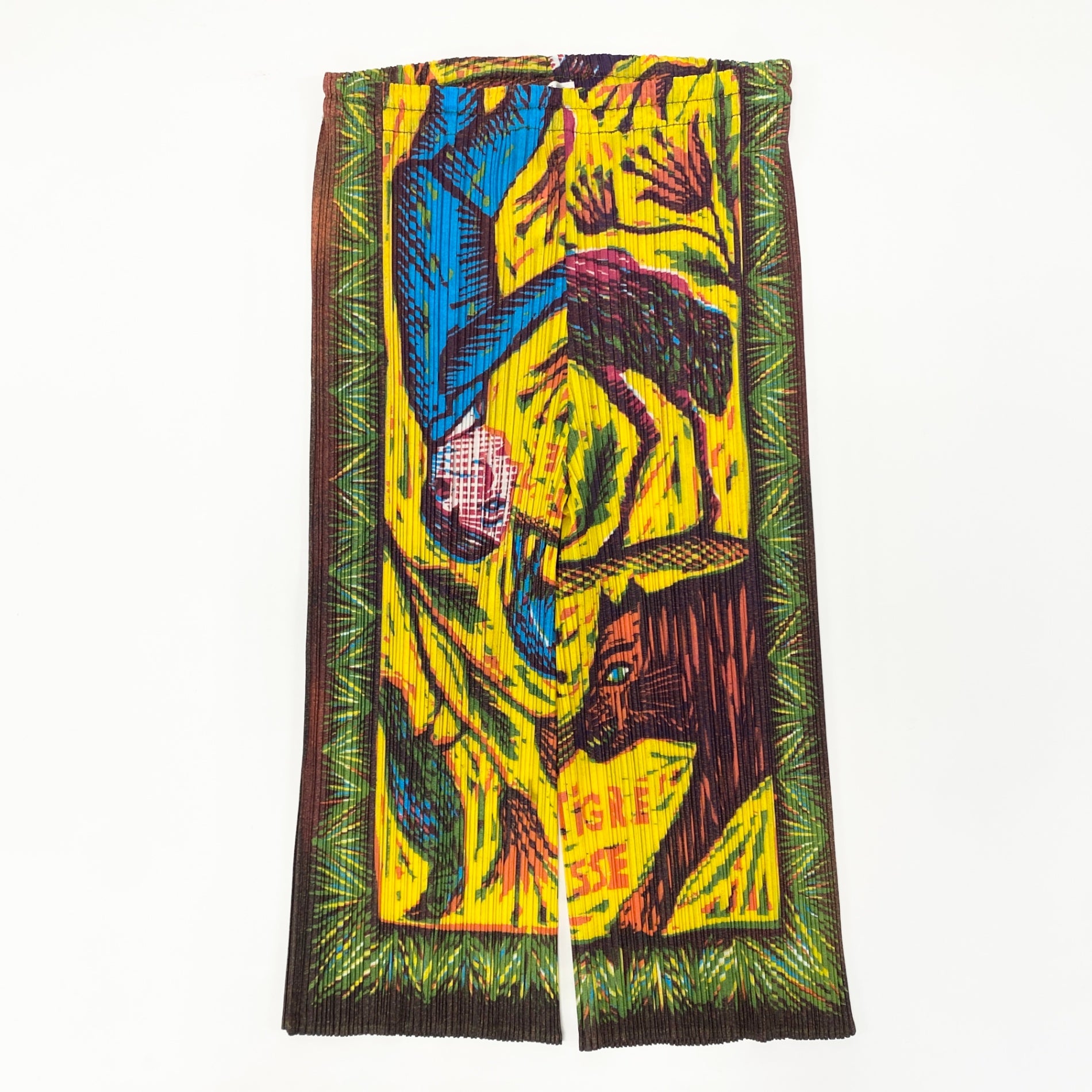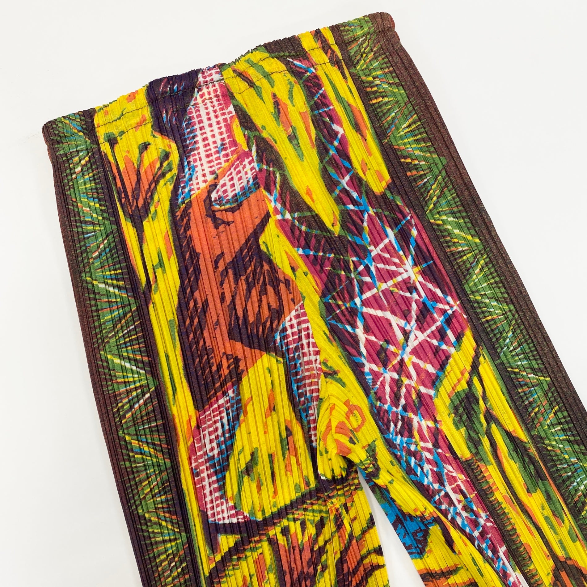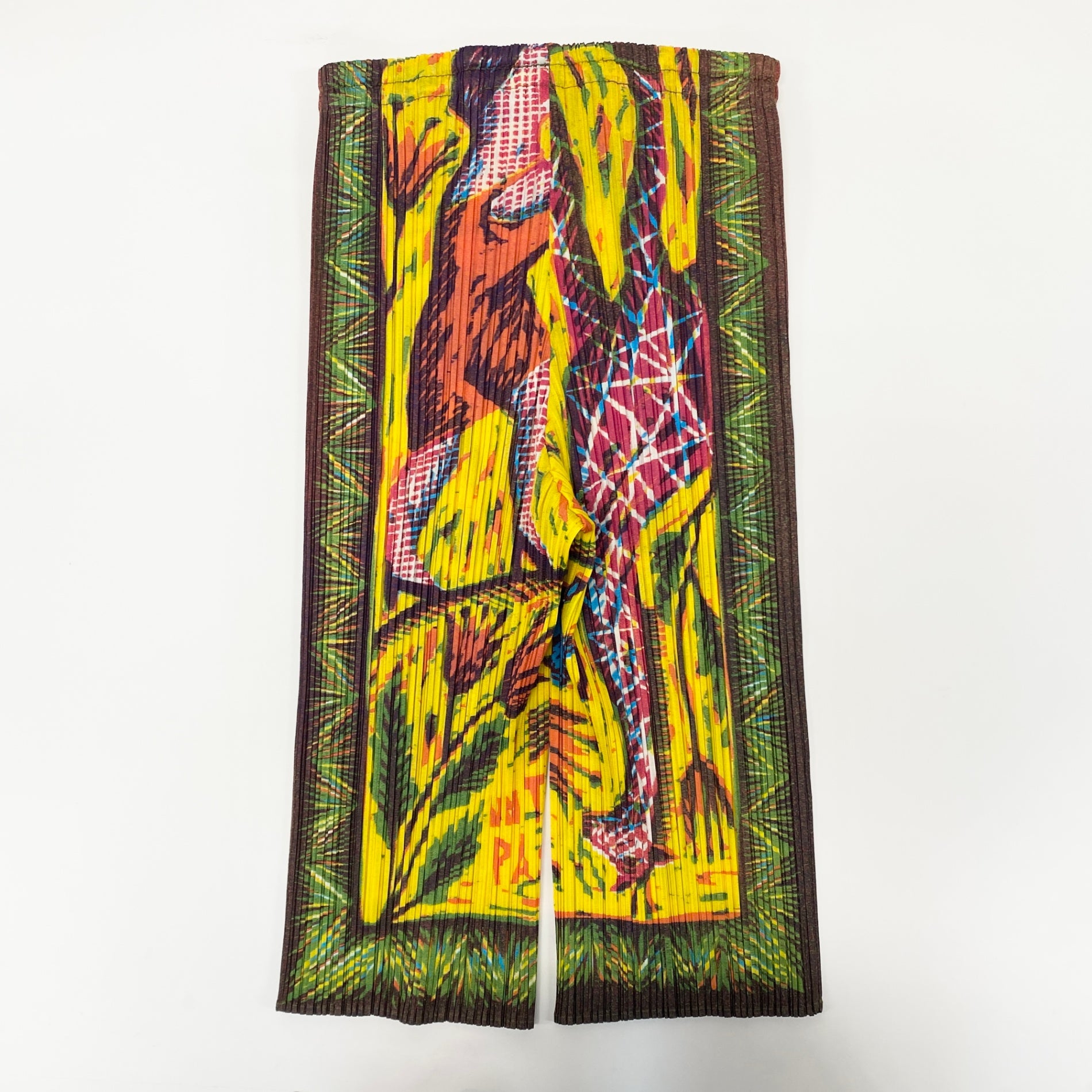 PLEATS PLEASEのボトムは、鮮やかなイエローをベースにブルー・レッド・ブラウンが映える大胆なアート柄プリントが特徴。プリーツ加工のポリエステル素材で軽やかかつ伸縮性があり、シワになりにくいのも魅力です。遊び心のあるグラフィックと、動きに合わせて揺れる独特の立体感がコーディネートの主役に。トップスをシンプルにまとめるだけで個性を演出でき、アート好きやモードなスタイリングを好む方におすすめです。