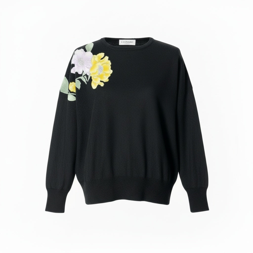 レオナールらしい華やかさが際立つラメニットトップスです。ブラックベースにイエローやラベンダーカラーのフラワープリントが映え、上品で女性らしい印象に仕上がっています。さりげないラメ感のあるニット素材は、軽やかで着心地も良好。デニムやスカートと合わせたきれいめカジュアルから、上品なお出かけスタイルまで幅広く活躍する一着です。