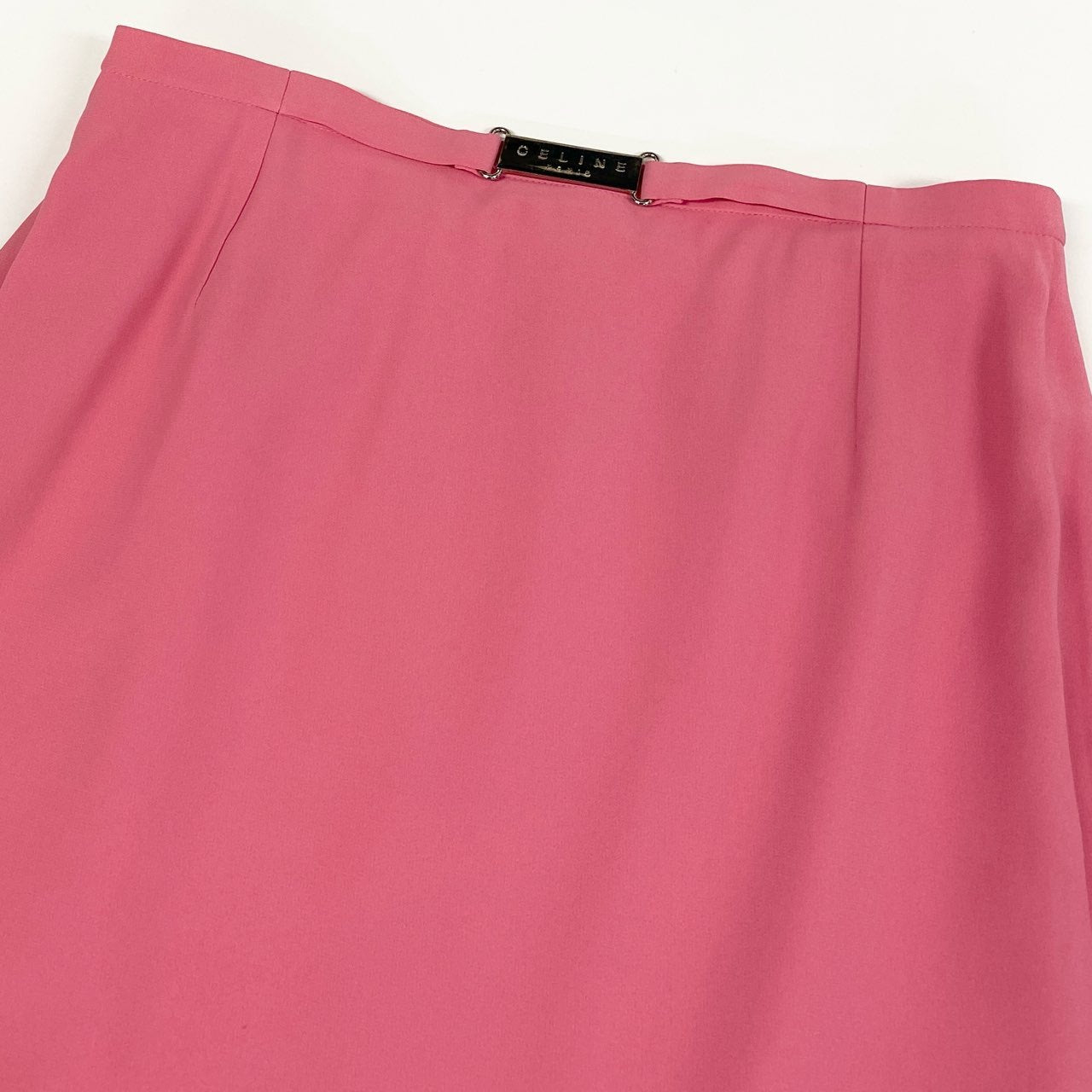 落ち着きのあるローズピンク(ダスティピンク寄り)の無地デザインが上品なセリーヌのタイトスカートです。しなやかでマットな質感の生地が滑らかなラインを描き、シンプルながらも高級感を感じさせます。ウエスト背面にはCELINEロゴ入りのメタルパーツがさりげないアクセントに。ジャケット合わせのオフィススタイルから、華やかなトップスとのきれいめコーデまで幅広く活躍する一着です。