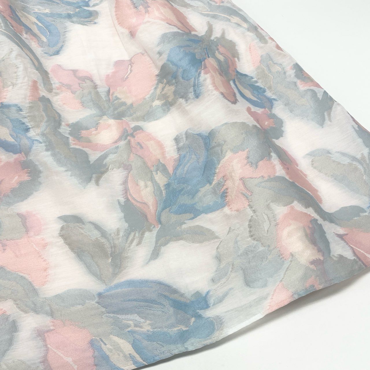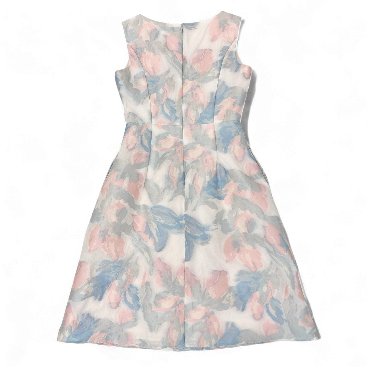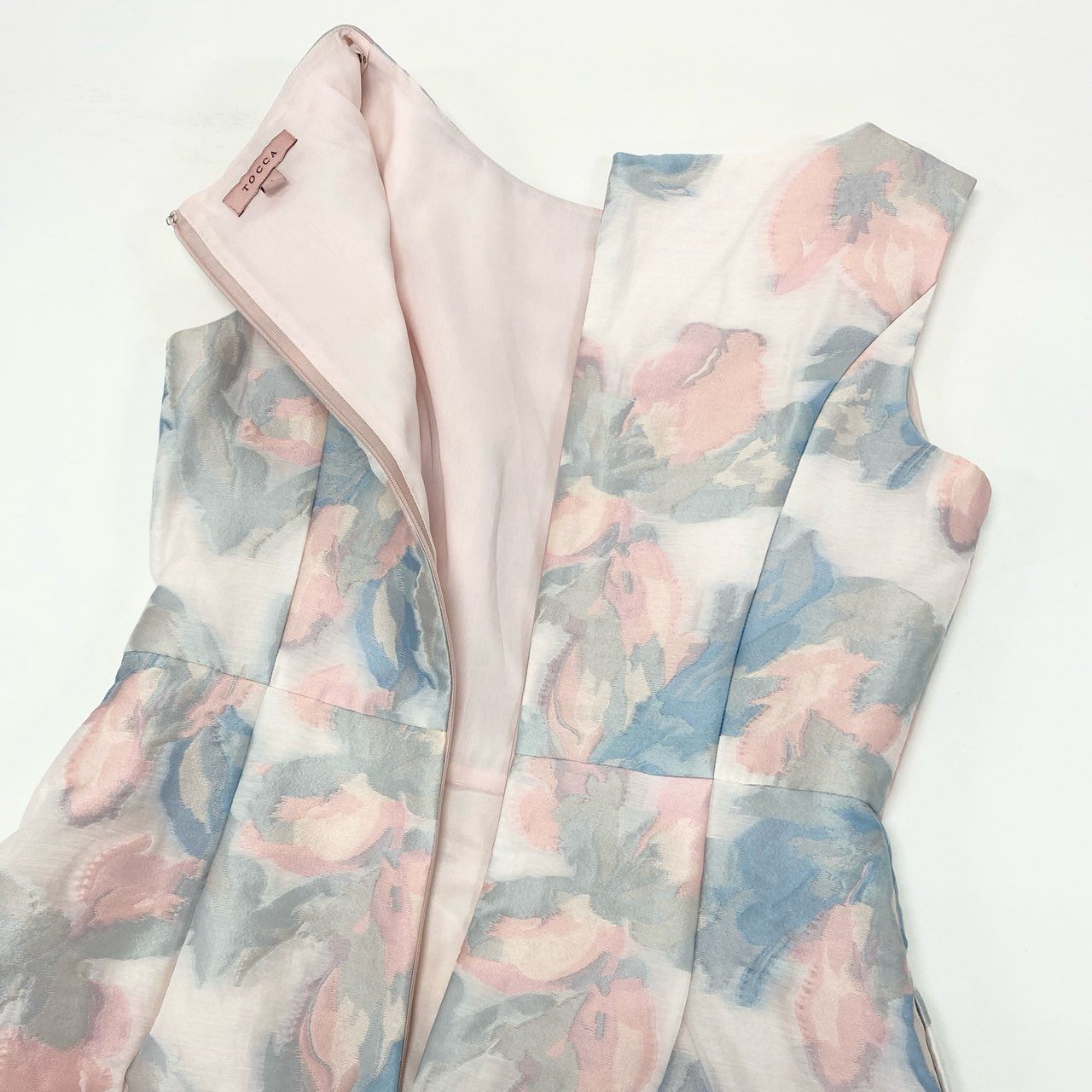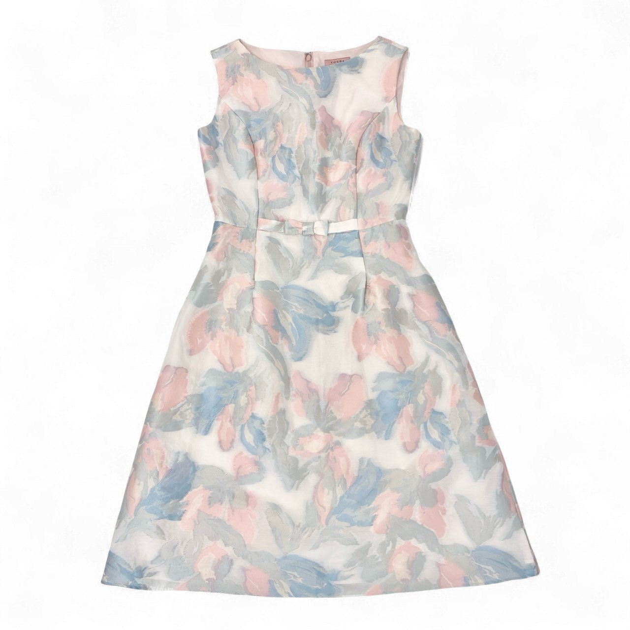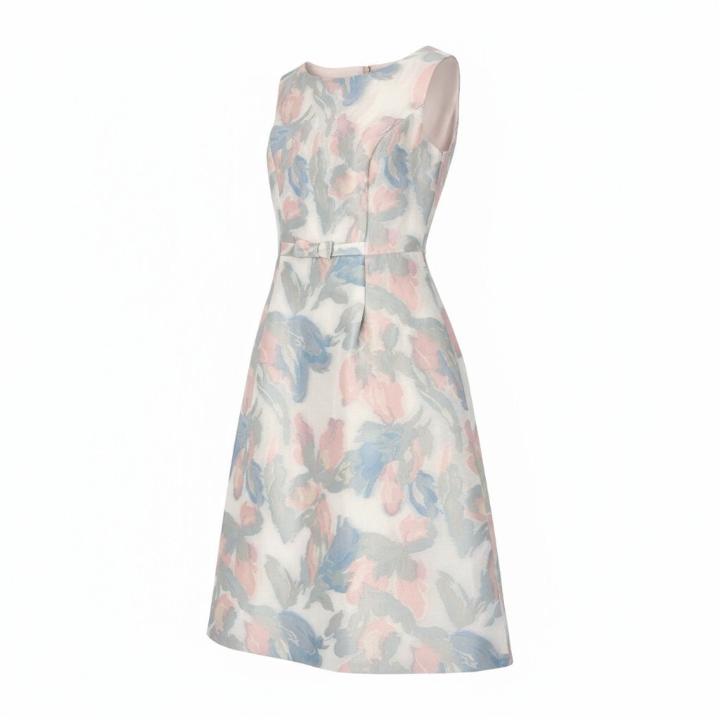 TOCCA「MOONLIGHT」シリーズのノースリーブワンピース(22AW)。アイボリー地に、サックスブルー・ピンク・グレーの淡い花柄ジャガードが施され、柔らかく上品な印象を演出します。ウエストには同色ベルト風の切替が入り、スタイルをすっきり見せるデザイン。ジャガード特有の立体感ある素材が華やかさを引き立て、動くたびに表情が生まれる一着です。さらにウォッシャブル対応のため、お手入れがしやすくデイリーからセレモニーまで幅広く活躍します。