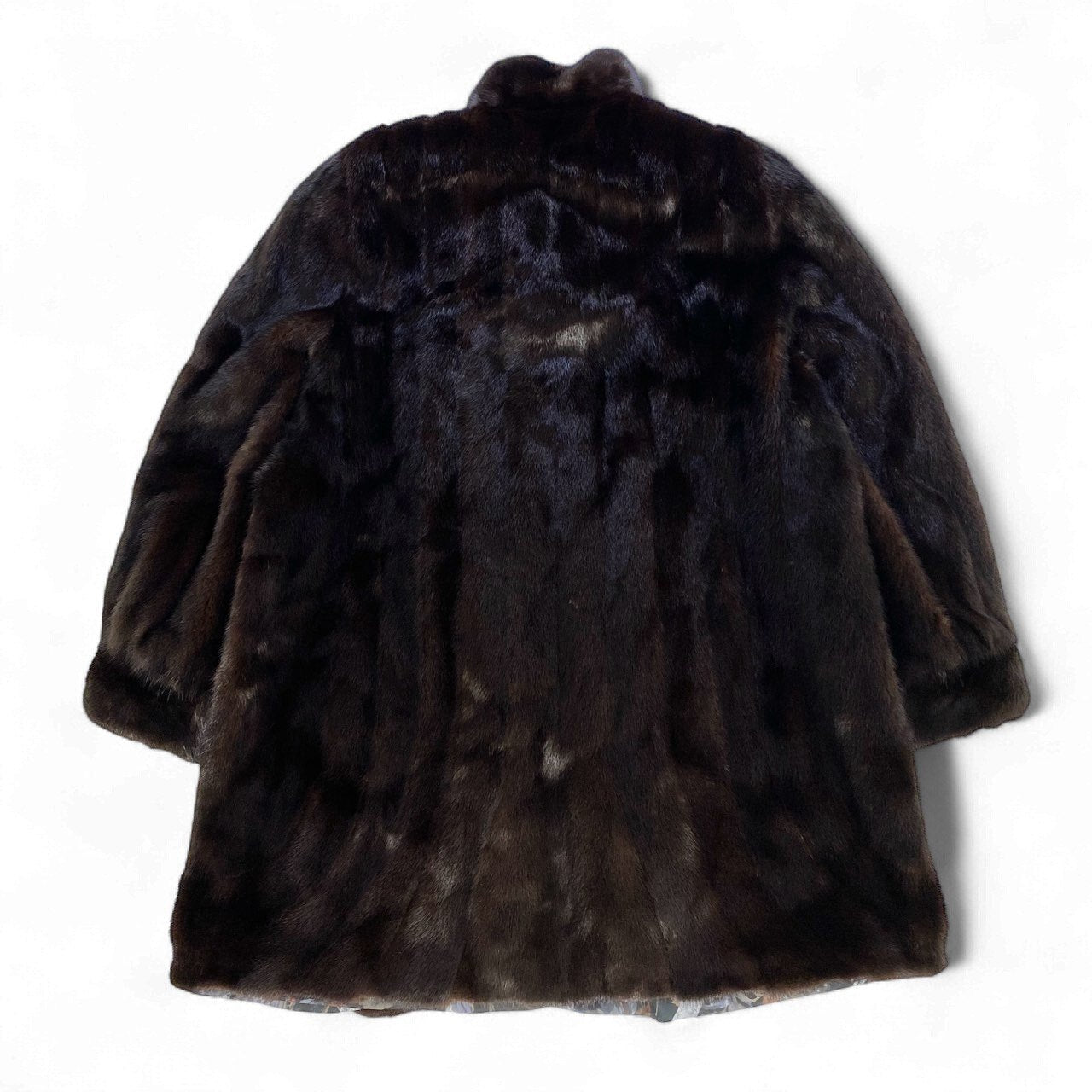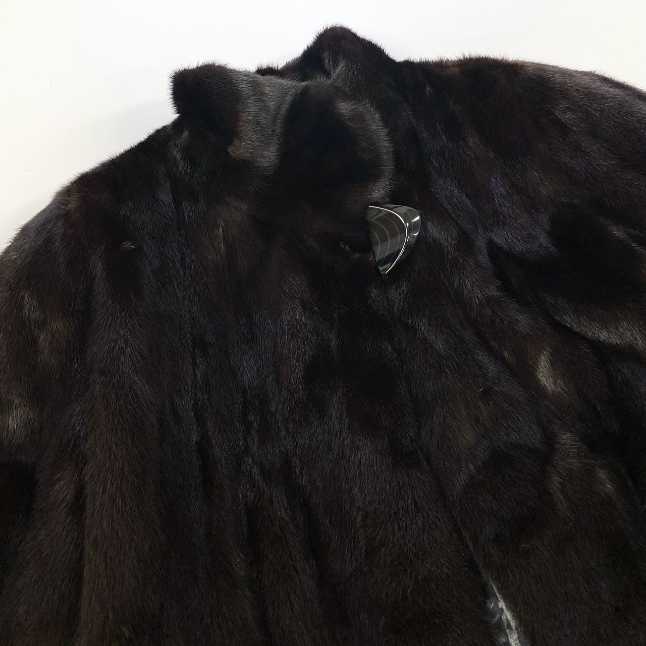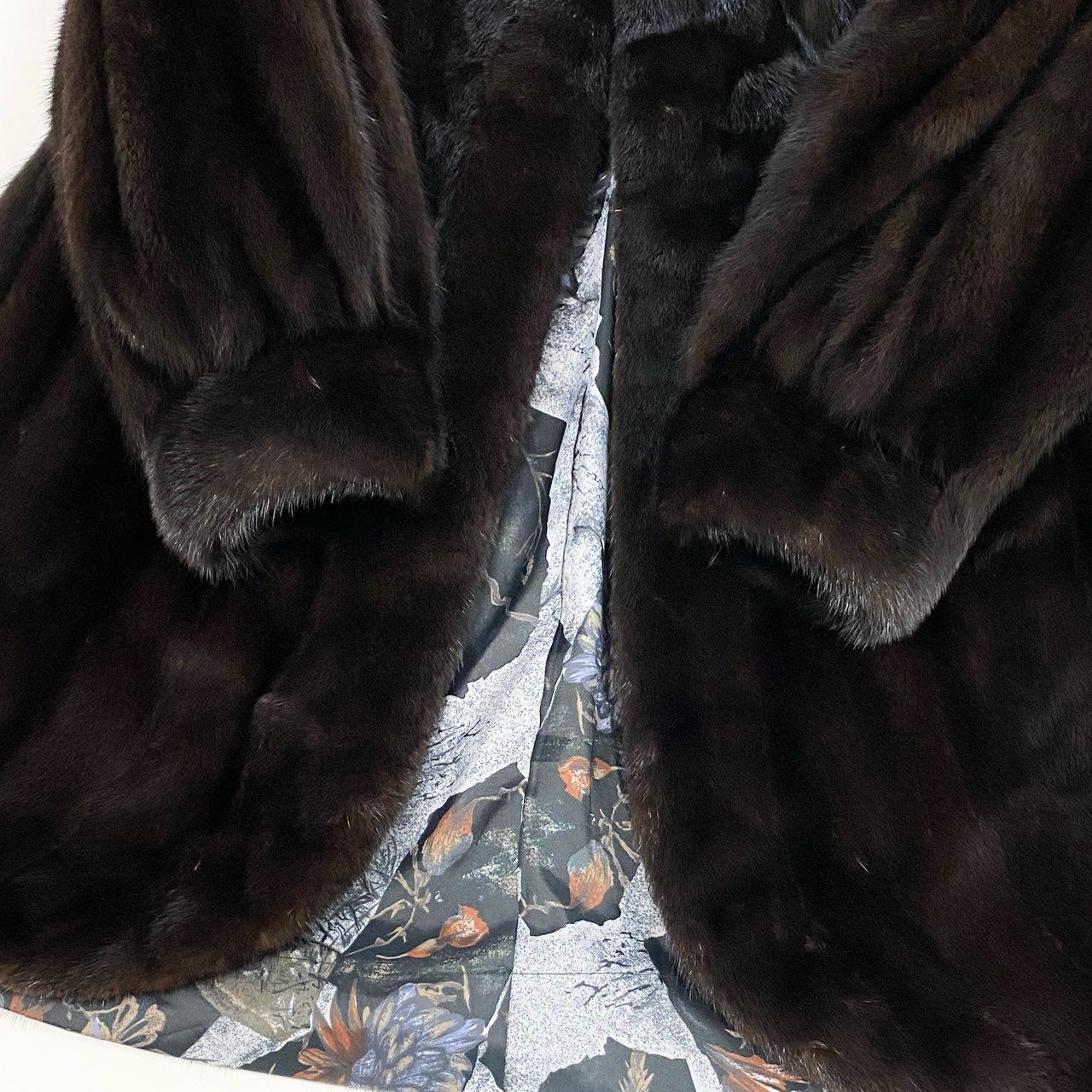 深みのあるダークブラウン(マホガニーミンク)が上品に輝く、EMBAならではの高級ファーコートです。ミンク特有の密度のある毛並みと自然な光沢が美しく、しっとりと柔らかな触感が魅力。フロントの装飾ボタンがアクセントとなり、開けても閉めてもバランスの良いデザインです。裏地は総柄仕様で、脱いだ瞬間までラグジュアリーさを感じさせる仕立て。フォーマルシーンはもちろん、冬のお出かけをエレガントに格上げする一着です。