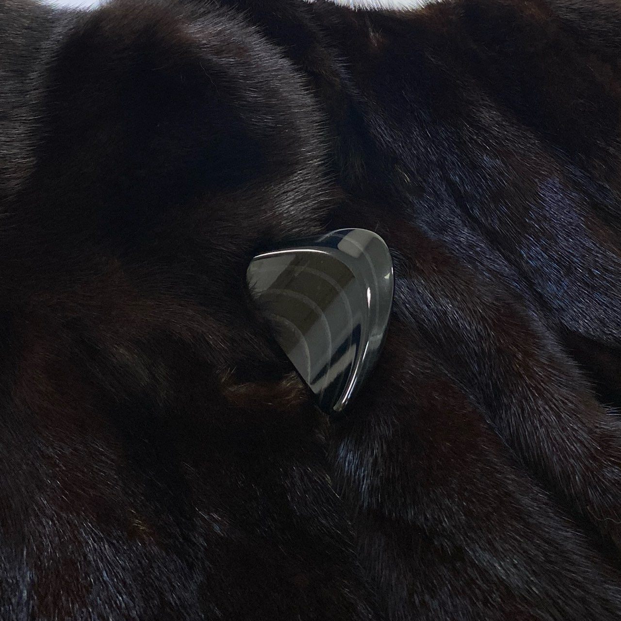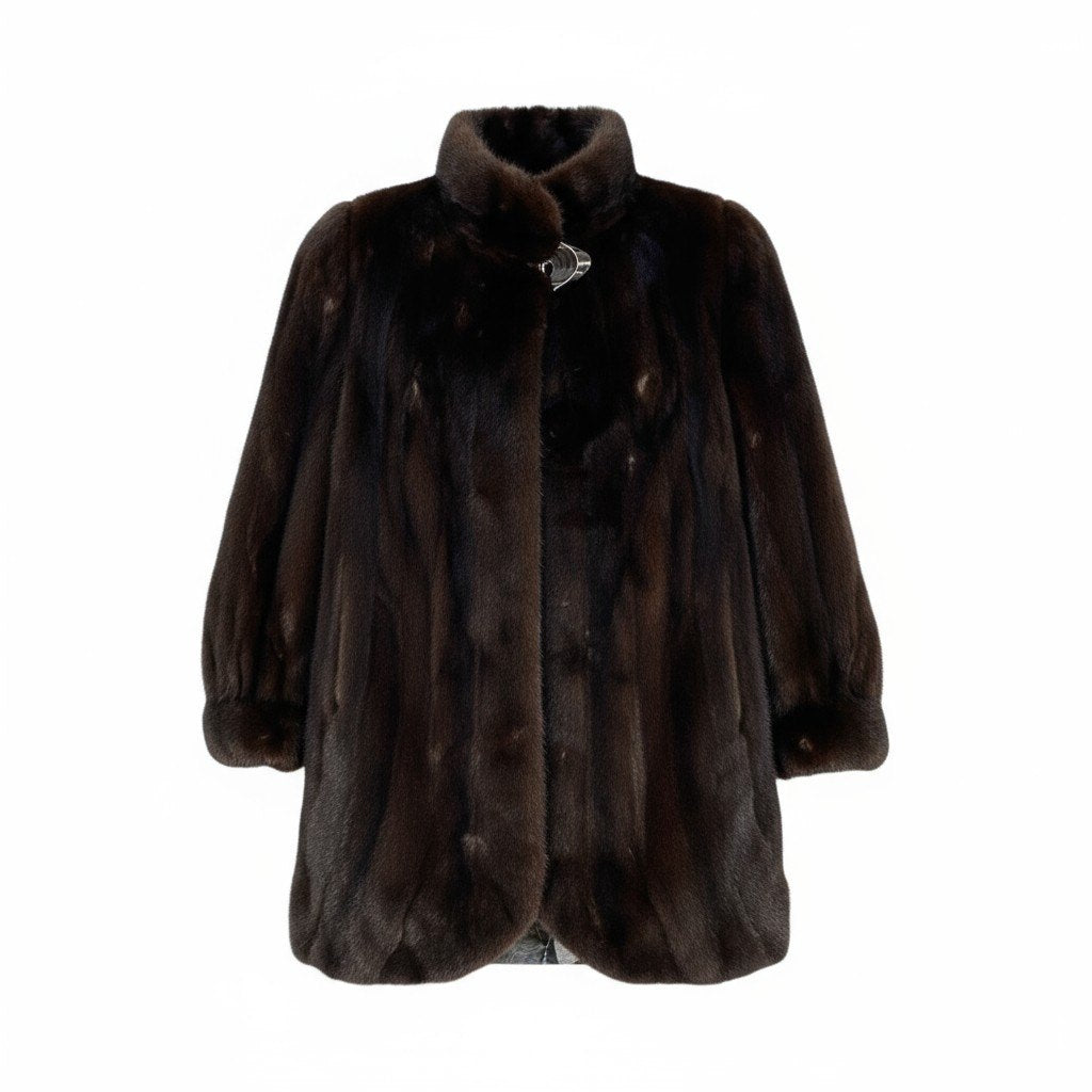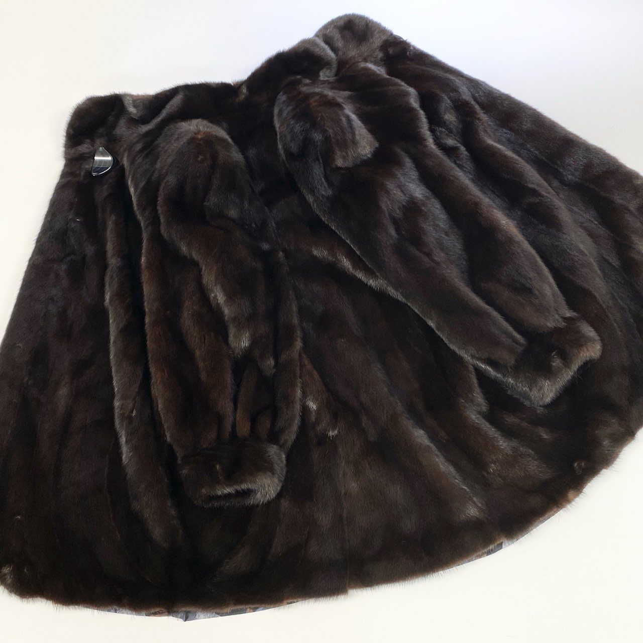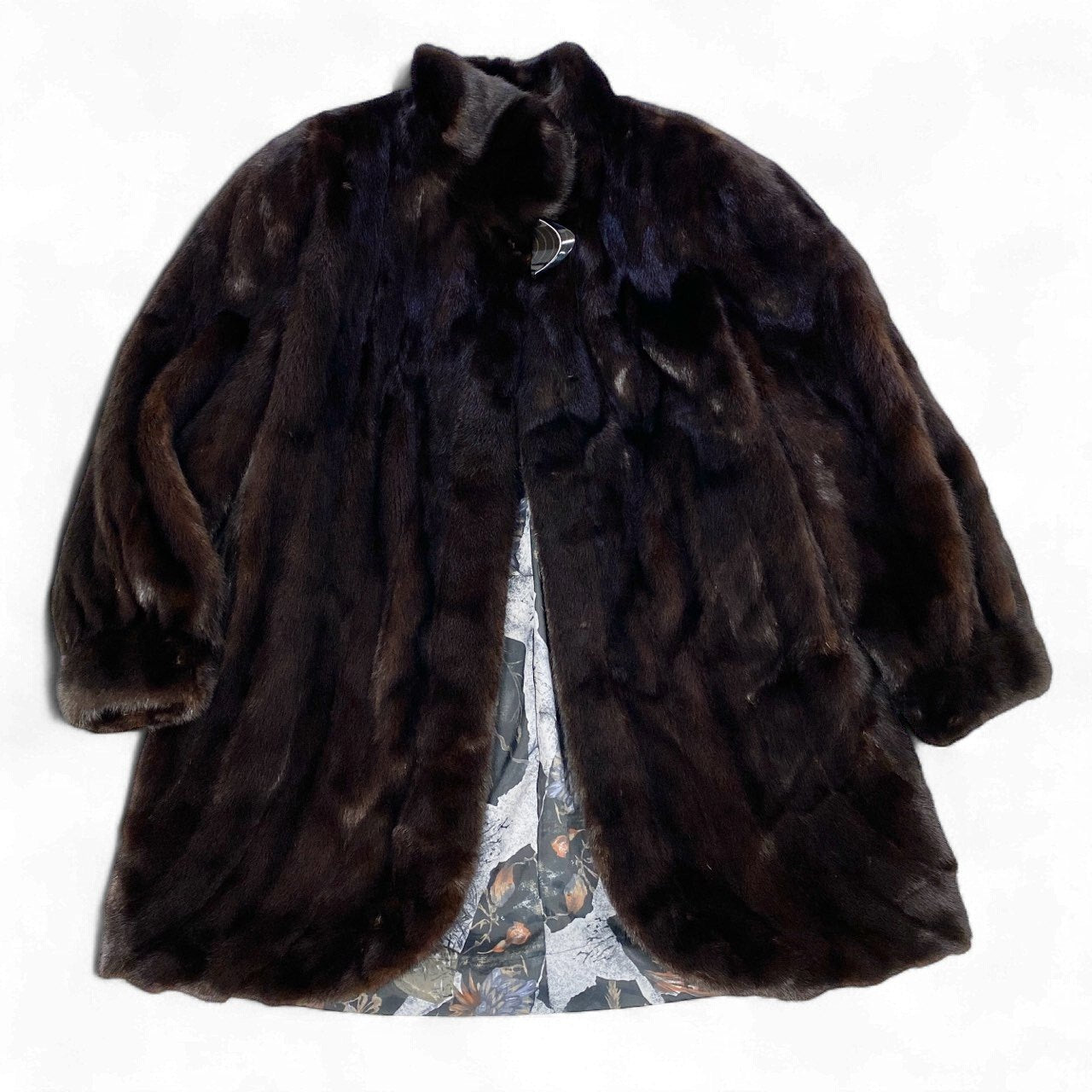 深みのあるダークブラウン(マホガニーミンク)が上品に輝く、EMBAならではの高級ファーコートです。ミンク特有の密度のある毛並みと自然な光沢が美しく、しっとりと柔らかな触感が魅力。フロントの装飾ボタンがアクセントとなり、開けても閉めてもバランスの良いデザインです。裏地は総柄仕様で、脱いだ瞬間までラグジュアリーさを感じさせる仕立て。フォーマルシーンはもちろん、冬のお出かけをエレガントに格上げする一着です。