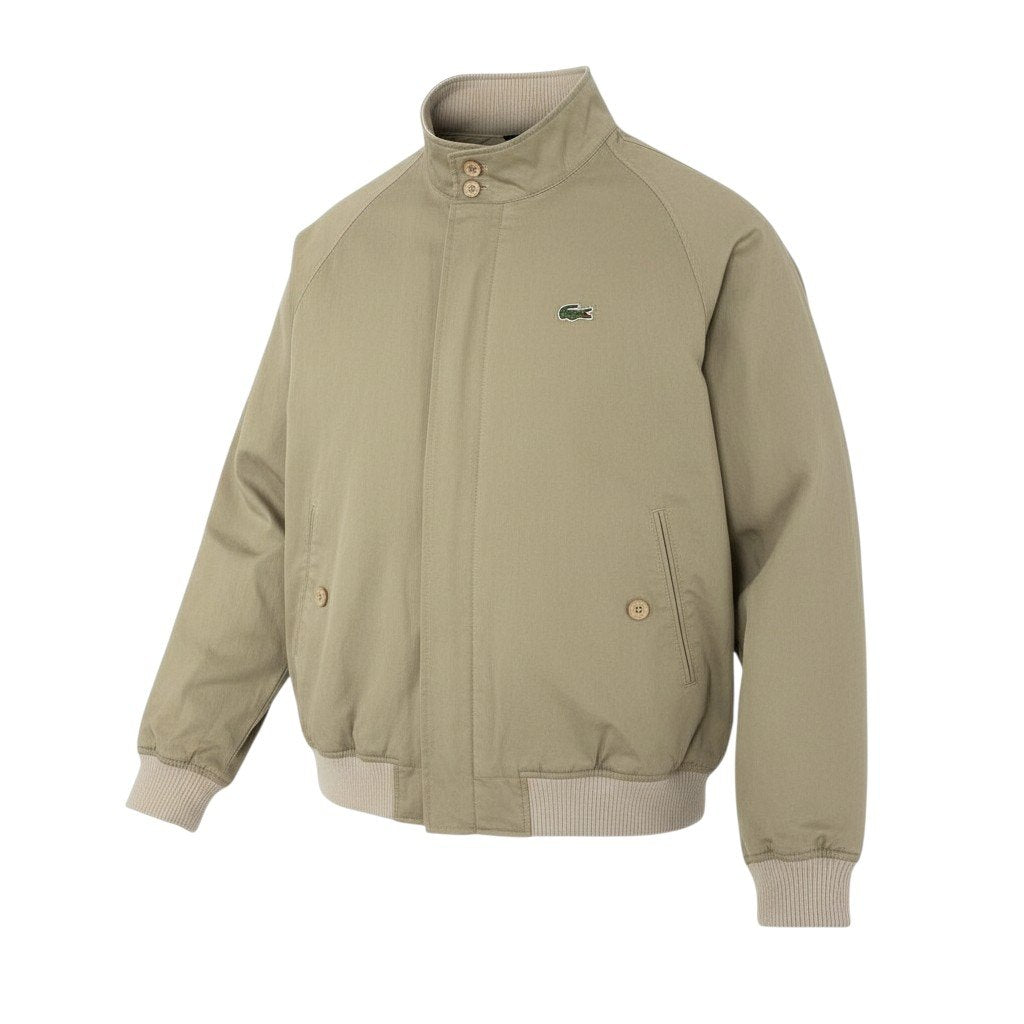 ラコステ × ビームス別注のハリントンスウィングトップジャケットです。色味は落ち着いたベージュで、無地のソリッドな表情に胸元のワニワッペンと背面のビッグワニロゴがアクセント。マットでハリのあるコットン主体の素材感に、ダブルジップ仕様で着こなしの幅が広がります。カジュアルからきれいめまで合わせやすく、通勤や街着、旅行にも活躍する一着です。