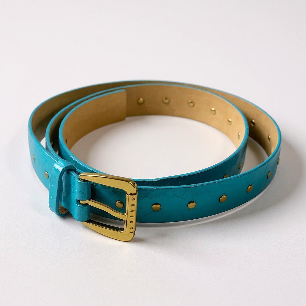 CELINEらしい洗練と遊び心を感じるレディースベルト。 鮮やかなターコイズブルーの艶やかな光沢感のあるレザーに、ゴールドトーンのメタルバックルを組み合わせた華やかなデザインです。 表面は光沢のあるレザー素材で、無地ながら存在感のあるカラーがスタイリングのアクセントになります。 シンプルな装いにプラスするだけで、カジュアルからきれいめコーデまで印象を引き締めてくれる一本です。