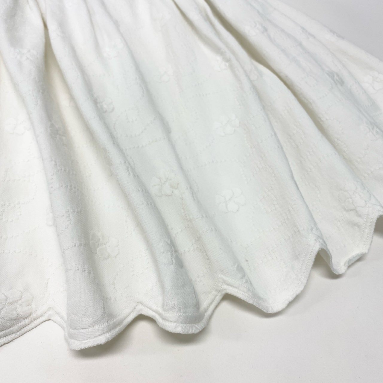 アイボリーホワイトのやわらかなニット素材に、立体感のあるカメリア柄ジャガードをあしらった上品な一着。ウエスト部分にはシルバートーンのココマークボタンが輝き、さりげないラグジュアリー感を演出します。 毛足の短いマットなニット素材で、柔らかく温かみのある質感。ふんわりと広がるフレアシルエットが女性らしい印象を与えます。 無地に見えながらも織り柄が映えるデザインで、シンプルなトップスと合わせるだけでコーデが完成。 デイリーからきれいめスタイルまで幅広く活躍する、エレガントなニットスカートです。