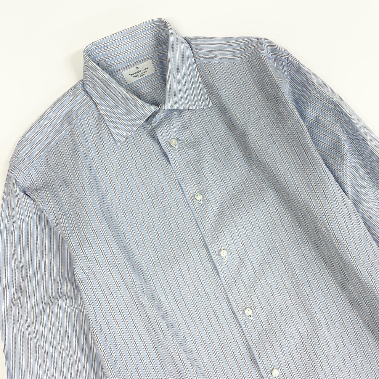 31k2《美品》 Ermenegildo Zegna エルメネジルドゼニア 長袖 ドレスシャツ ストライプ ビジネス フォーマル 41 Lサイズ相当 ブルー コットン メンズo07t