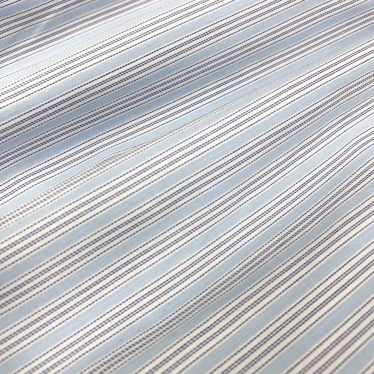 淡いサックスブルーに細いホワイトストライプ柄が爽やかな印象を与えるErmenegildo Zegnaのドレスシャツです。上質なコットン素材を使用し、さらりとした肌触りと軽やかな着心地が特徴。やや光沢のある生地が高級感と清潔感を演出します。クラシックなレギュラーカラーと控えめなディテールで、スーツスタイルにもオフィスカジュアルにも最適な一着です。
