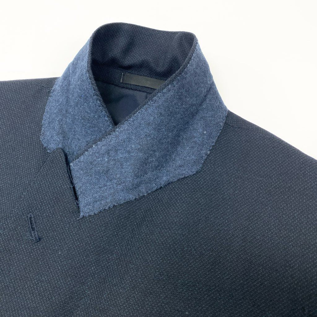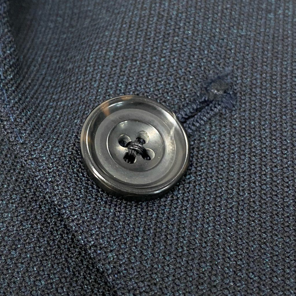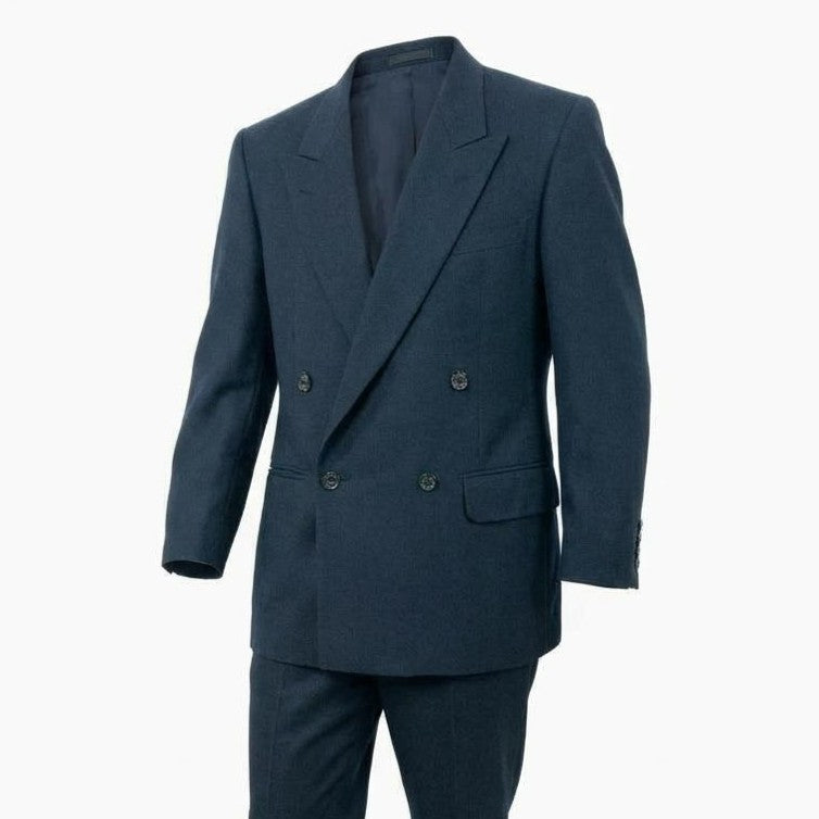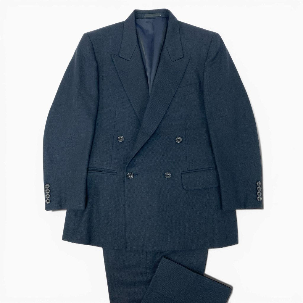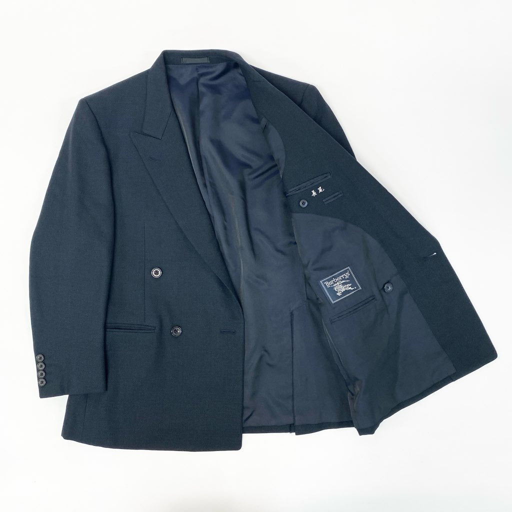 落ち着いたダークネイビー系カラーに、無地調(織りで表情のある)デザインが上品なスーツセットアップ。マットで張りのあるウール系素材感が、端正なダブルブレストのシルエットを際立たせます。クラシックなフラップポケットやボタン配置など、正統派ディテールが魅力。BURBERRYらしい品格があり、通勤・商談・フォーマルシーンまで幅広く活躍する一着です。