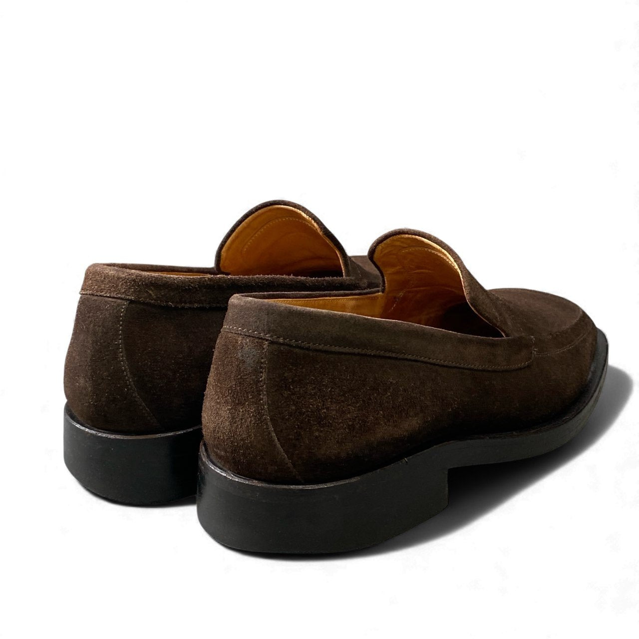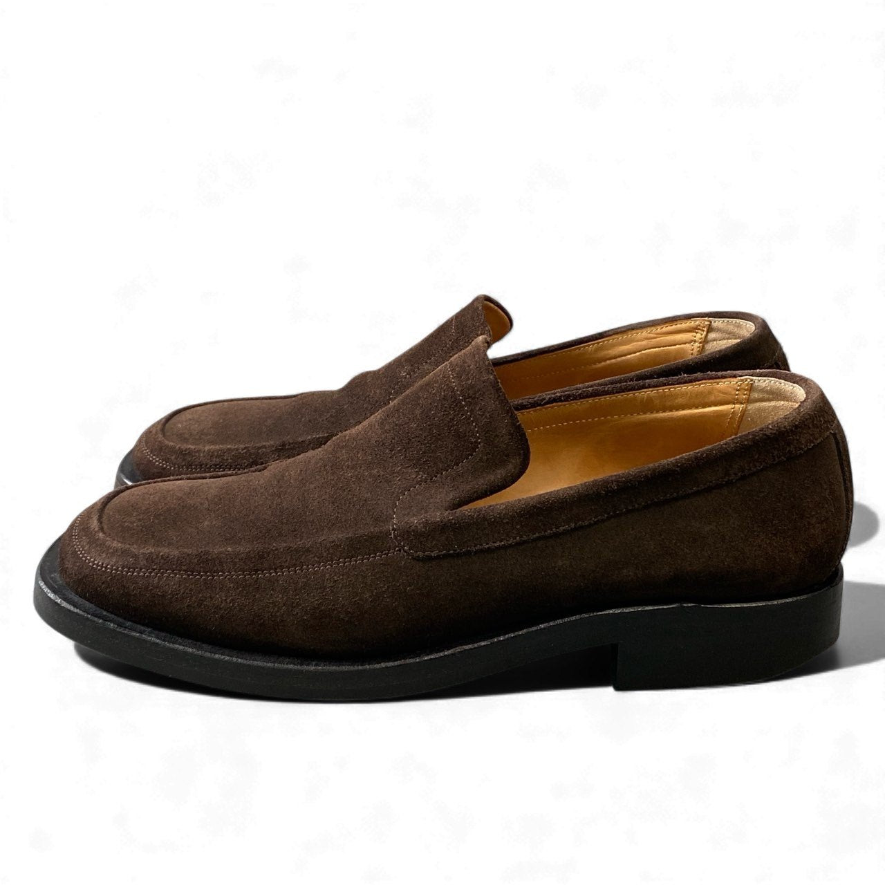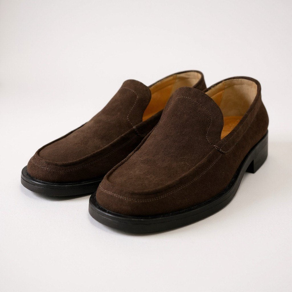 エルメスらしい端正な佇まいが魅力の、ブラウンスエードレザーローファーです。深みのあるブラウンカラーと、マットで上質なスエード素材が落ち着いた高級感を演出します。装飾を抑えたミニマルなデザインで、ビジネスカジュアルから休日のきれいめスタイルまで幅広く対応。レザーソール特有の品のある履き心地で、大人の足元にふさわしい一足です。