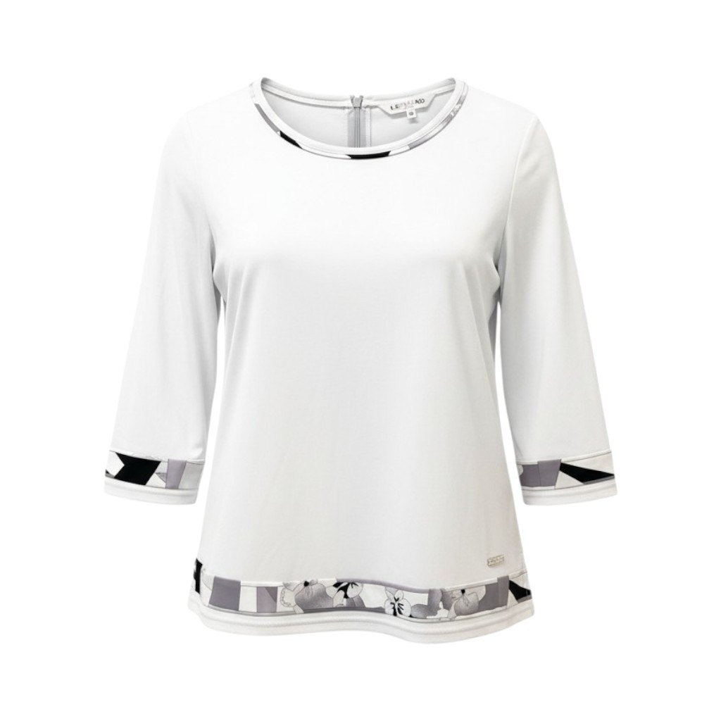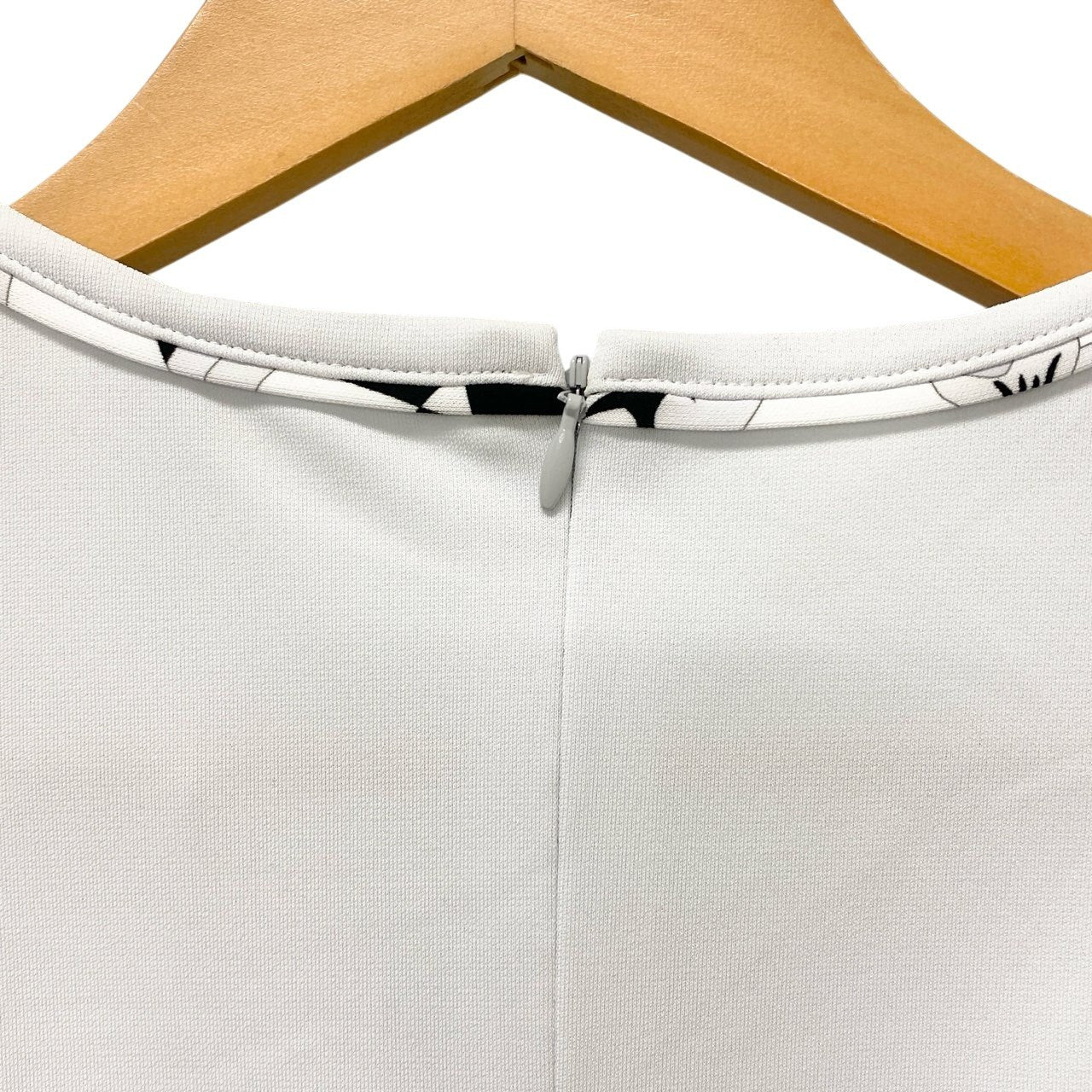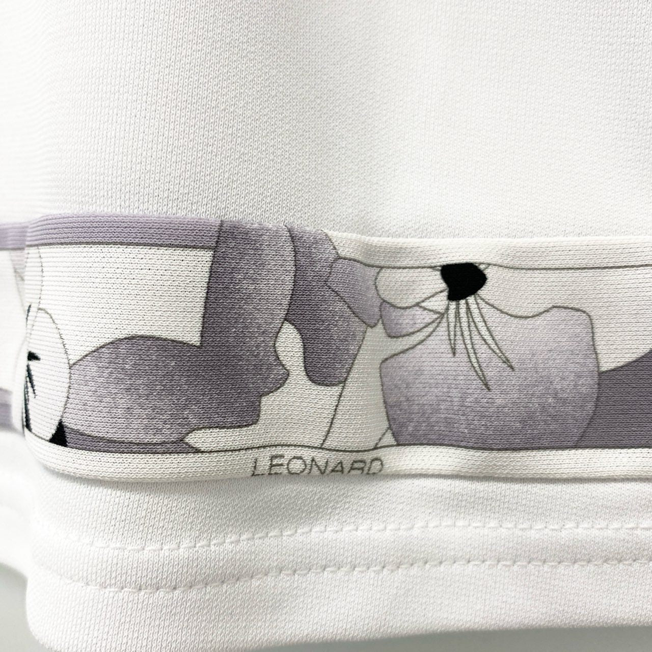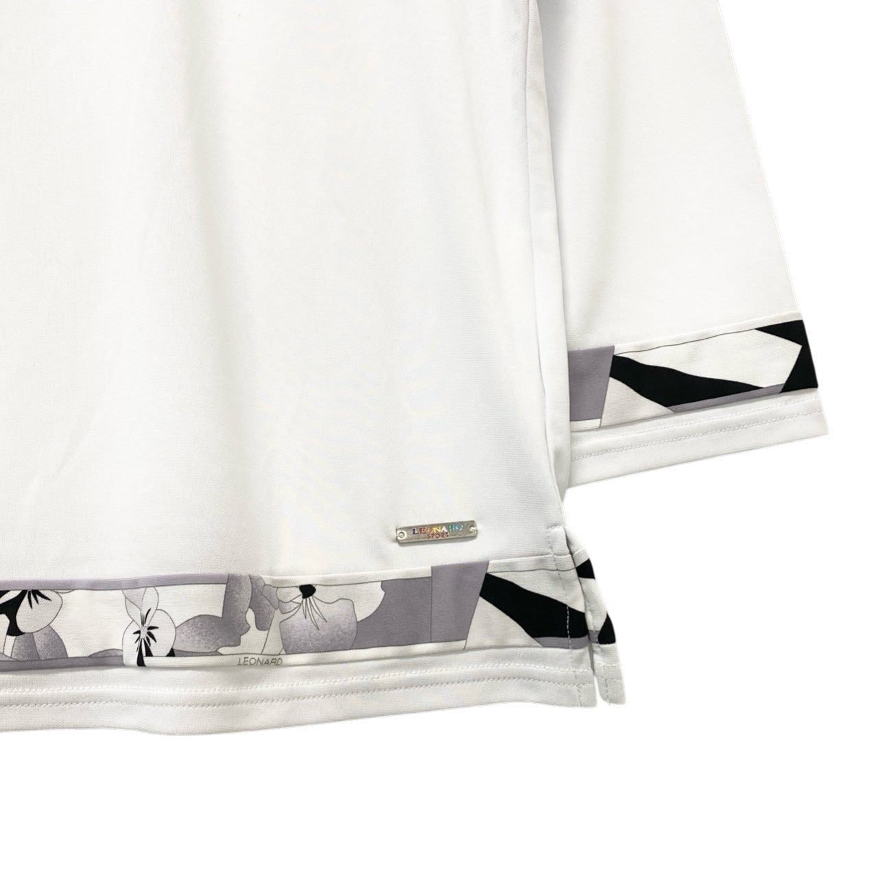 オフホワイトを基調とした上品な無地デザインに、袖口と裾にモノトーンの幾何学×フラワーパターン切替が施された一着です。 なめらかで落ち感のある素材が、きれいめな印象を演出。 シンプルながらもレオナールらしい柄使いがアクセントになっています。 通勤スタイルやきれいめカジュアルにも活躍する、着回し力の高い七分袖トップスです。