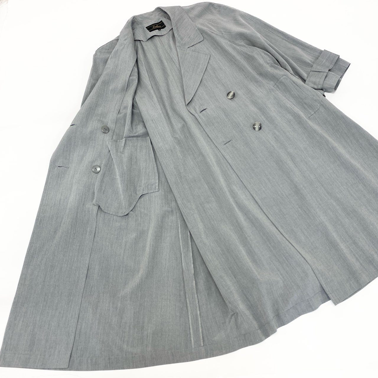 上品なライトグレーのベルテッドトレンチコート。マットでしなやかなシルク素材が特徴で、自然な光沢感とドレープが大人の女性らしさを演出します。ダブルボタンとウエストベルトでシルエット調整ができ、羽織るだけで洗練された印象に。軽やかな着心地ながら、通勤やフォーマルシーンにも対応できる万能な一着です。