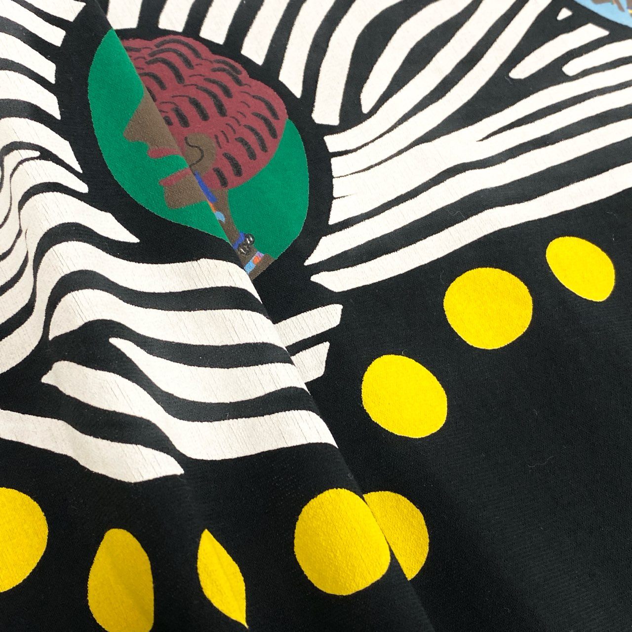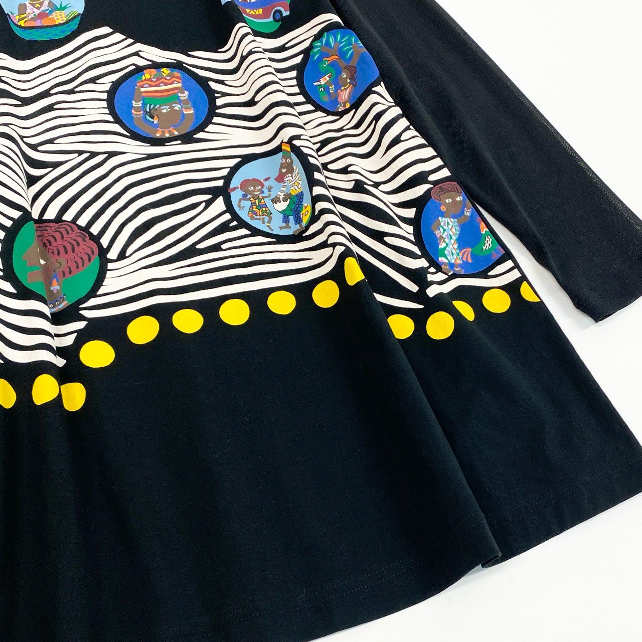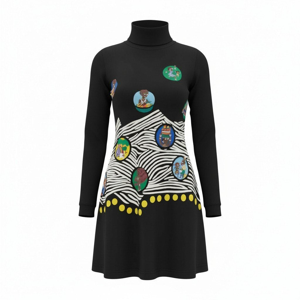 ブラックをベースに、カラフルな丸型イラストとホワイト×ブラックのゼブラ柄を組み合わせた、TOKUKO 1er VOL らしい遊び心あふれるチュニックワンピースです。胸下から広がるAラインにより、動きに合わせてフレアが揺れる軽やかなシルエットが魅力。ハイネック仕様で首元まで暖かく、季節感のあるスタイルが1枚で完成します。個性的なグラフィックデザインはコーデの主役になり、お出かけ・イベント・デイリーまで幅広く活躍するアイテムです。