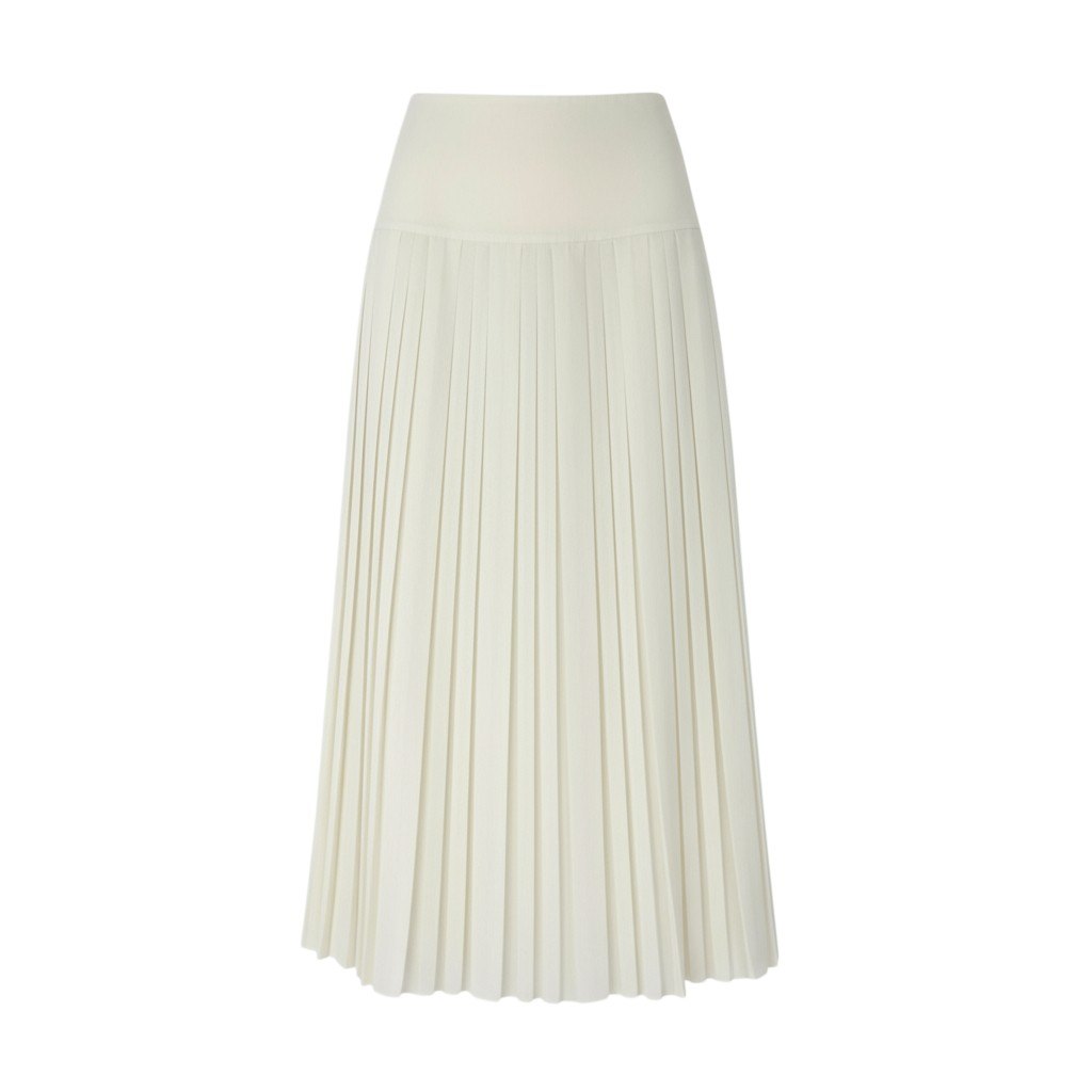 ザ・ロウらしいミニマルで洗練された佇まいが魅力の、アイボリーカラーのプリーツスカートです。繊細に落ちるプリーツが美しい縦ラインをつくり、動くたびにドレープが軽やかに揺れる上品な一枚。無駄のないすっきりとしたウエストデザインで、トップスをインしてもアウトでもバランスが取りやすいシルエットです。シンプルながら存在感があり、ニットやシャツ、ジャケットとも相性抜群。デイリーからオケージョンまで幅広く活躍する、ワードローブに加えたいアイテムです。