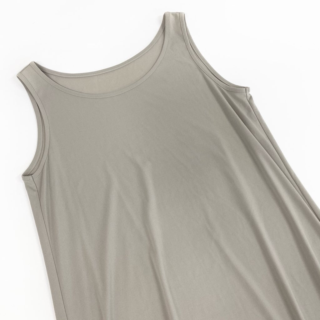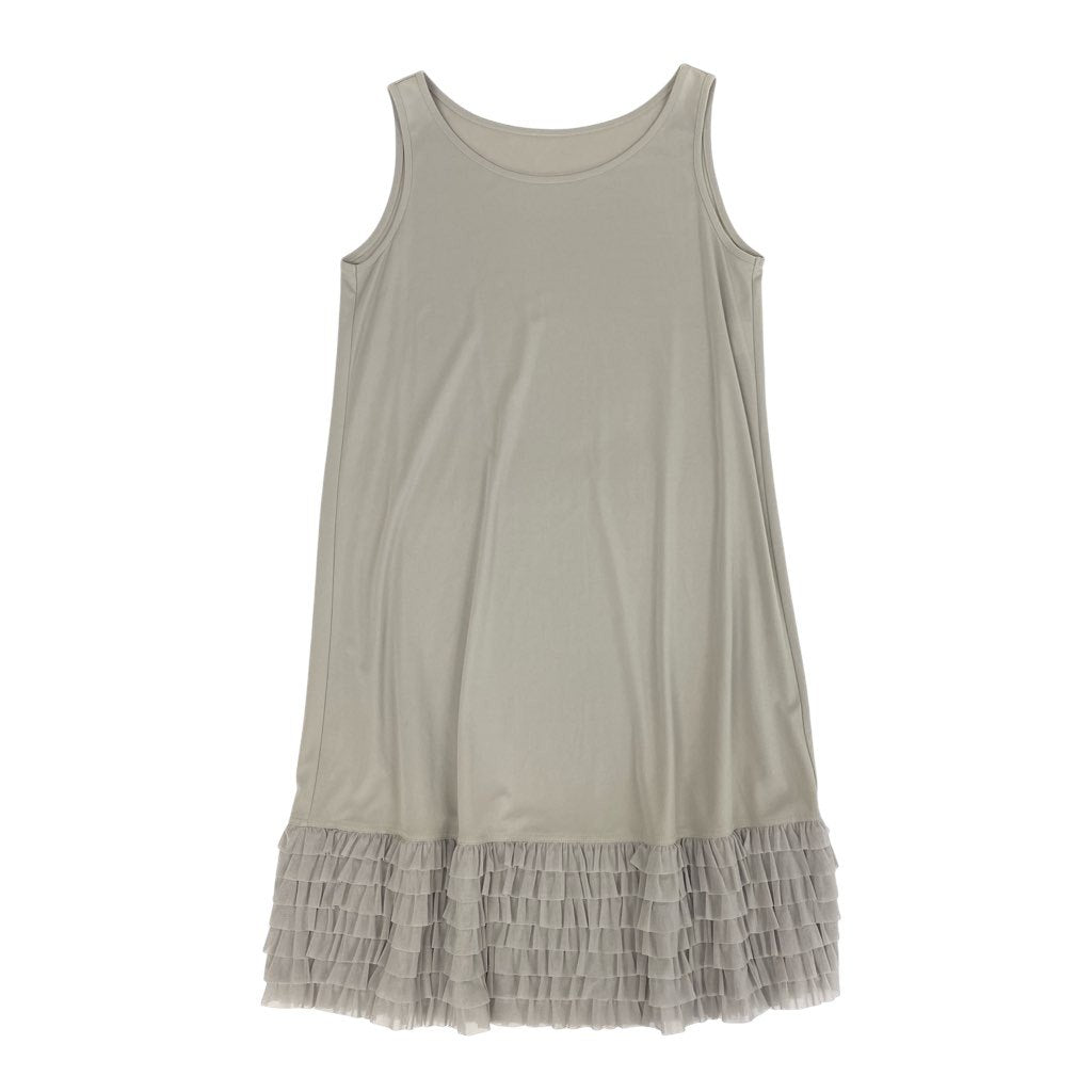 落ち着いたライトグレージュカラーの無地デザインが上品なノースリーブワンピースです。素材はマットな質感のストレッチカットソーで、なめらかな落ち感と快適な着心地が魅力。裾には多段フリル装飾が施され、シンプルながら女性らしいアクセントをプラスしています。カーディガンやジャケットを合わせれば季節を問わず着用可能。**トクコプルミエヴォル**らしい上品さと可愛らしさを兼ね備えた一着です。