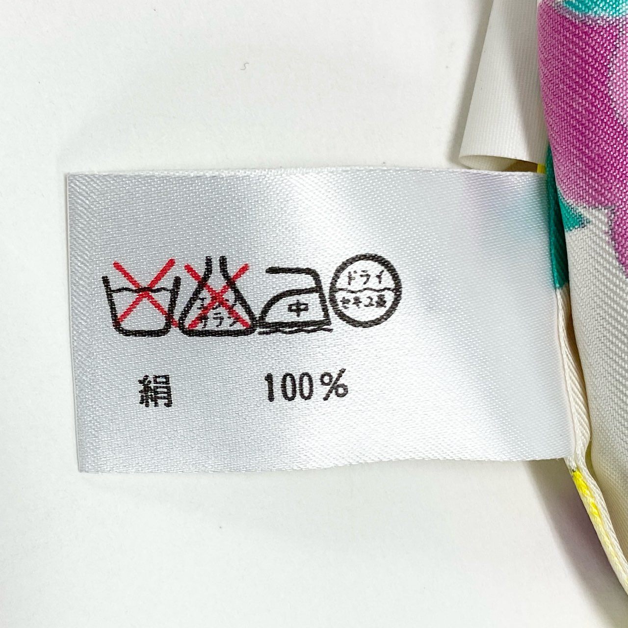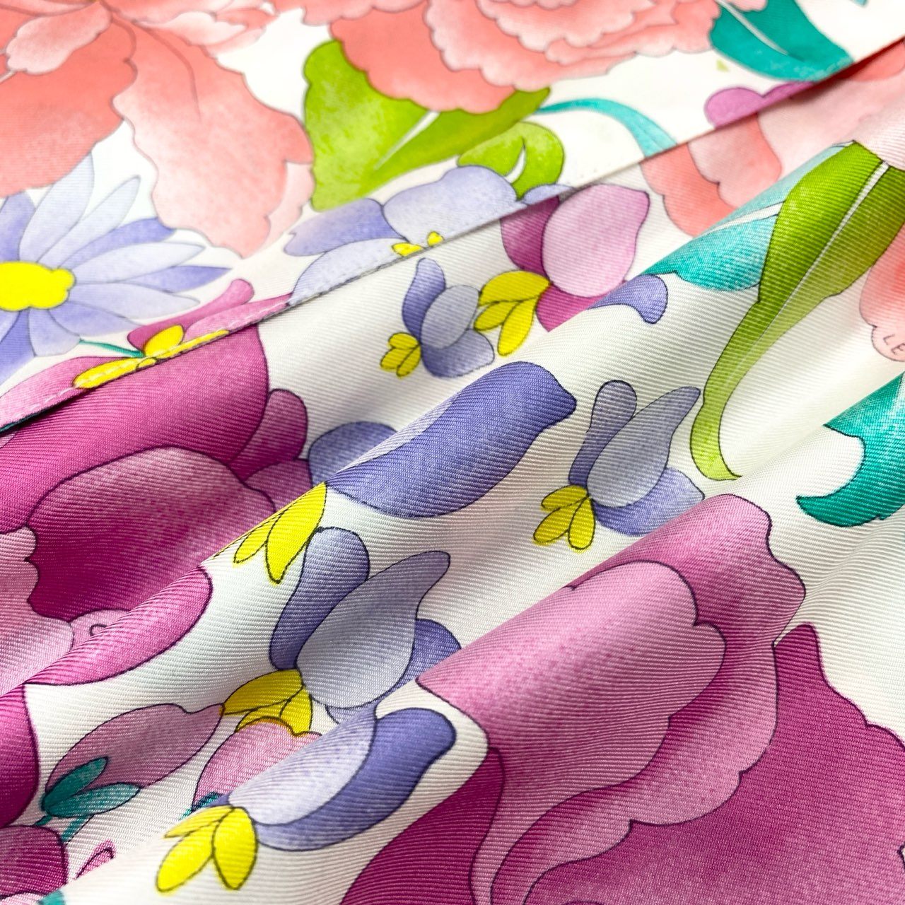 レオナールらしい華やかなフローラルプリントが主役の、シルク100%ロングコートです。白地にピンク・パープル・ブルー・グリーンが混ざる彩度の高い花柄が美しく、上品な光沢を放つシルク素材が動くたびに柔らかく揺れます。ダブルブレストのフロントとウエストベルトがメリハリのあるシルエットをつくり、ワンピースにもパンツスタイルにも映える一枚。春の羽織りやリゾート・お食事会など華やかなシーンにもぴったりのアイテムです。