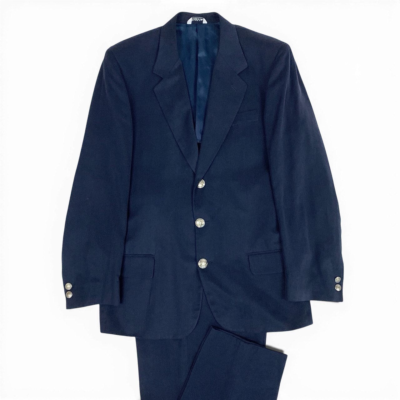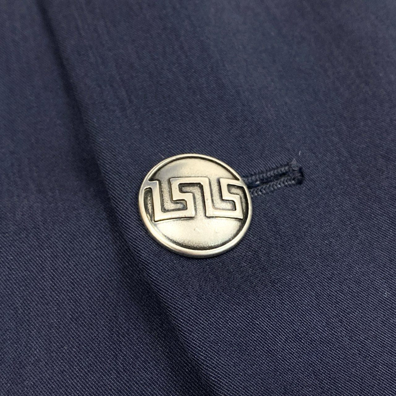 深みのあるミッドナイトネイビーが印象的なヴェルサーチのセットアップスーツです。 無地デザインに、ブランド刻印入りのメタルボタンがさりげないアクセントとして映えます。 シルク混ならではのなめらかな質感と上品な光沢があり、フォーマルすぎず洗練された雰囲気を演出。 ビジネスシーンはもちろん、式典や少し格を上げたい会食など幅広い場面で活躍する一着です。