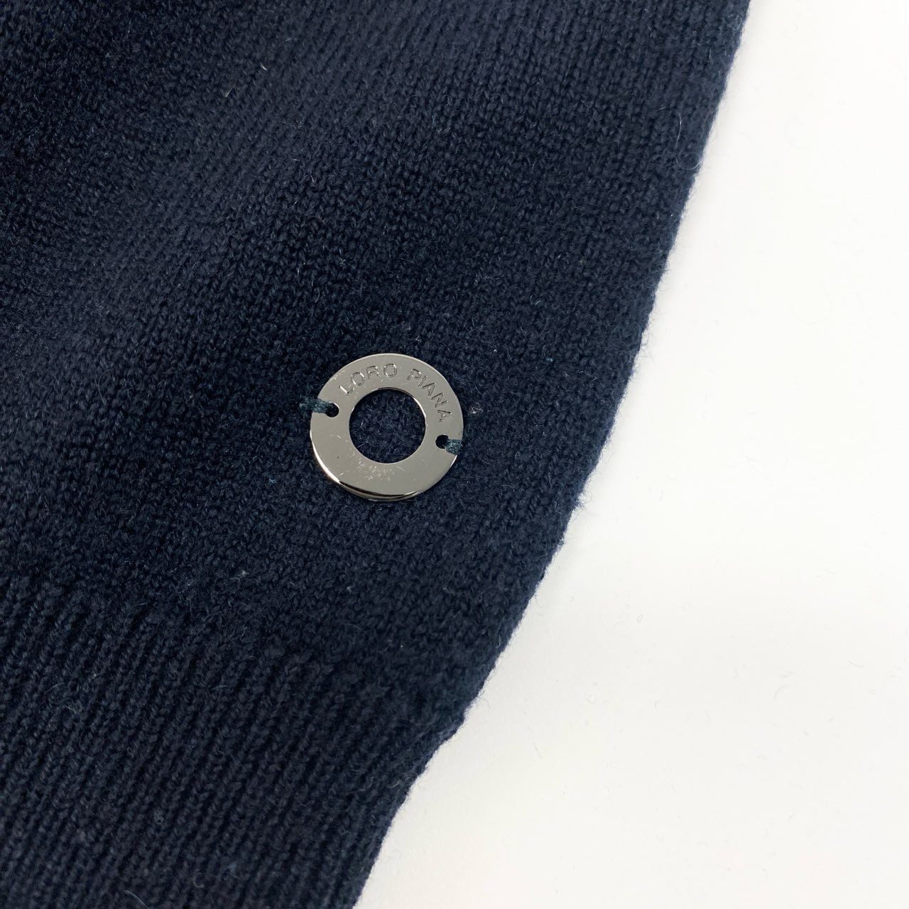 Loro Piana(ロロピアーナ)の上質なクルーネックニットセーターです。色は深みのある「ミッドナイトネイビー」をベースに、柔らかな「アイボリー」のボーダー柄を配した上品なマリンデザイン。素材は毛足の短い柔らかいウール系ニットで、しっとりとした高級感のある肌触りが特徴です。裾にはさりげないブランドメタルパーツを備え、シンプルながら洗練された印象に仕上がっています。カジュアルからきれいめまで幅広いコーデに活躍する永く愛用できる一着です。