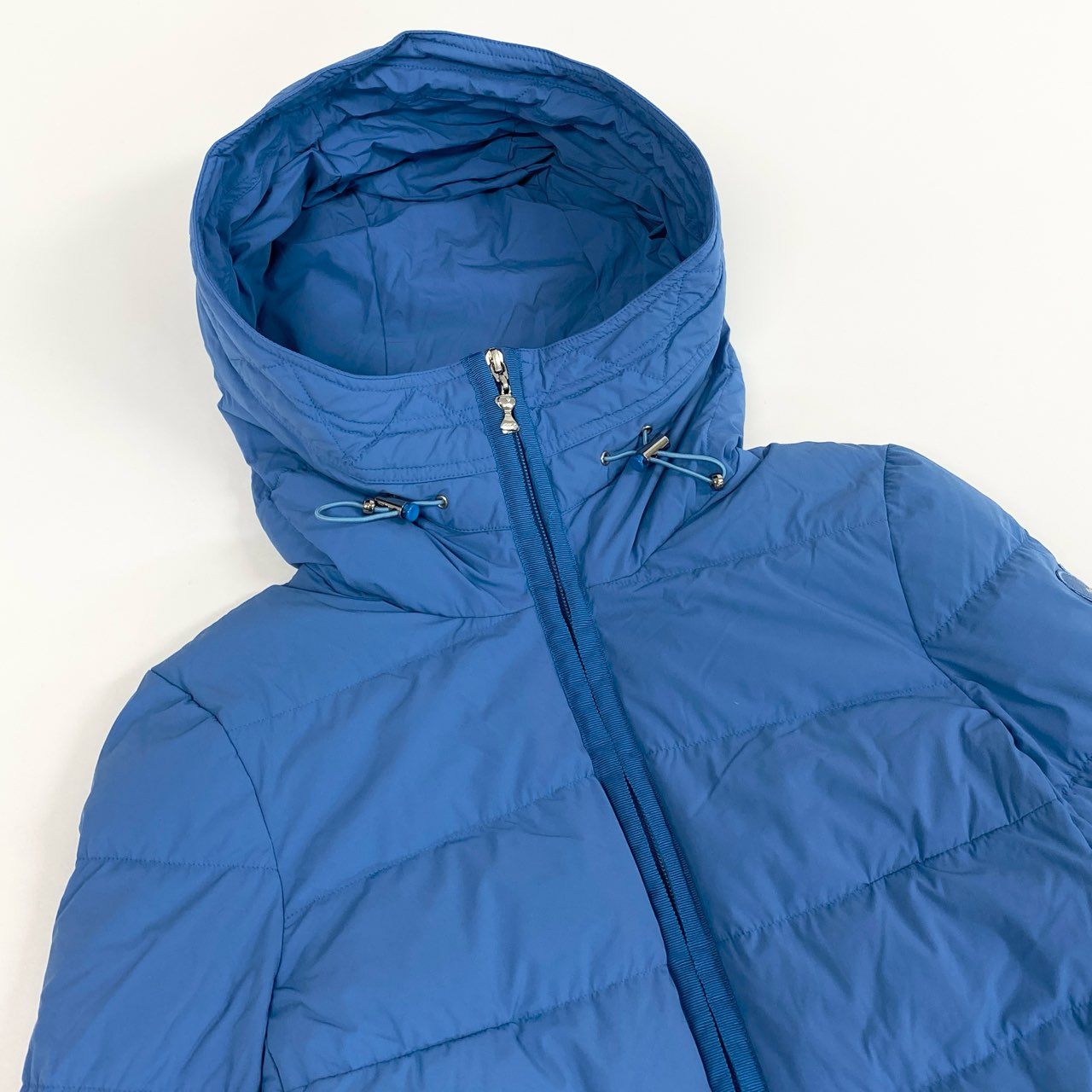 エムズグレイシーらしいフェミニンなシルエットが魅力の、ブルーカラーのペプラムショートダウンジャケットです。無地デザインに、ウエスト切り替えのペプラムラインとフード付き仕様が上品なアクセントになっています。素材はマットな質感のナイロン系生地で、軽やかさと実用性を両立。ボリュームを抑えたダウン仕様で着膨れしにくく、スカートやワンピースと好相性のため、通勤やお出かけなどきれいめカジュアルに活躍する一着です。