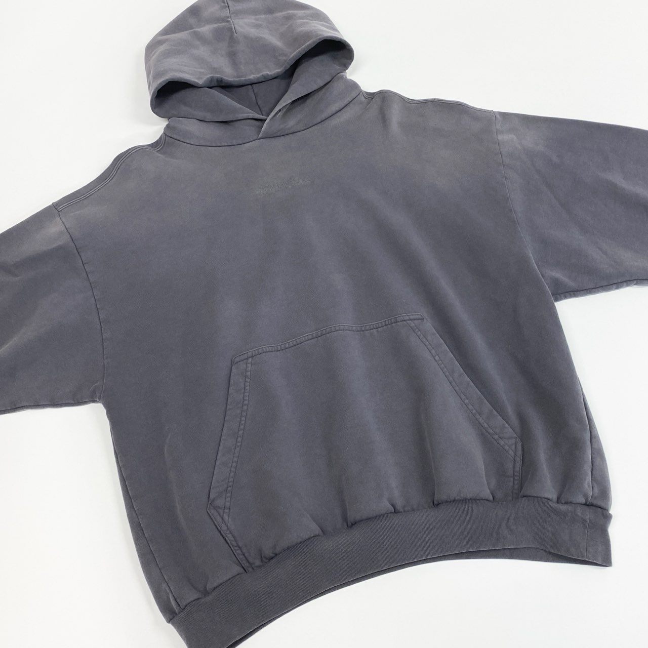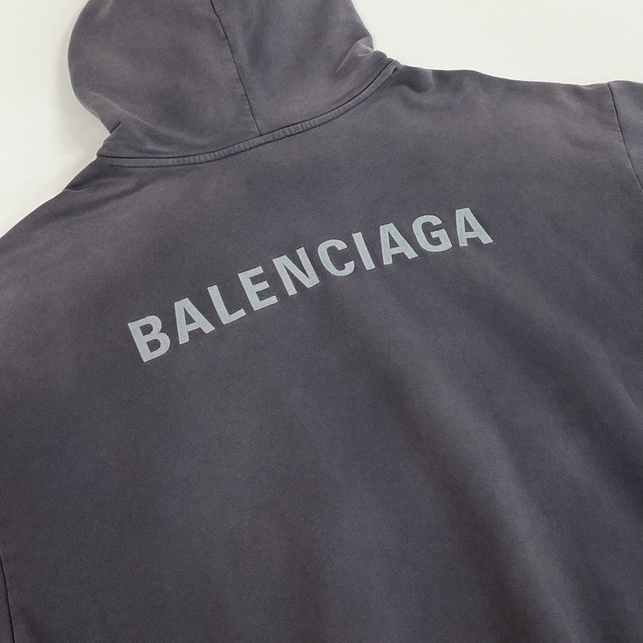 ダークグレーのヴィンテージウォッシュ加工が施された、雰囲気のあるパーカです。背面には存在感のあるBALENCIAGAロゴプリントが入り、シンプルながら強いデザイン性を感じさせます。コットン素材のマットな質感で、シーズンを問わず着回ししやすい一着です。デニムやワイドパンツと合わせたストリートスタイルはもちろん、モード寄りの外しアイテムとしても活躍します。