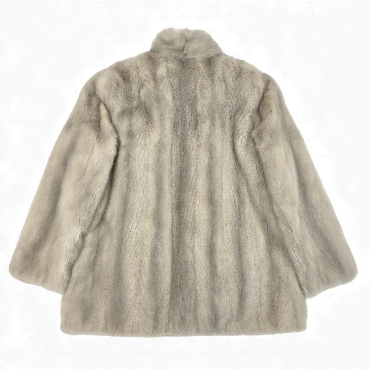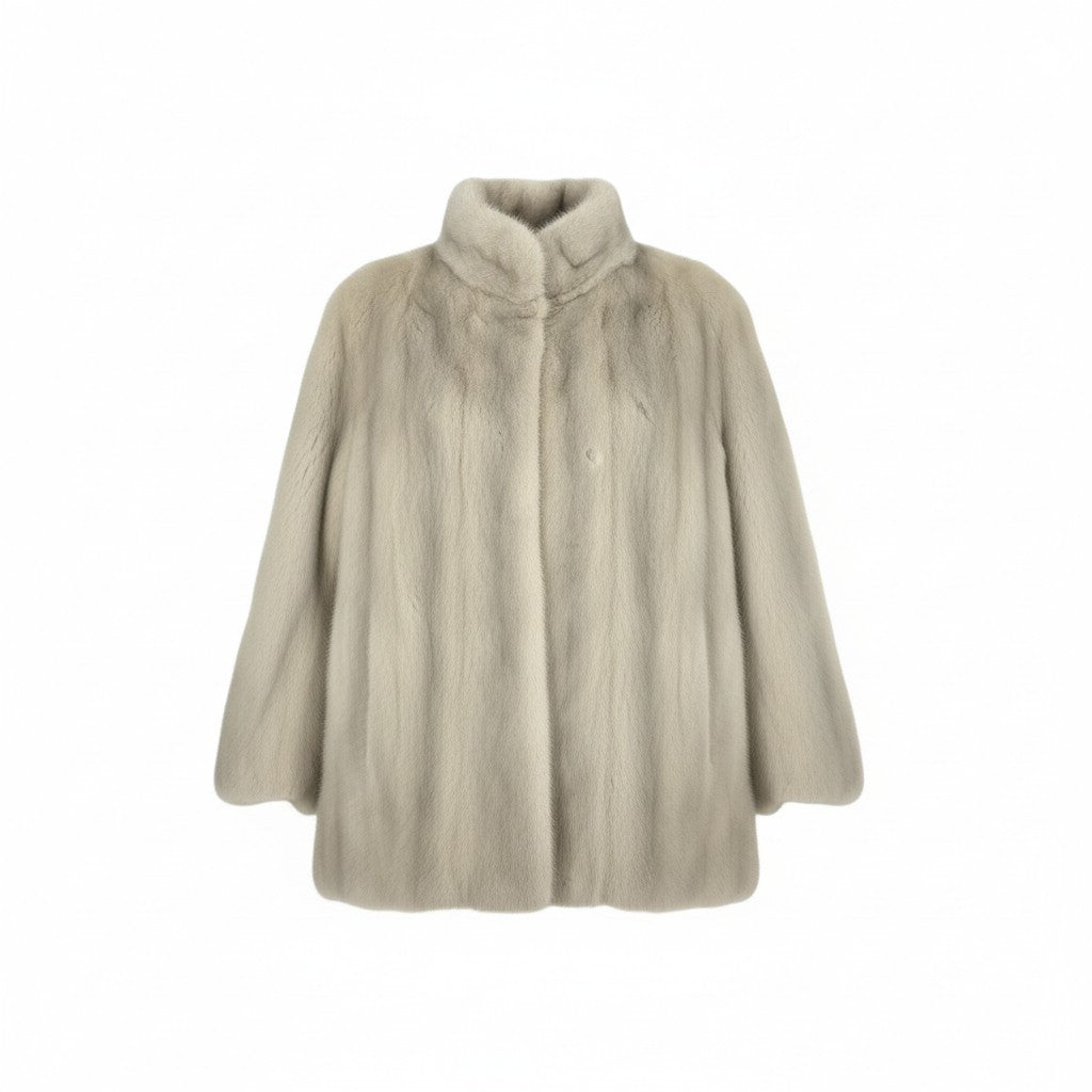 淡いシルバーグレーが美しい、サファイアミンクを贅沢に使用したエレガントな毛皮コートです。毛足は短く均一で、シルクのような光沢としっとりとした柔らかさが際立つ上質な仕上がりです。スタンドカラー風の上品な襟元と、縦方向に整えられたミンクの流れが、洗練されたシルエットを演出します。シンプルなデザインゆえにフォーマルシーンにも合わせやすく、冬のお出かけや特別な場面でワンランク上の装いを楽しめる一着です。落ち着いた色味で年齢問わずお使いいただけます。