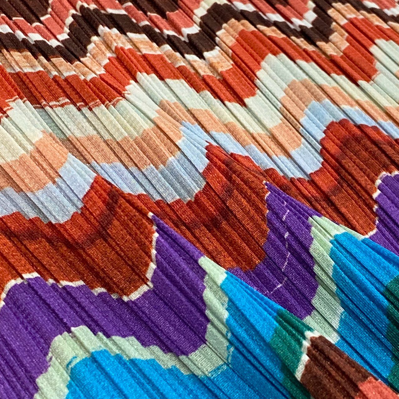 **PLEATS PLEASE**らしい色彩感覚が際立つ、ボーダー調のジグザグプリントワンピースです。レッドやターコイズ、パープルを基調にした多色使いが印象的で、一枚でスタイリングの主役になります。マットでさらりとしたプリーツ素材が美しい縦ラインを演出し、動くたびに表情が変わります。デイリーからお出かけ、リゾートシーンまで幅広く活躍する一着です。