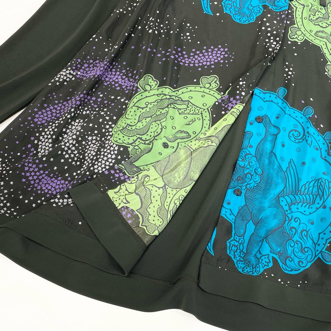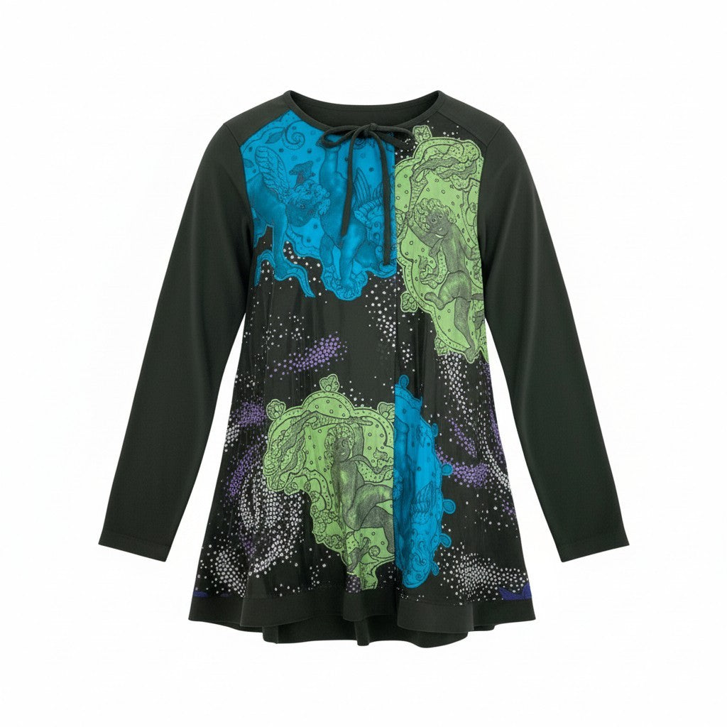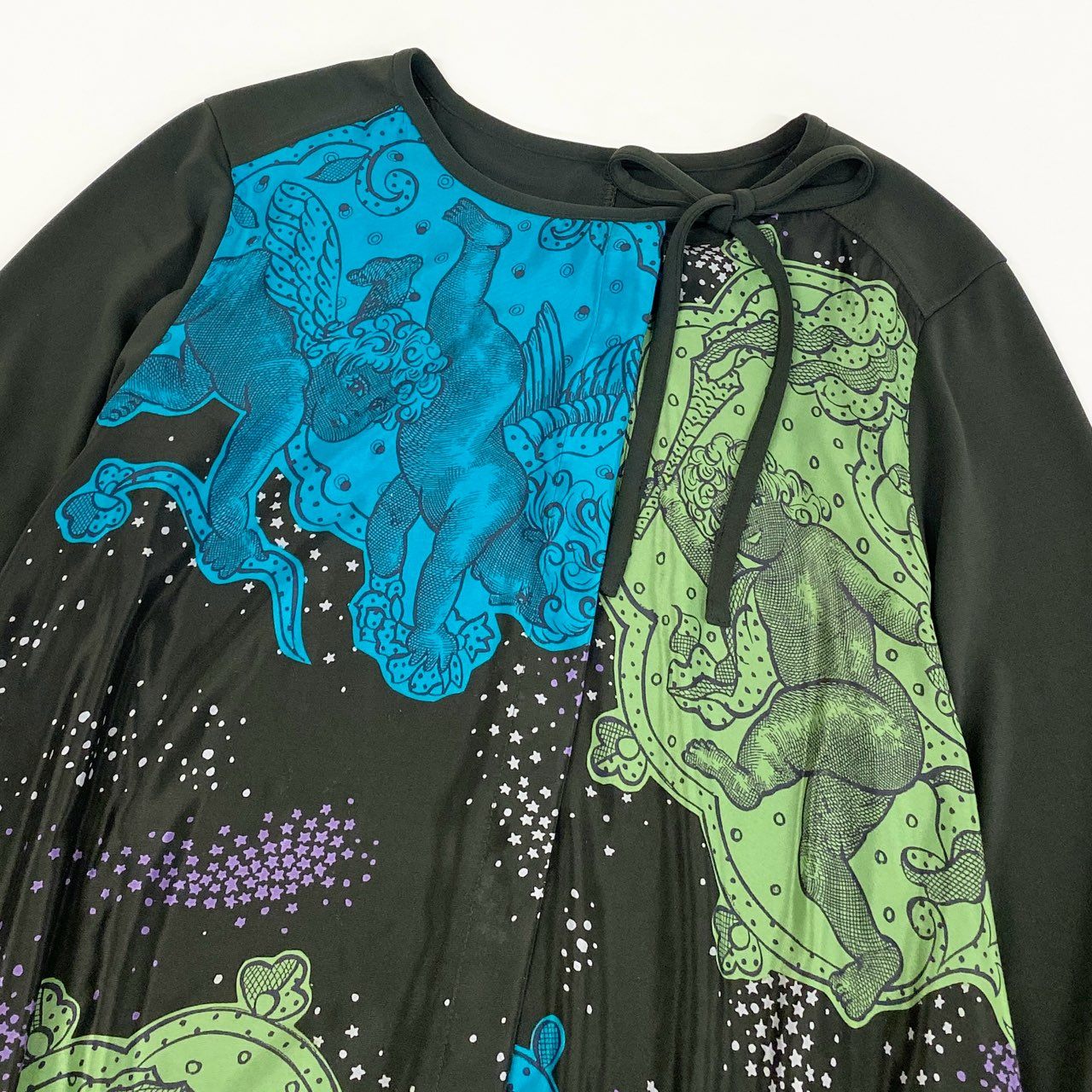 ブラックをベースに、ブルー・ライトグリーンを配したアーティスティックなプリントが目を引くトクコプルミエヴォルのチュニックです。柔らかく落ち感のある素材で、軽やかに広がるAラインシルエットが体型を綺麗に見せてくれます。胸元にはさりげないレースアップ風のリボンディテールを施し、華やかな印象に仕上げています。ロングスリーブで季節を問わず着用でき、レギンスや細身パンツと合わせたコーデに最適です。普段着からお出かけまで幅広く活躍する一枚です。