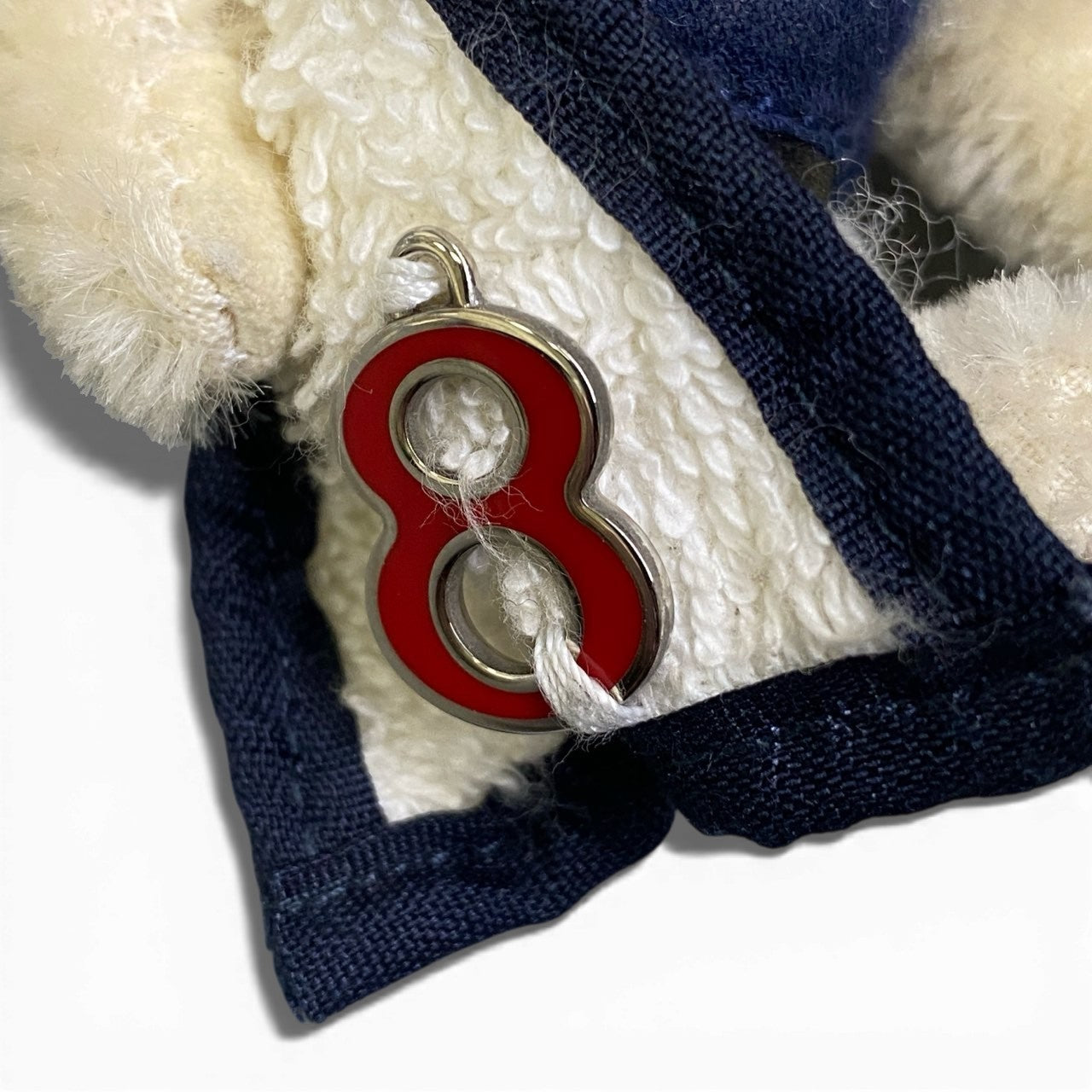 アイボリーホワイトの毛足のあるファー素材ベアに、ミッドナイトネイビーのスイムウェアを合わせた愛らしいPRADAベアトリックキーリングです。胸元にはブルーネイビーのトライアングルロゴプレート(PRADA 2008)があしらわれ、シルバーカラーのメタルフックが高級感を演出します。ストライプ柄アームバンドやミニバッグ、赤の「8」チャームなど細部まで作り込まれたデザインが魅力です。バッグに取り付けるだけでコーディネートに遊び心とラグジュアリー感をプラスしてくれるアイテムです。