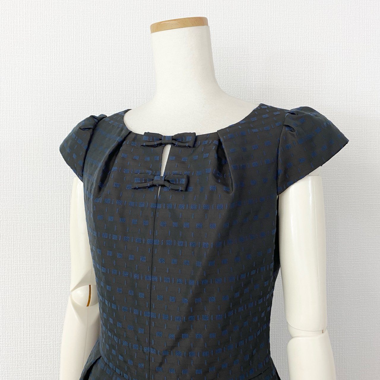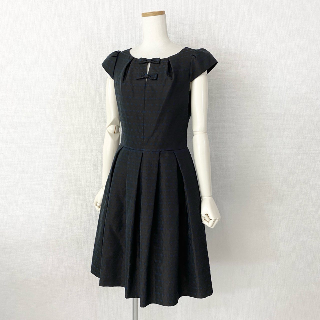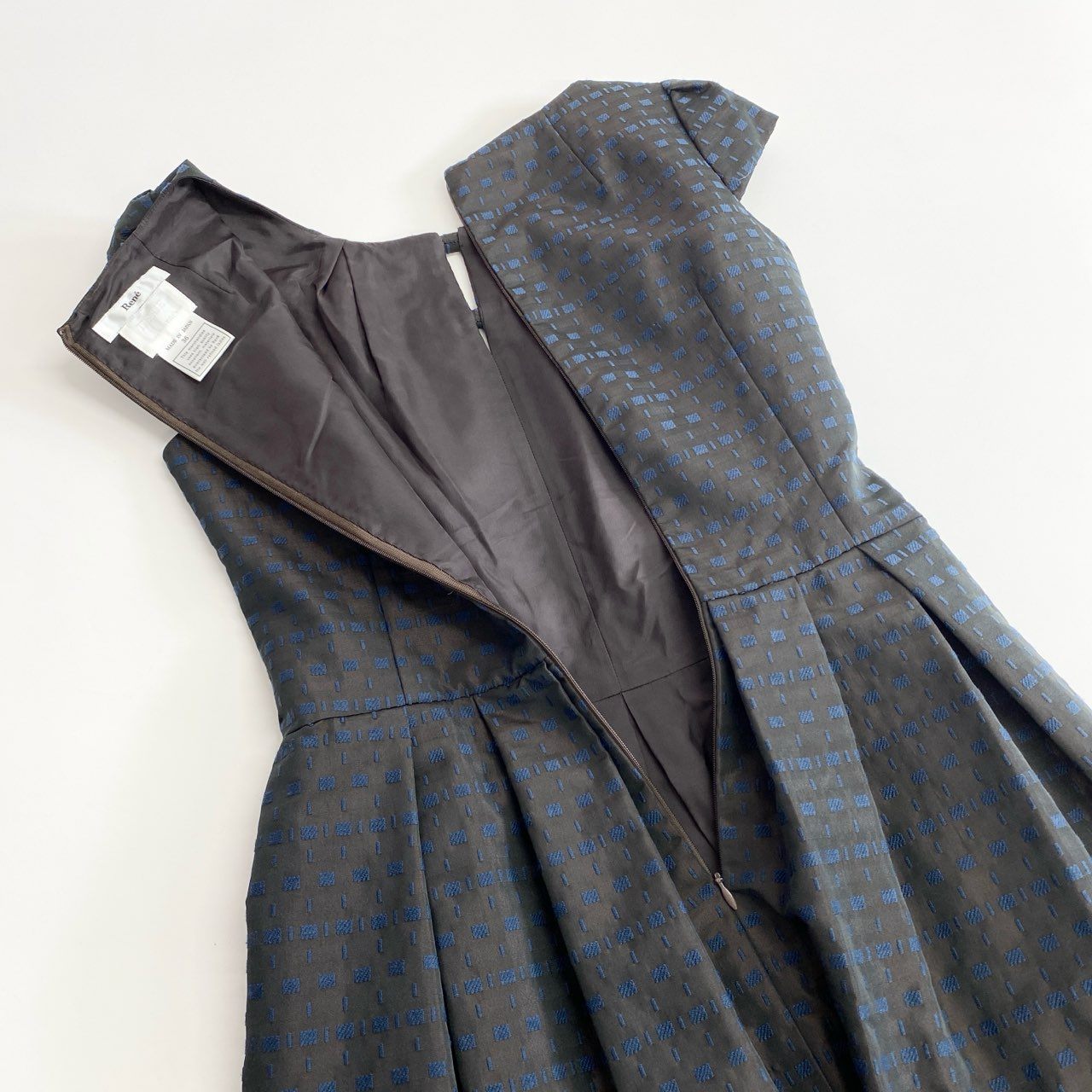 2f14 【美品】 日本製 Rene ルネ イタリア製生地 半袖ワンピース ドレスワンピース タックボリュームスカート リボン装飾 6536140 サイズ36 ブラウン系×ブルー レディース