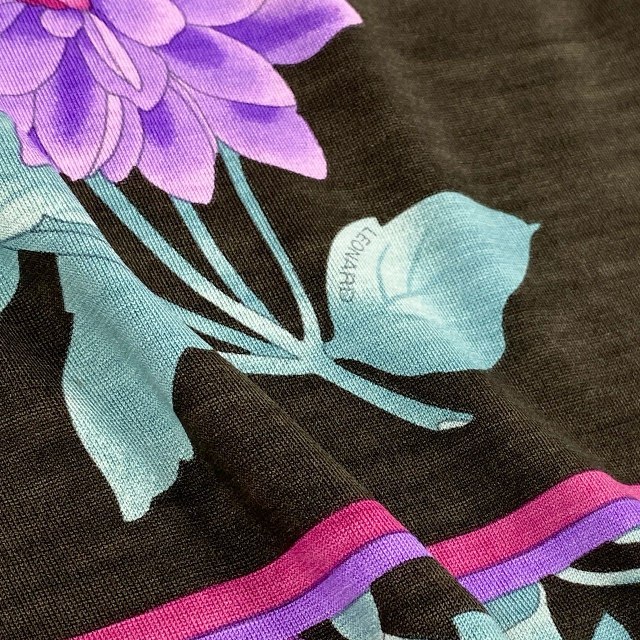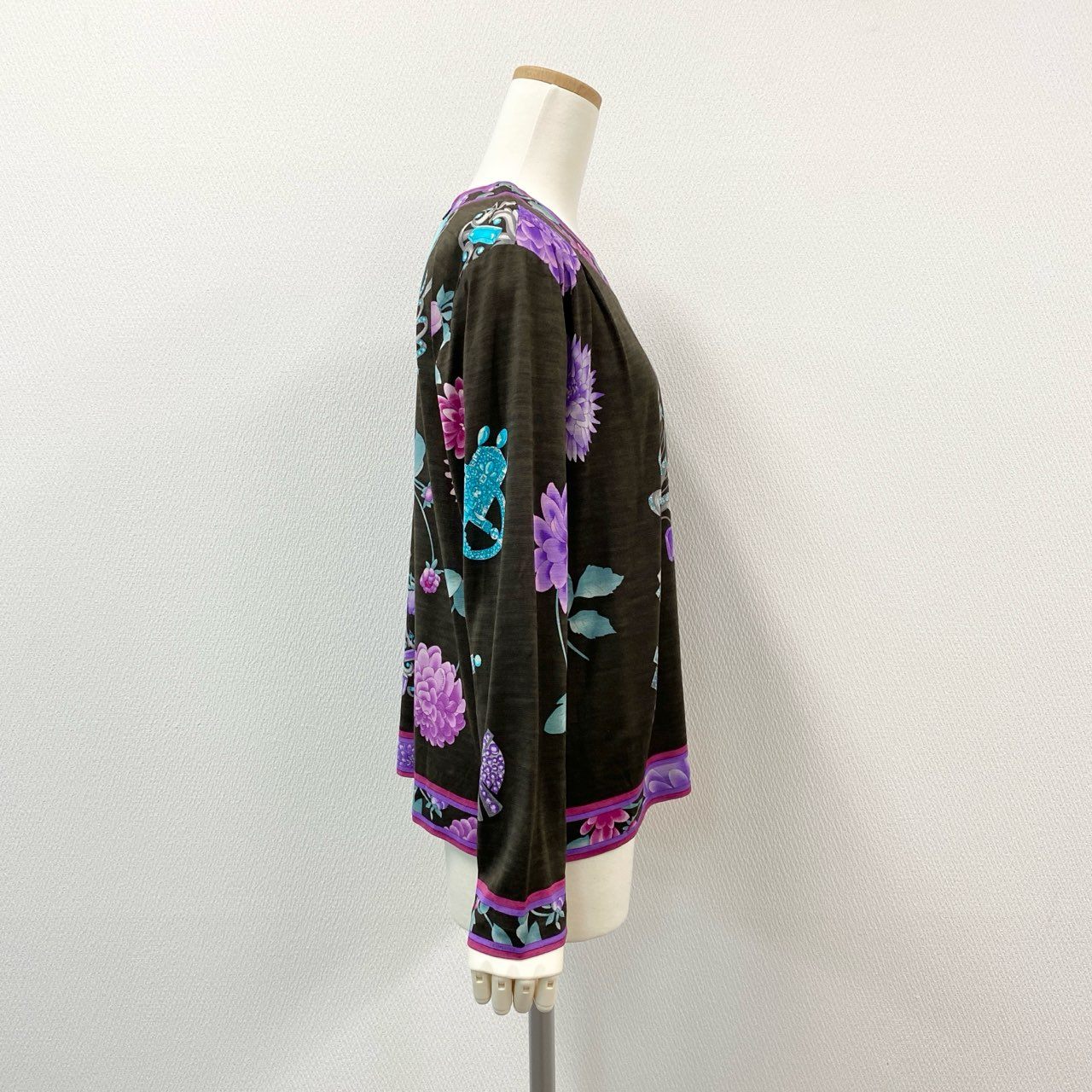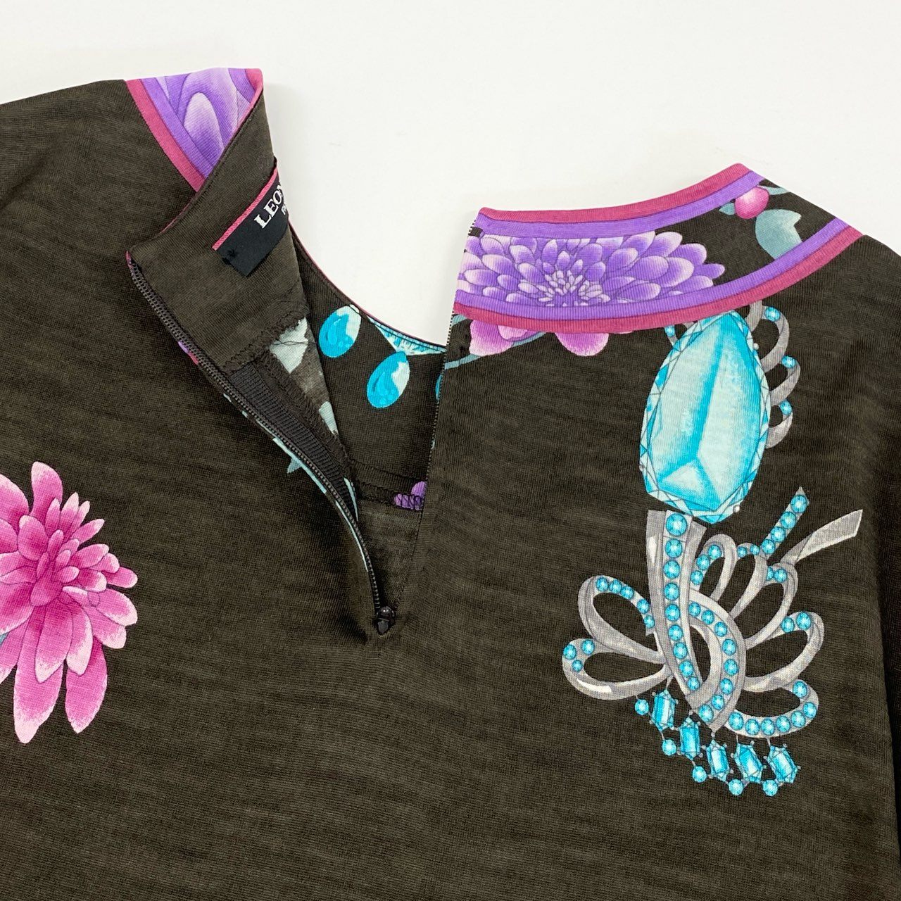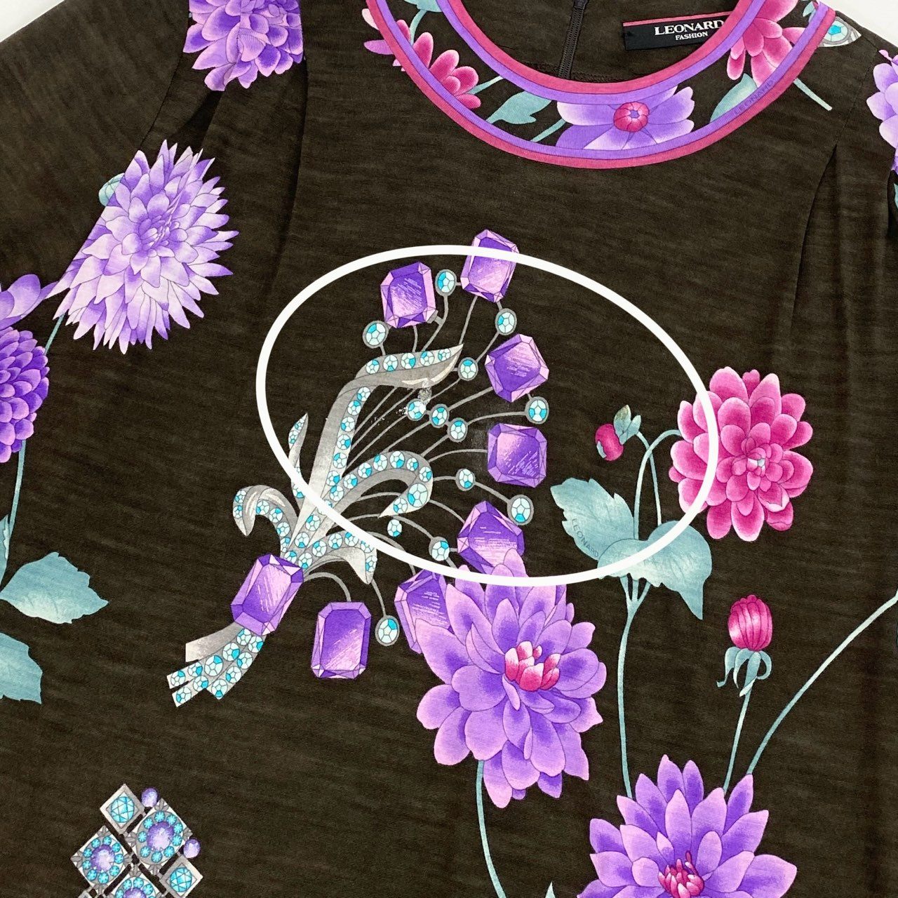 レオナールのハイゲージニット。ダークブラウンをベースに、パープルやマゼンタの華やかな花柄プリントが映えるエレガントな一着です。滑らかでやや透け感のあるハイゲージ生地が上品さを際立たせ、着心地も軽やか。襟や裾のパイピングデザインがアクセントとなり、コーディネート全体を引き締めます。普段のお出かけからディナーシーンまで、幅広く活躍するアイテムです。
