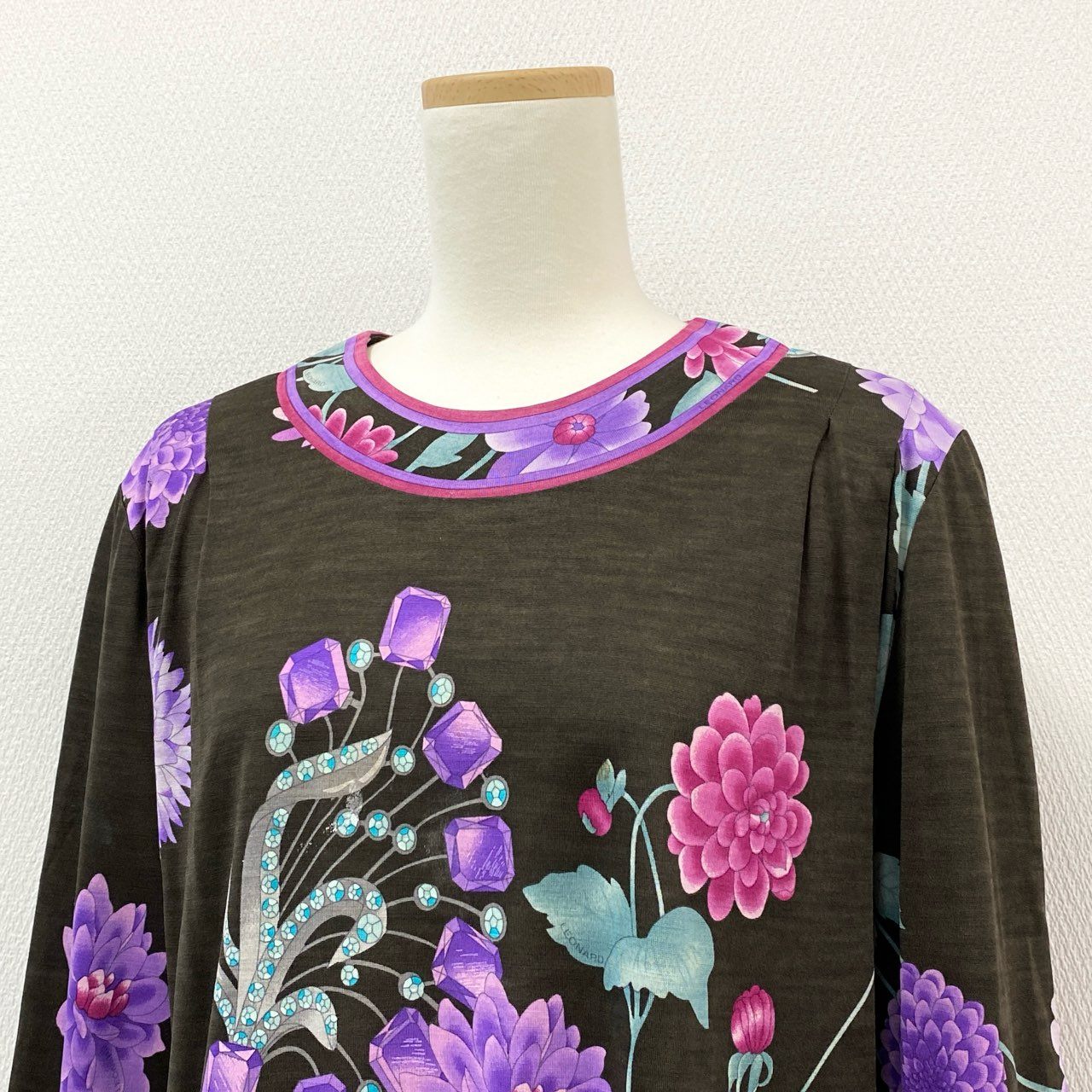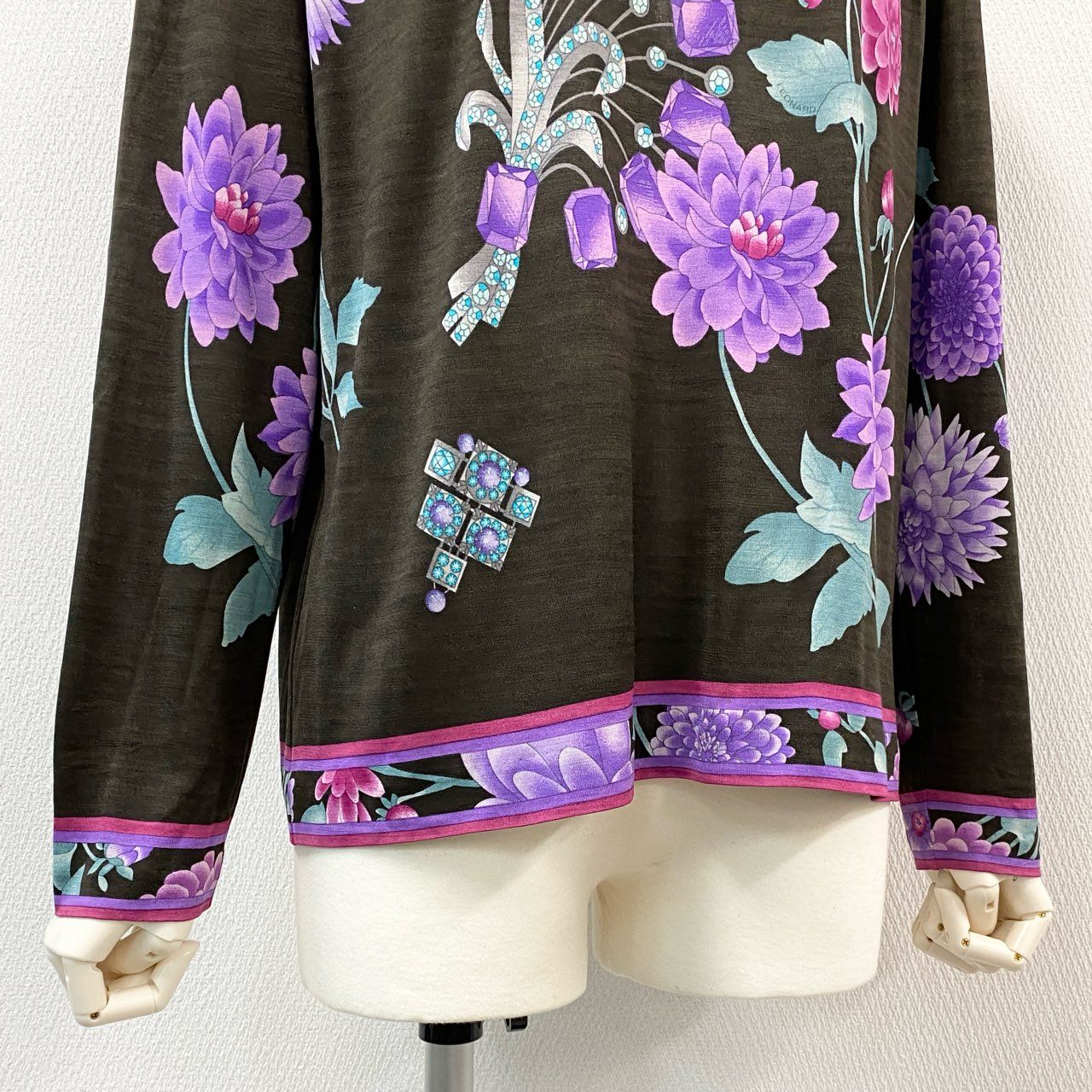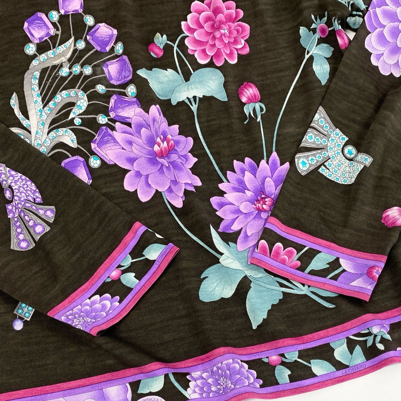 76i12 LEONARD レオナール ハイゲージ ニット セーター トップス 美しい花柄プリント 0389643 サイズ42 ブラウン ウールシルク レディースu02t