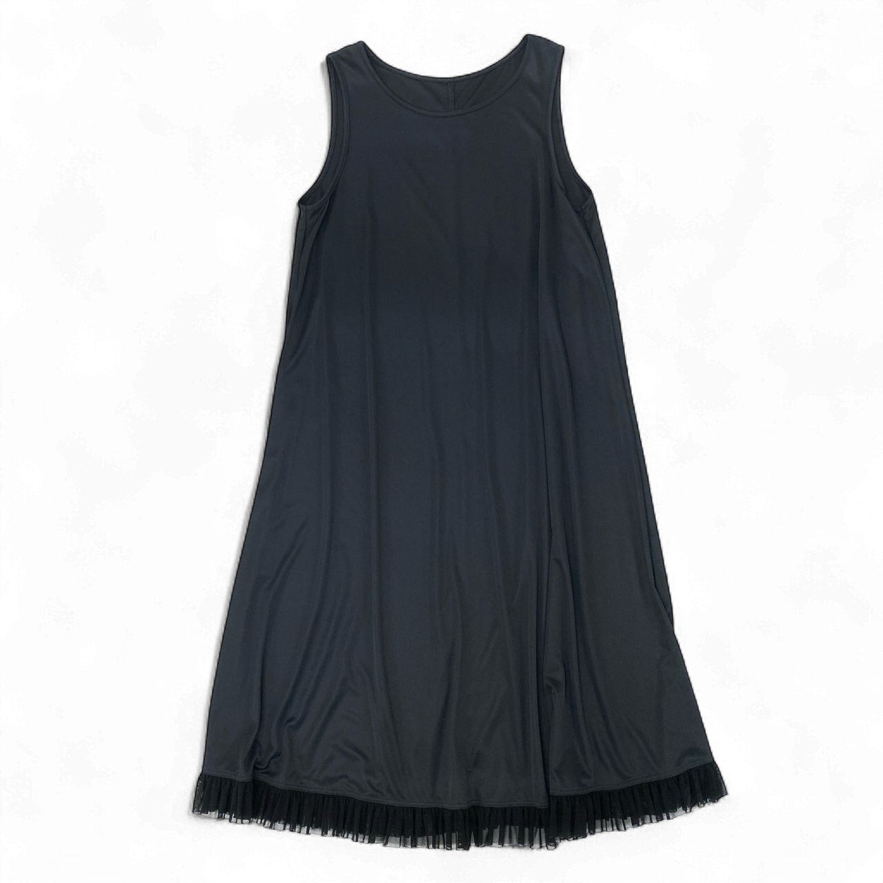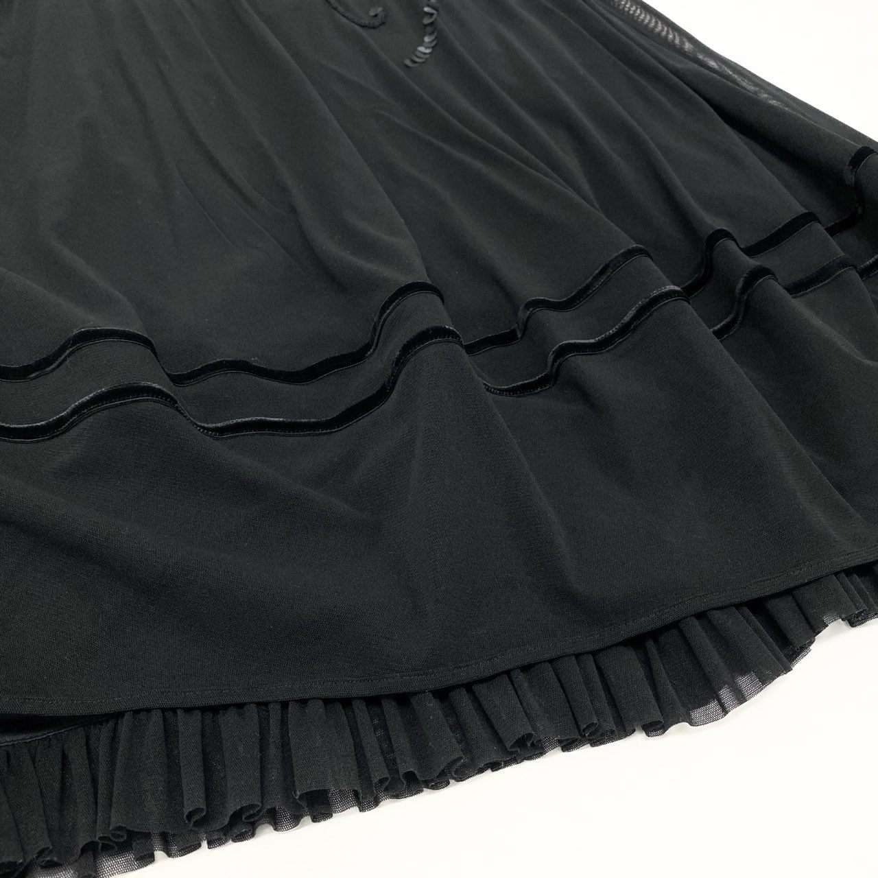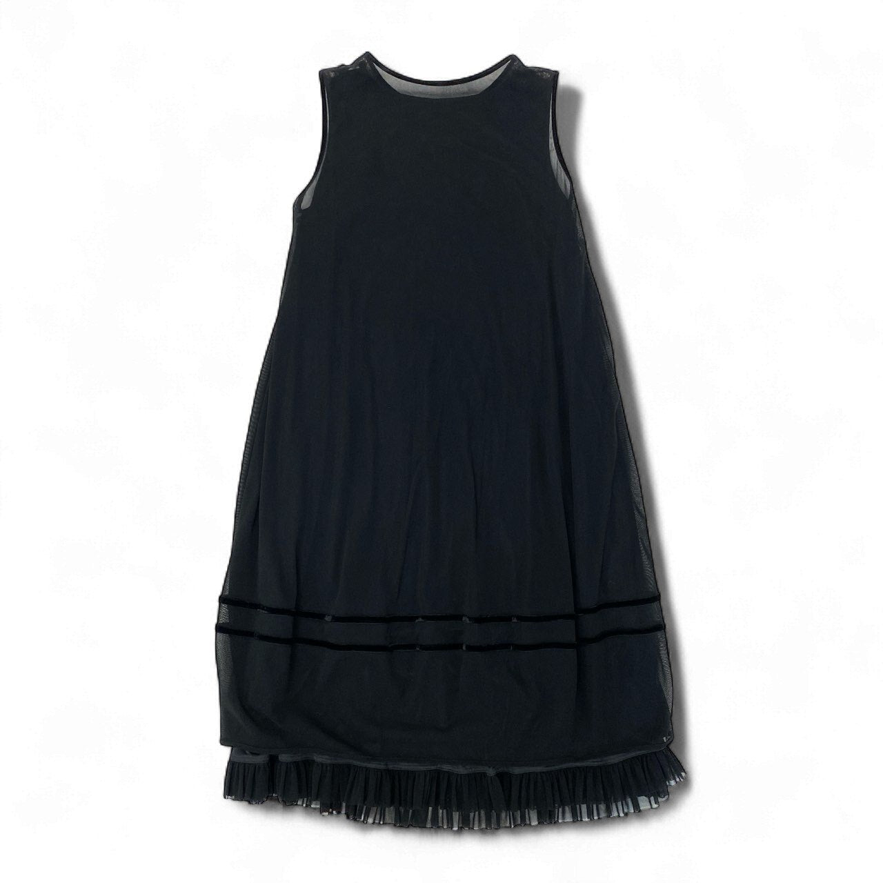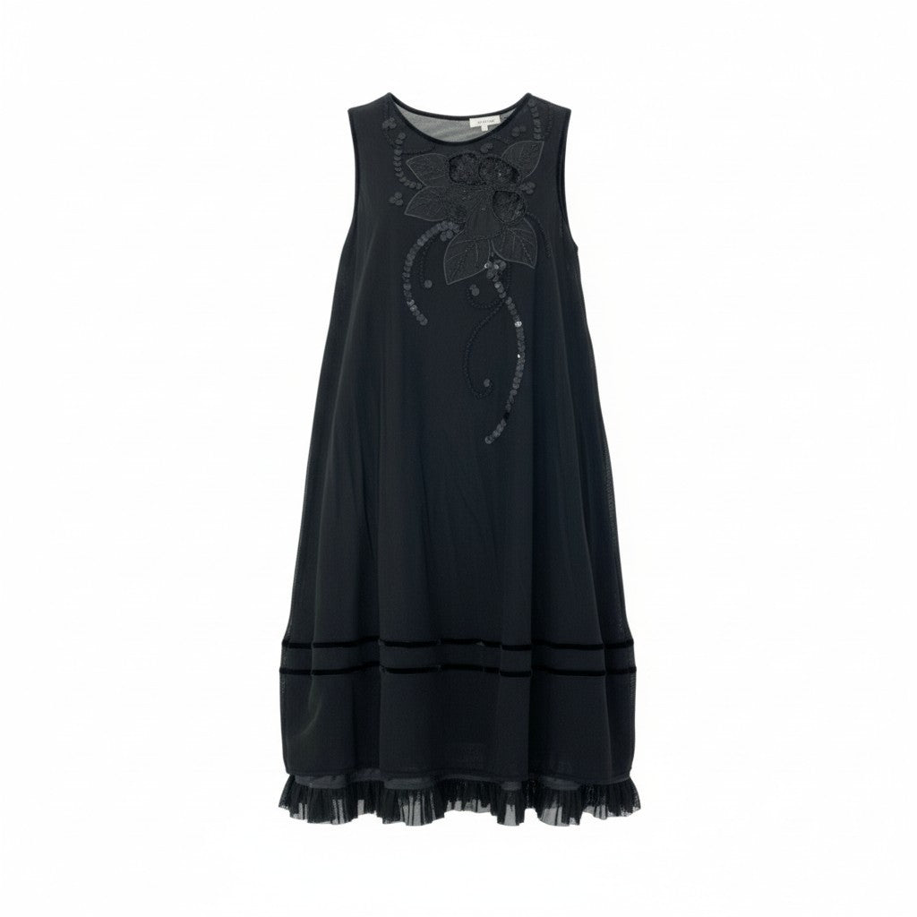 深みのあるブラックをベースに、フロントには大きな花柄刺繍とスパンコール装飾があしらわれた、トクコプルミエヴォルらしいエレガントでアート性の高いノースリーブワンピースです。生地は軽く透け感があり、重ね着しても重たく見えない繊細なシアー素材を使用。裾には細かなフリルとタックが入り、動くたびに揺れる女性らしいシルエットを演出します。1枚で華やかな場に対応でき、お出かけ・ディナー・旅行にも活躍する上品な一着です。