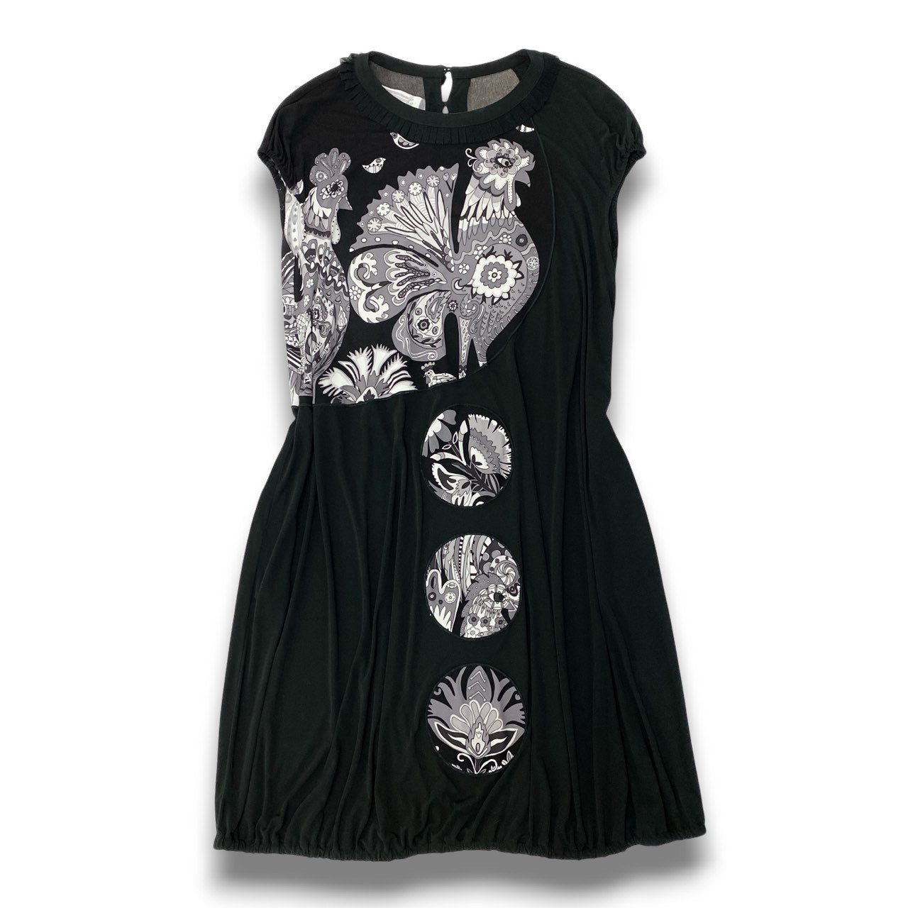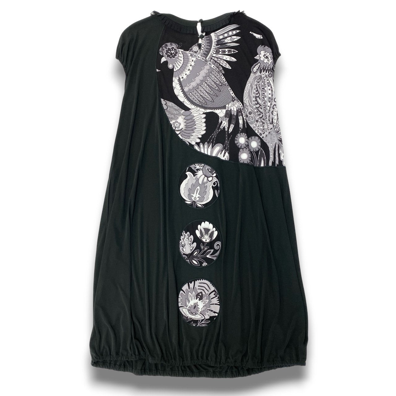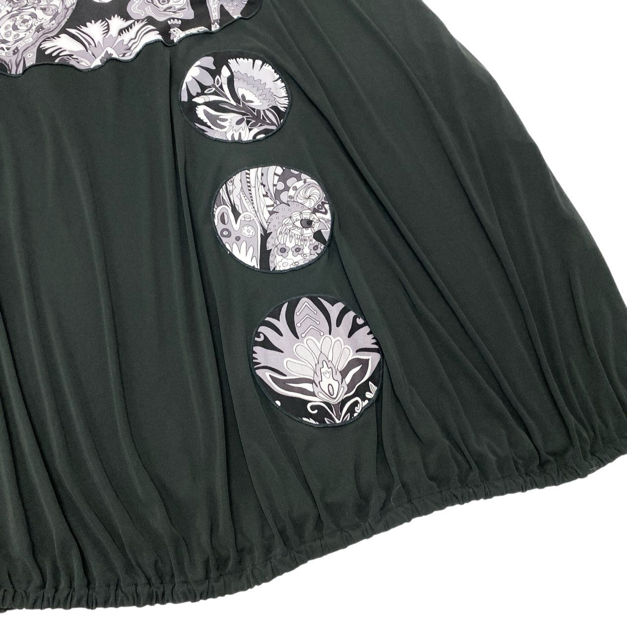 ブラックをベースにモノトーンのフラワーモチーフや装飾的なプリントが施された、トクコプルミエヴォルらしいアート感あふれるバルーンワンピースです。胸元から縦に並ぶ円形モチーフが印象的で、個性的でモダンなデザインに仕上がっています。柔らかなストレッチ素材で着心地も良く、裾にボリュームを持たせたバルーンシルエットが女性らしいラインを演出。1枚で主役になるデザインで、カジュアルからお出かけスタイルまで幅広く活躍する一着です。