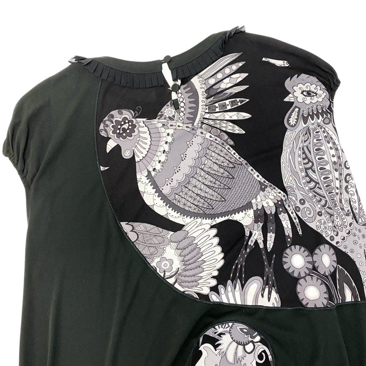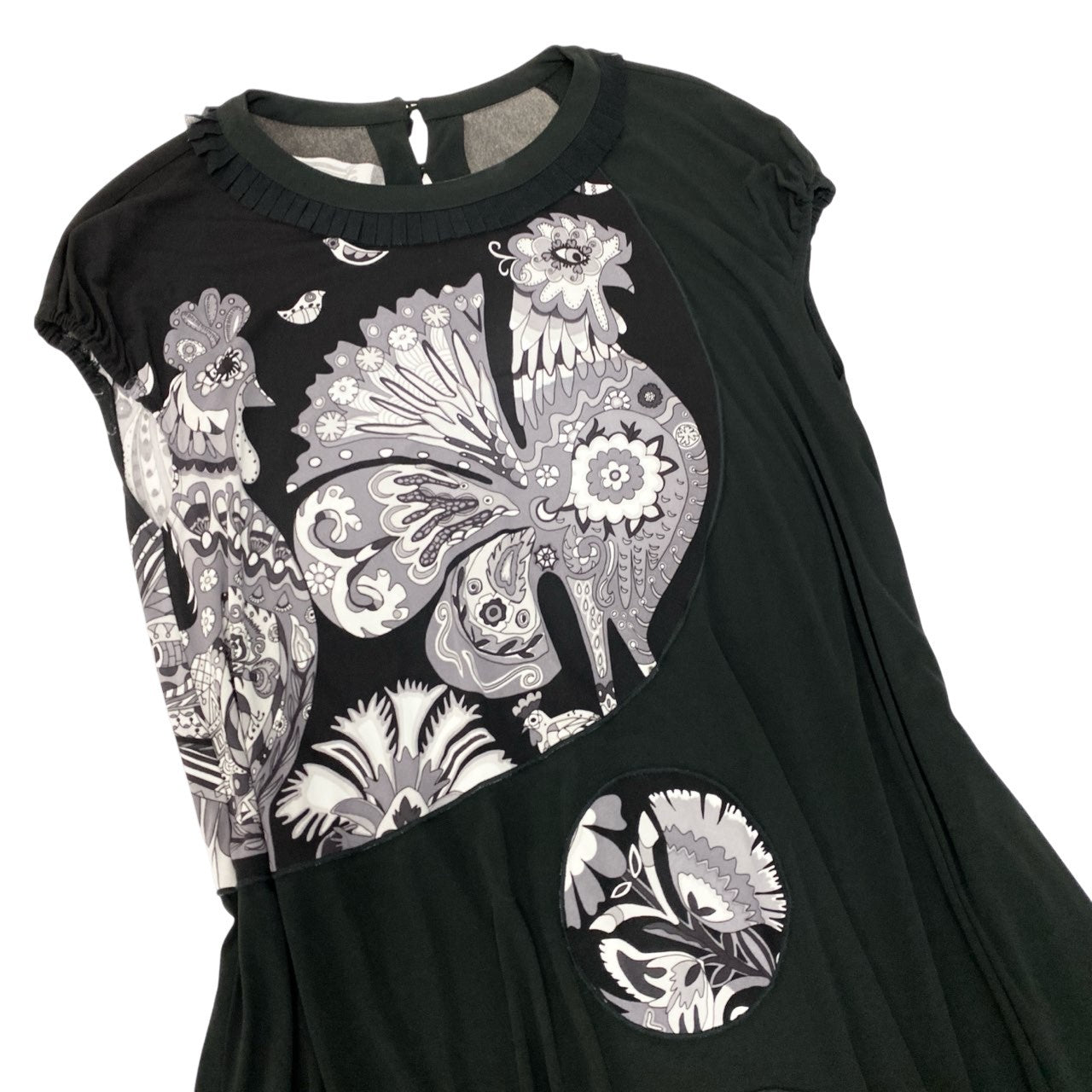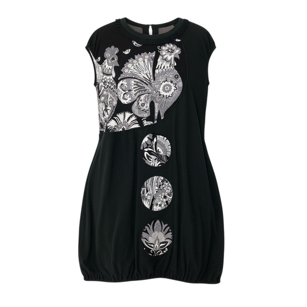 ブラックをベースにモノトーンのフラワーモチーフや装飾的なプリントが施された、トクコプルミエヴォルらしいアート感あふれるバルーンワンピースです。胸元から縦に並ぶ円形モチーフが印象的で、個性的でモダンなデザインに仕上がっています。柔らかなストレッチ素材で着心地も良く、裾にボリュームを持たせたバルーンシルエットが女性らしいラインを演出。1枚で主役になるデザインで、カジュアルからお出かけスタイルまで幅広く活躍する一着です。