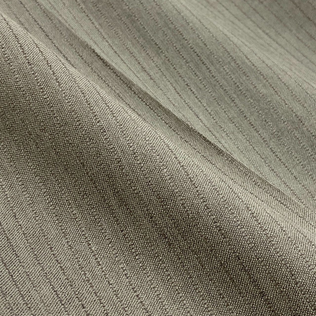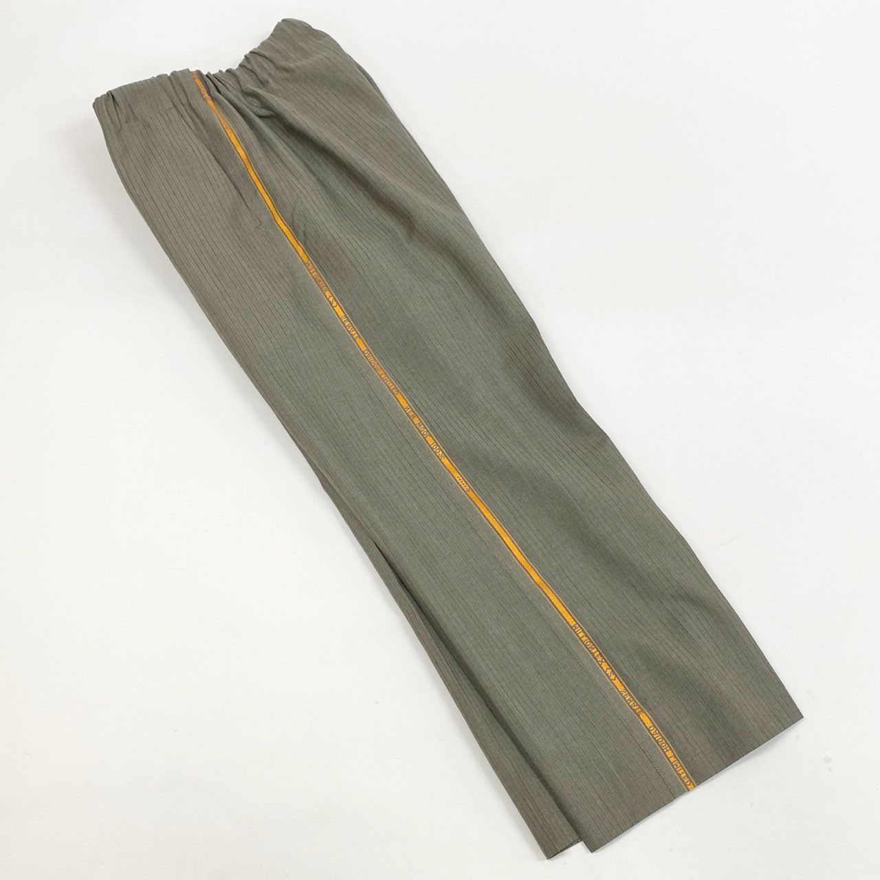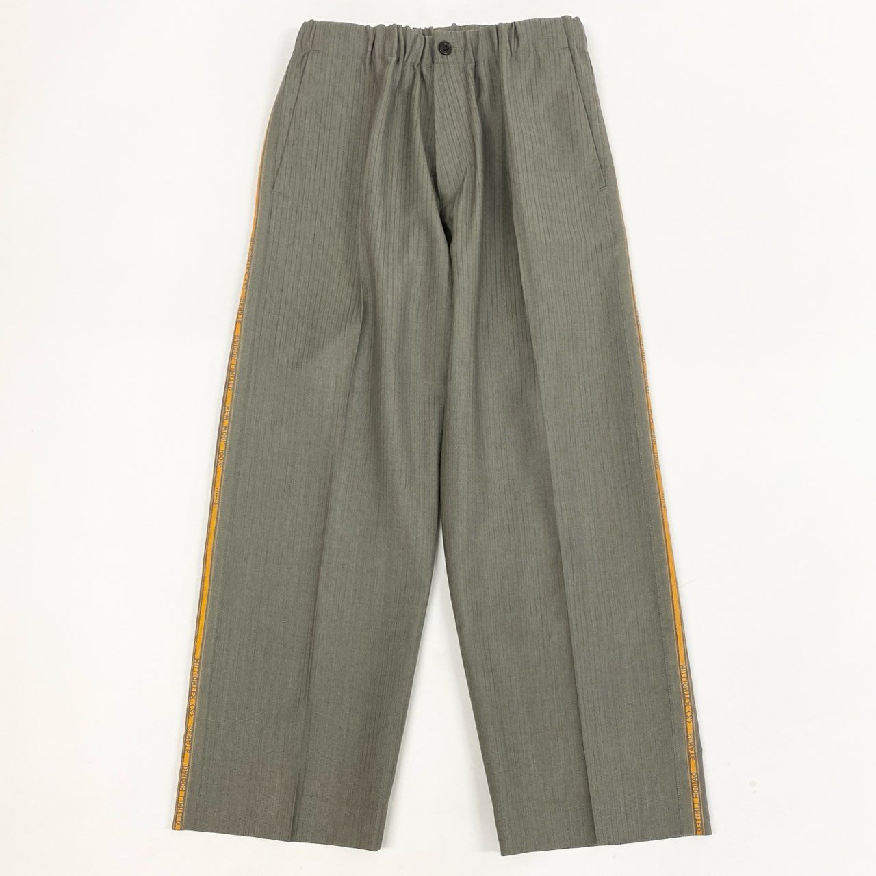 TOZAOUのmimi seriesによるサイドラインパンツです。カラーは落ち着いたグレーで、全体に細かなストライプ柄が入り、サイドのイエローラインがデザインアクセントになっています。素材はマットな質感で落ち感があり、ワイドなシルエットでもすっきりとした印象です。カットソーやシャツと合わせたリラックススタイルから、モード寄りのコーディネートまで幅広く活躍する一本です。