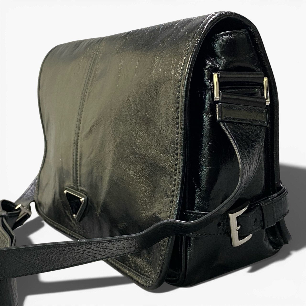 ブラックのソフトルックスレザーを使用したプラダのショルダーバッグです。 自然な艶感とシボ感のあるレザーが上品で落ち着いた印象を演出します。 フロントにはシルバーのトライアングルロゴプレートを配置し、ブランドらしい存在感をプラス。 程よいマチ幅と収納力を備え、カジュアルからビジネスカジュアルまで幅広いスタイルに馴染む一品です。