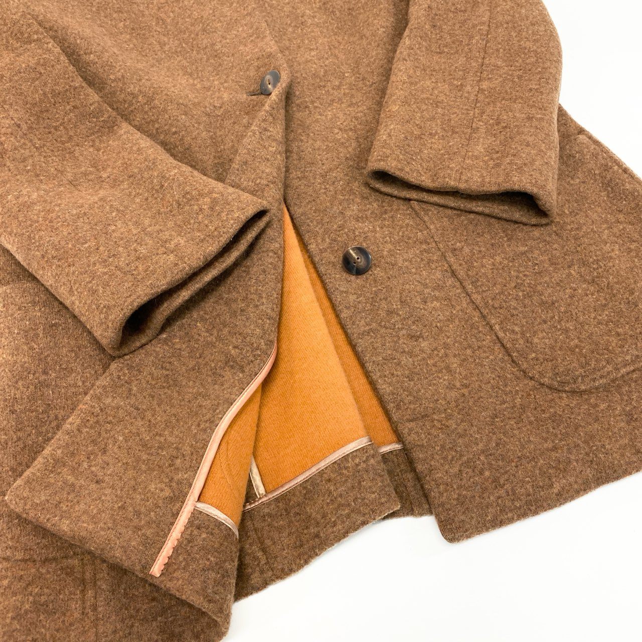 色は温かみのある**ブラウン(キャメル寄りのライトブラウン)**で、縮絨ウール×アンゴラ混ならではの柔らかな風合いが魅力のチェスターコートです。 英国製ならではの上質な素材感と、ほんのり光沢のあるウールの表情が品よく、秋冬のスタイルを格上げします。 ゆったりラグランスリーブのため動きやすく、Aライン気味のシルエットで体型を拾わず着こなしやすいデザイン。 大きめのパッチポケットと上品な襟のラインが特徴で、普段使いから通勤・お出かけまで幅広く活躍する一着です。