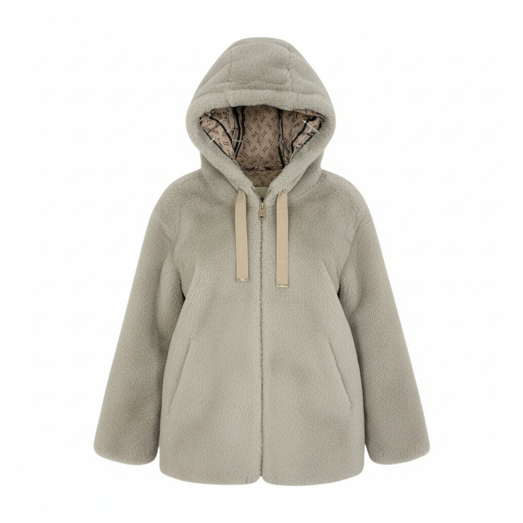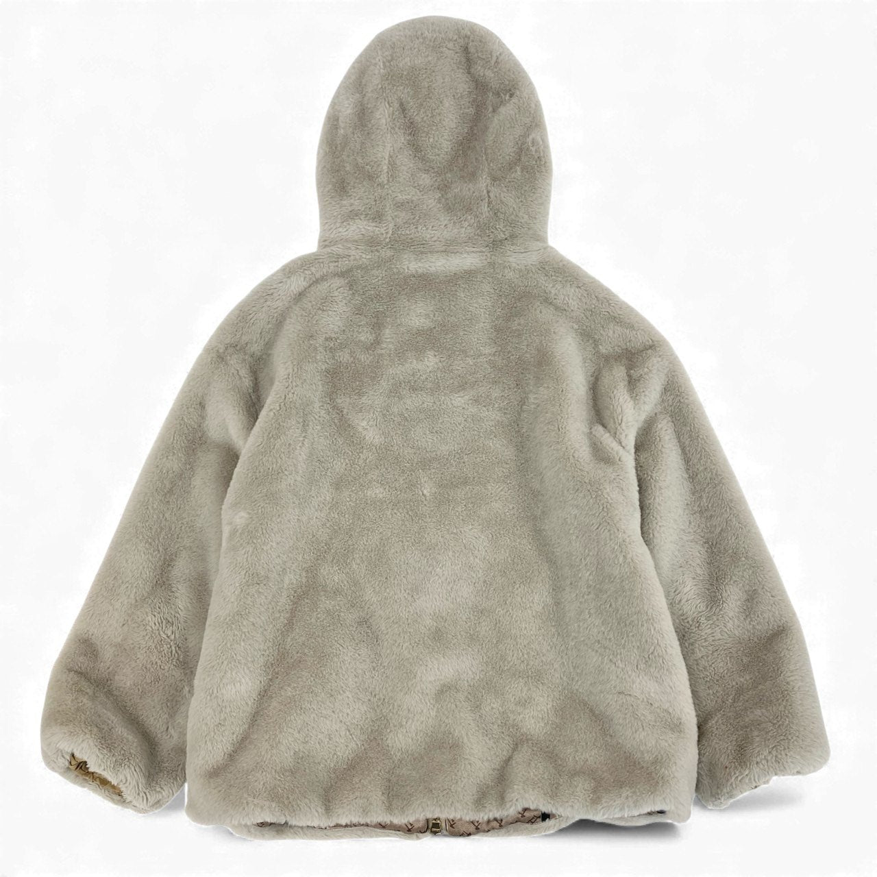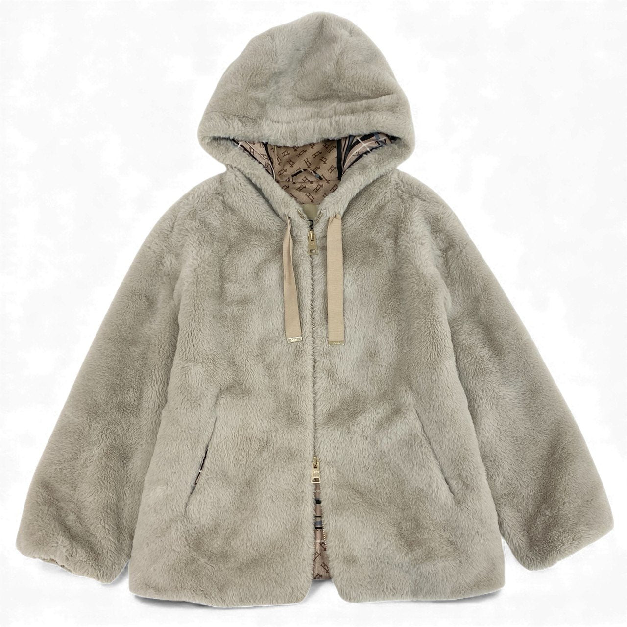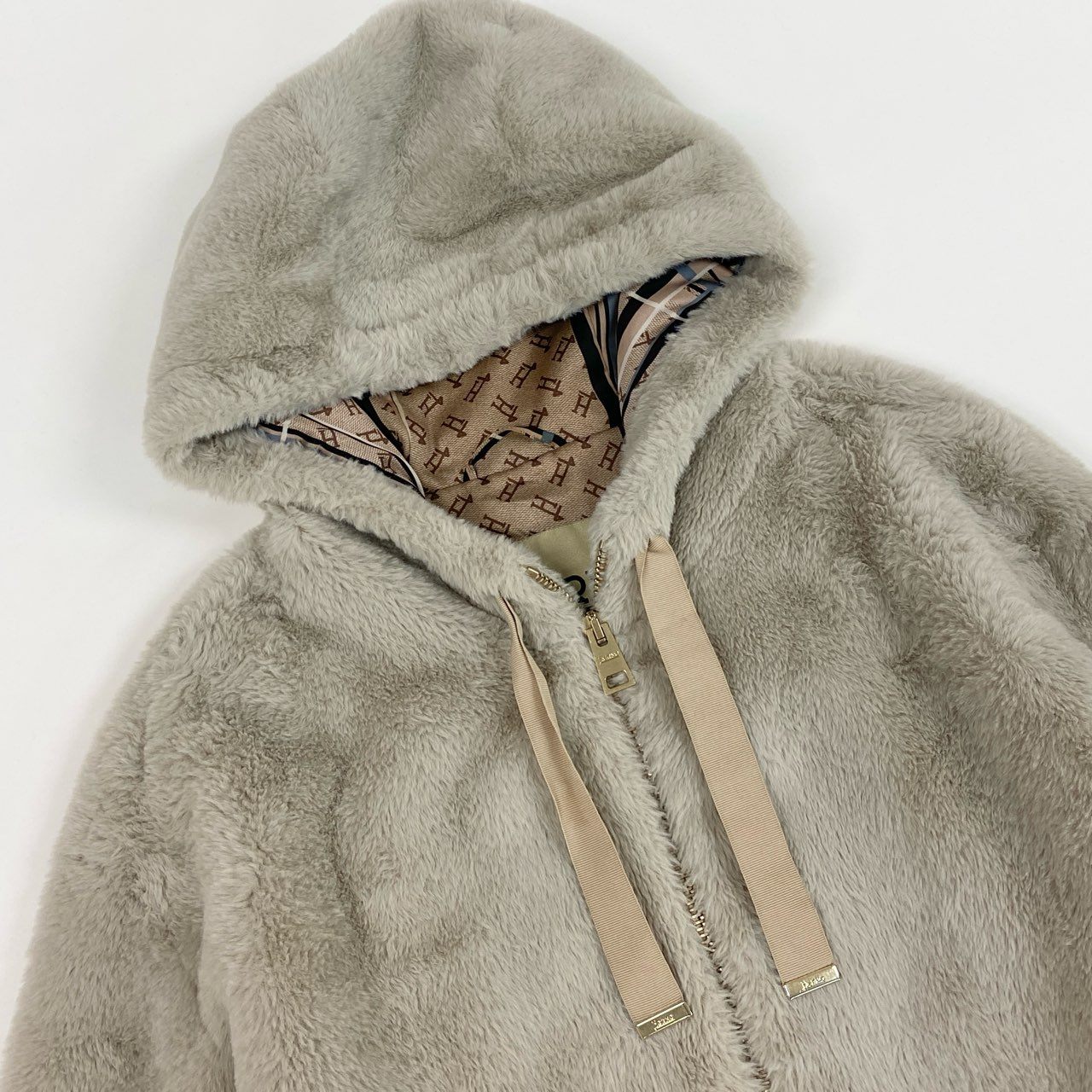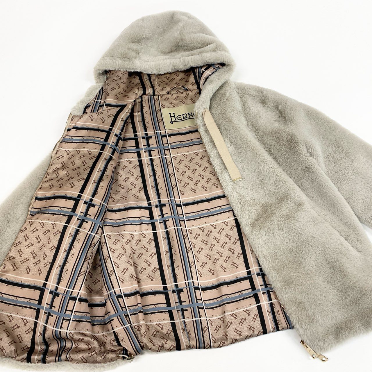 淡いグレージュ調のベージュが上品な、ヘルノのエコファーパーカージャケット。毛足の柔らかいファー素材がふんわりとしたボリューム感を演出し、内側はヘルノらしいモノグラム柄で高級感をプラスしています。フロントのグログランリボンが女性らしいアクセントとなり、カジュアルからきれいめまで幅広く対応。ヒップまで覆うあたたかいミドル丈で、デイリー使いから冬のお出かけまで活躍する一着です。