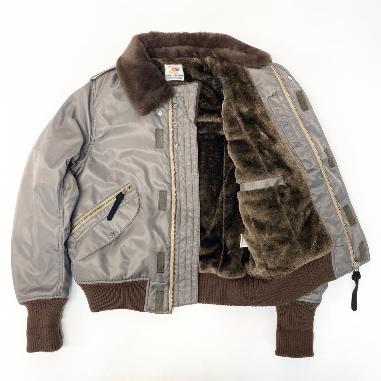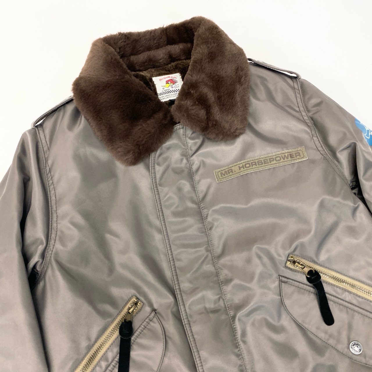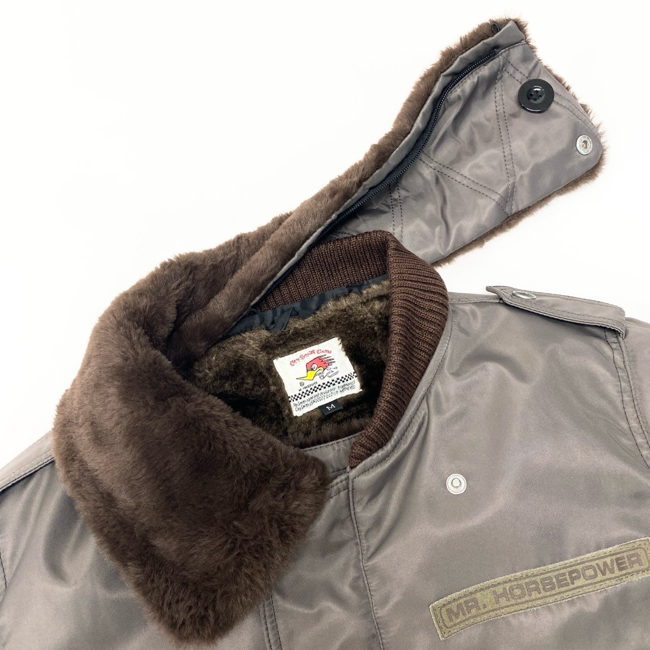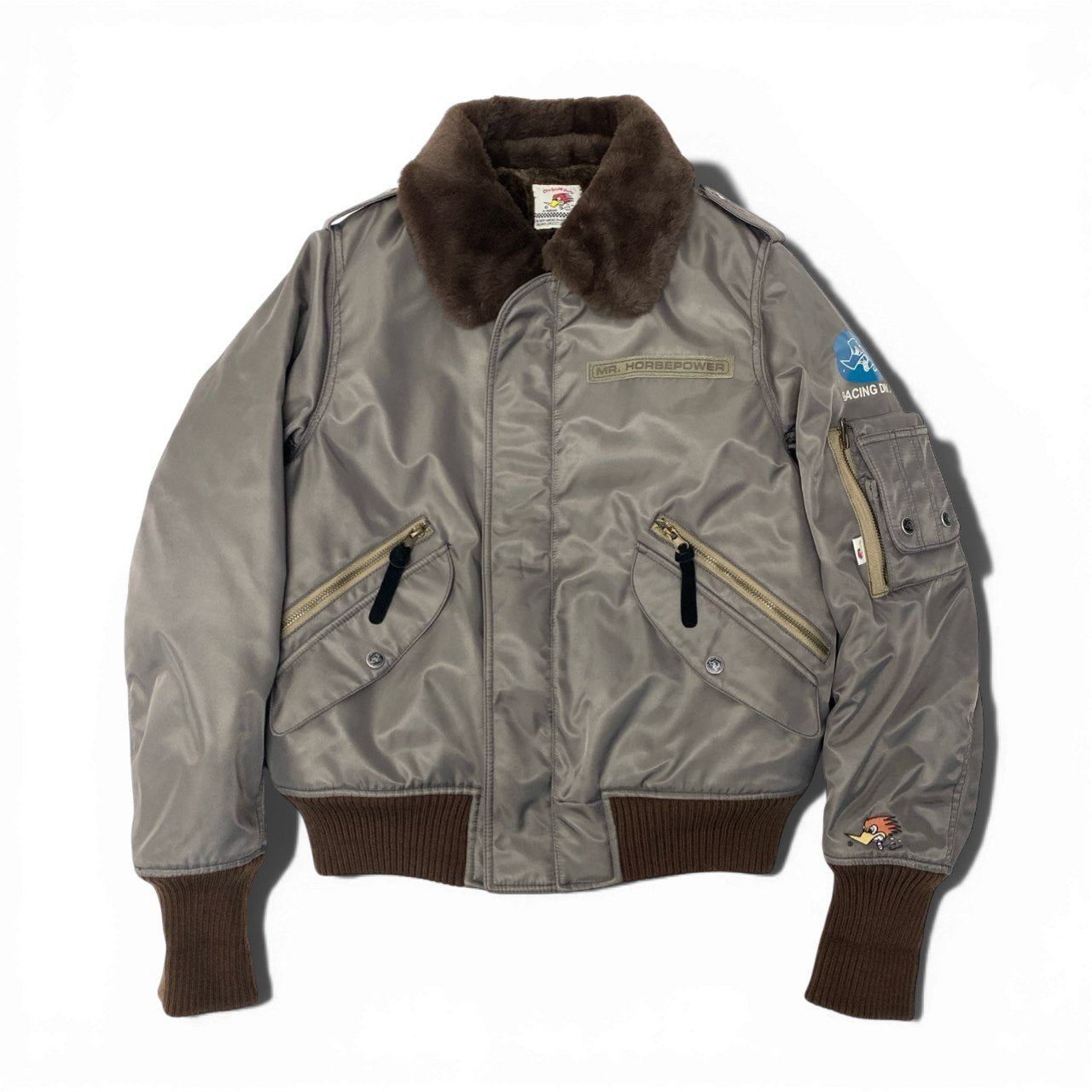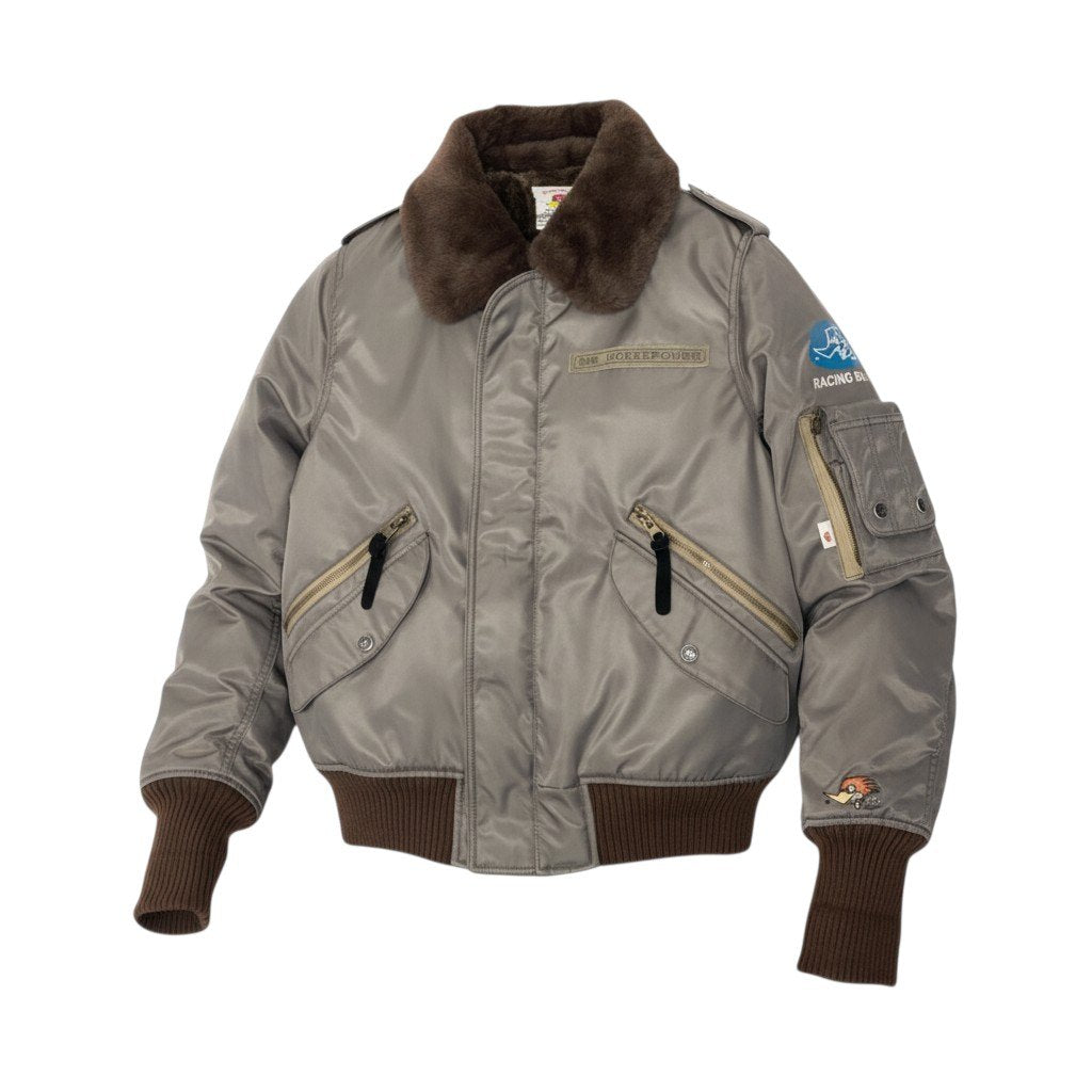 チャコールグレーの光沢感のあるナイロン素材に、ブラウンのファーカラーを組み合わせたClay Smithのフライトジャケットです。 背面には「CLAY SMITH SPEED SHOP」のロゴとコミカルなウッドペッカー風キャラクターのグラフィックプリントが施され、ヴィンテージモータースタイルを演出します。 袖のワッペンやリブ仕様の袖口・裾など、ミリタリーライクなディテールが魅力です。 デニムやワークパンツと相性が良く、秋冬のカジュアルコーデに映える存在感のあるメンズジャケットです。