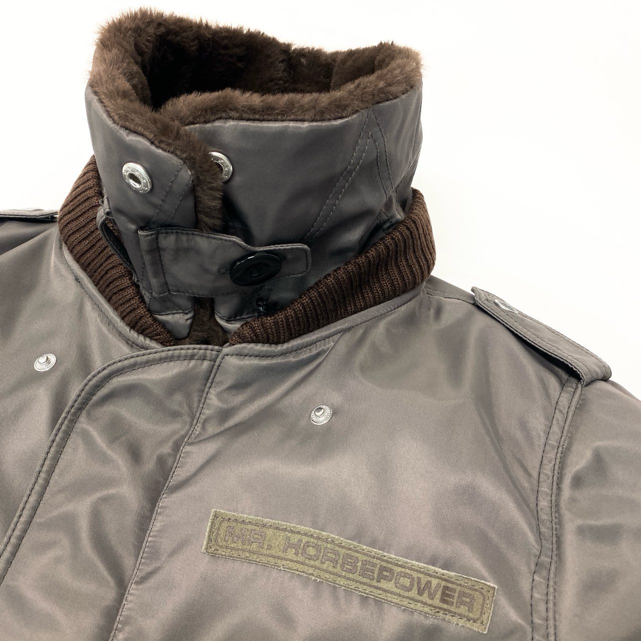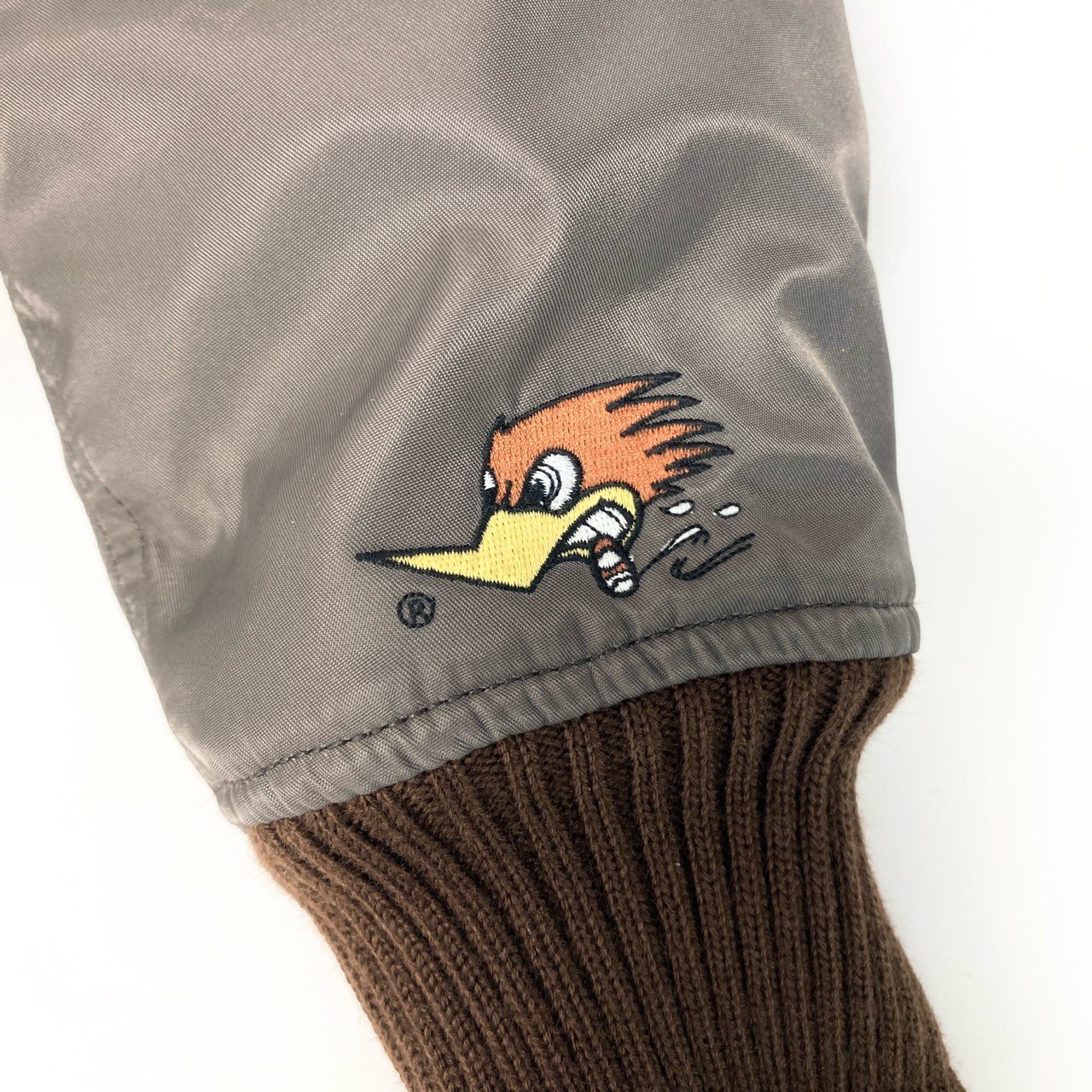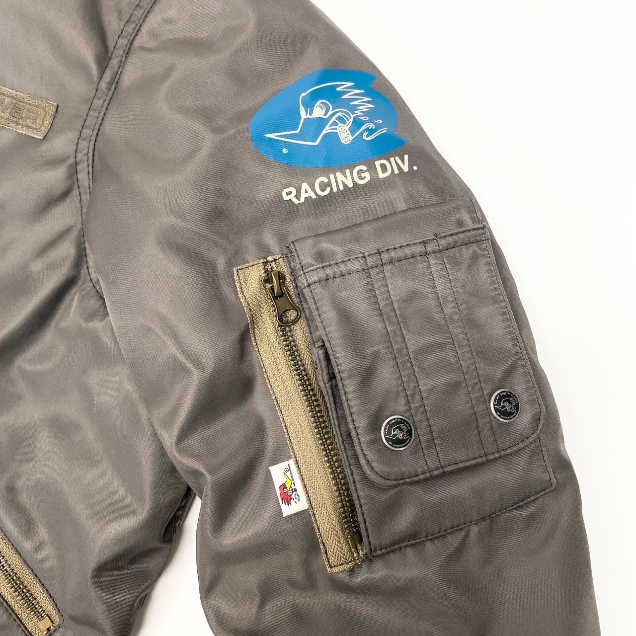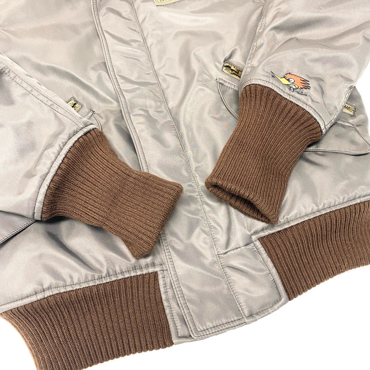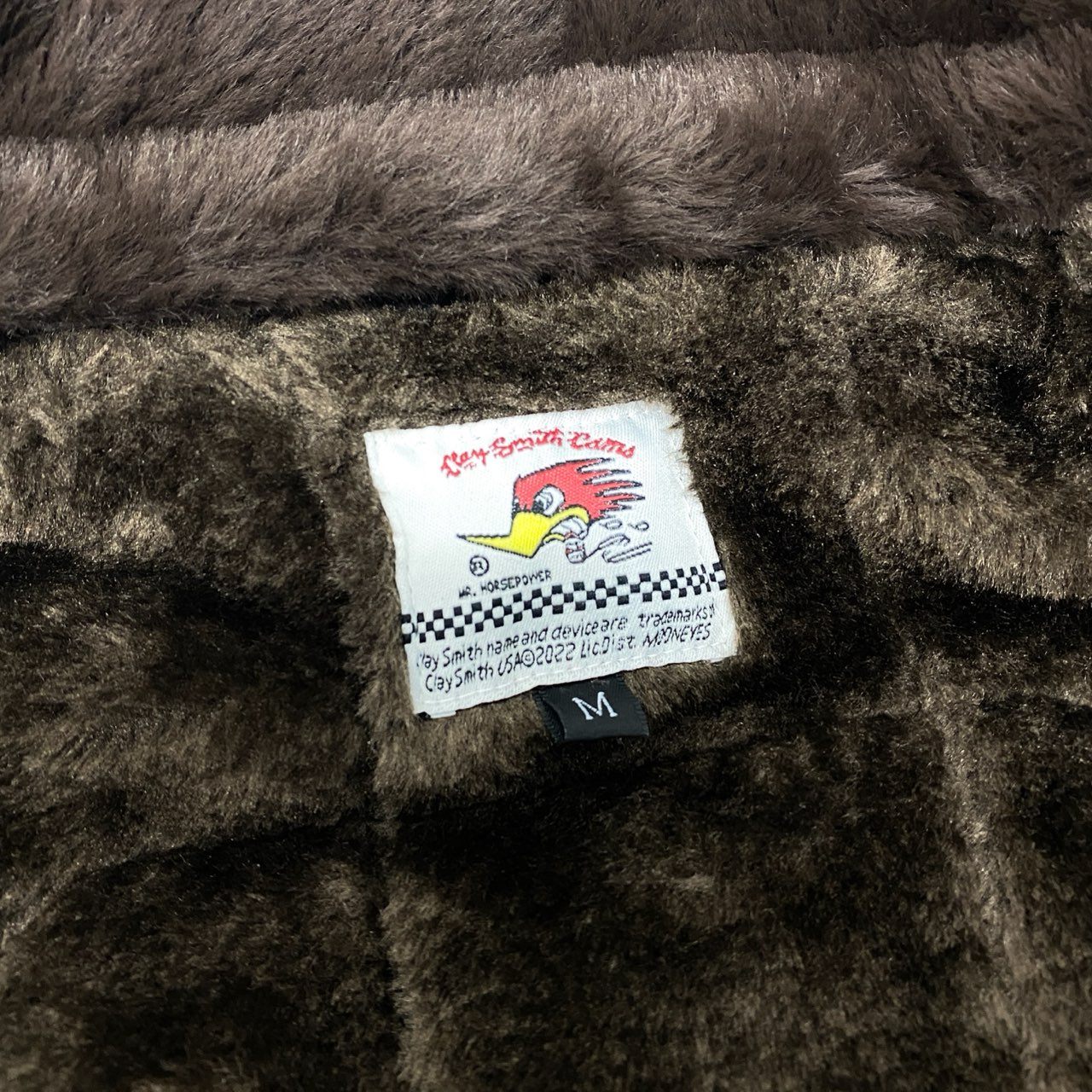 チャコールグレーの光沢感のあるナイロン素材に、ブラウンのファーカラーを組み合わせたClay Smithのフライトジャケットです。 背面には「CLAY SMITH SPEED SHOP」のロゴとコミカルなウッドペッカー風キャラクターのグラフィックプリントが施され、ヴィンテージモータースタイルを演出します。 袖のワッペンやリブ仕様の袖口・裾など、ミリタリーライクなディテールが魅力です。 デニムやワークパンツと相性が良く、秋冬のカジュアルコーデに映える存在感のあるメンズジャケットです。