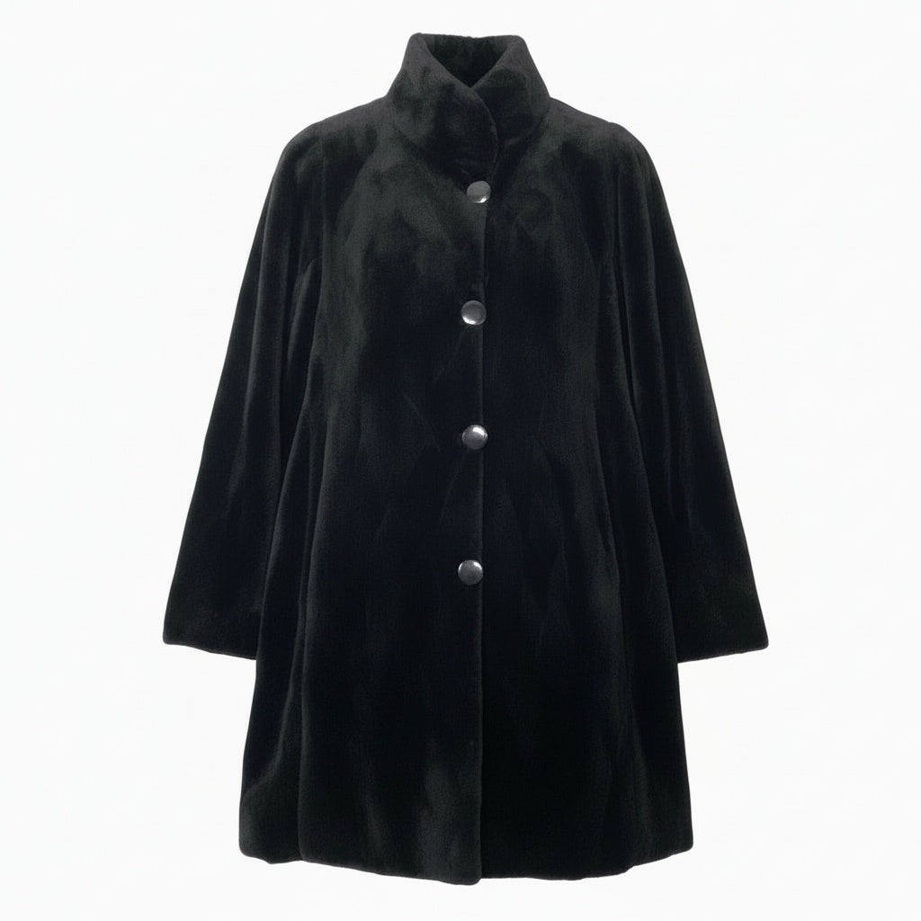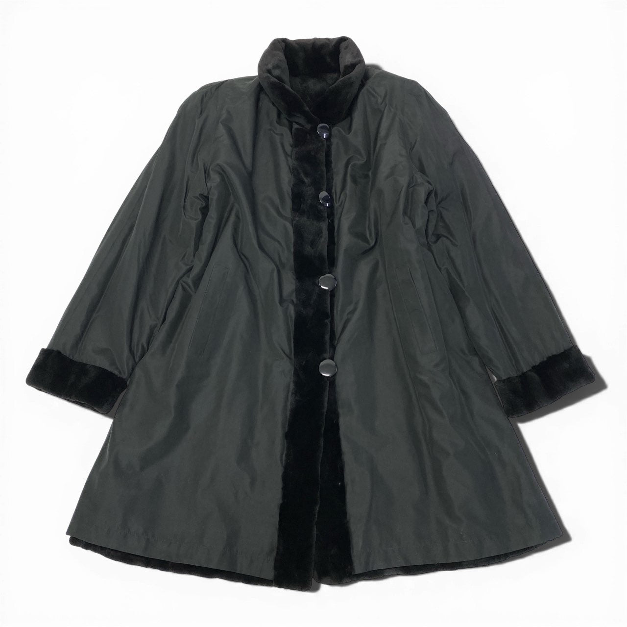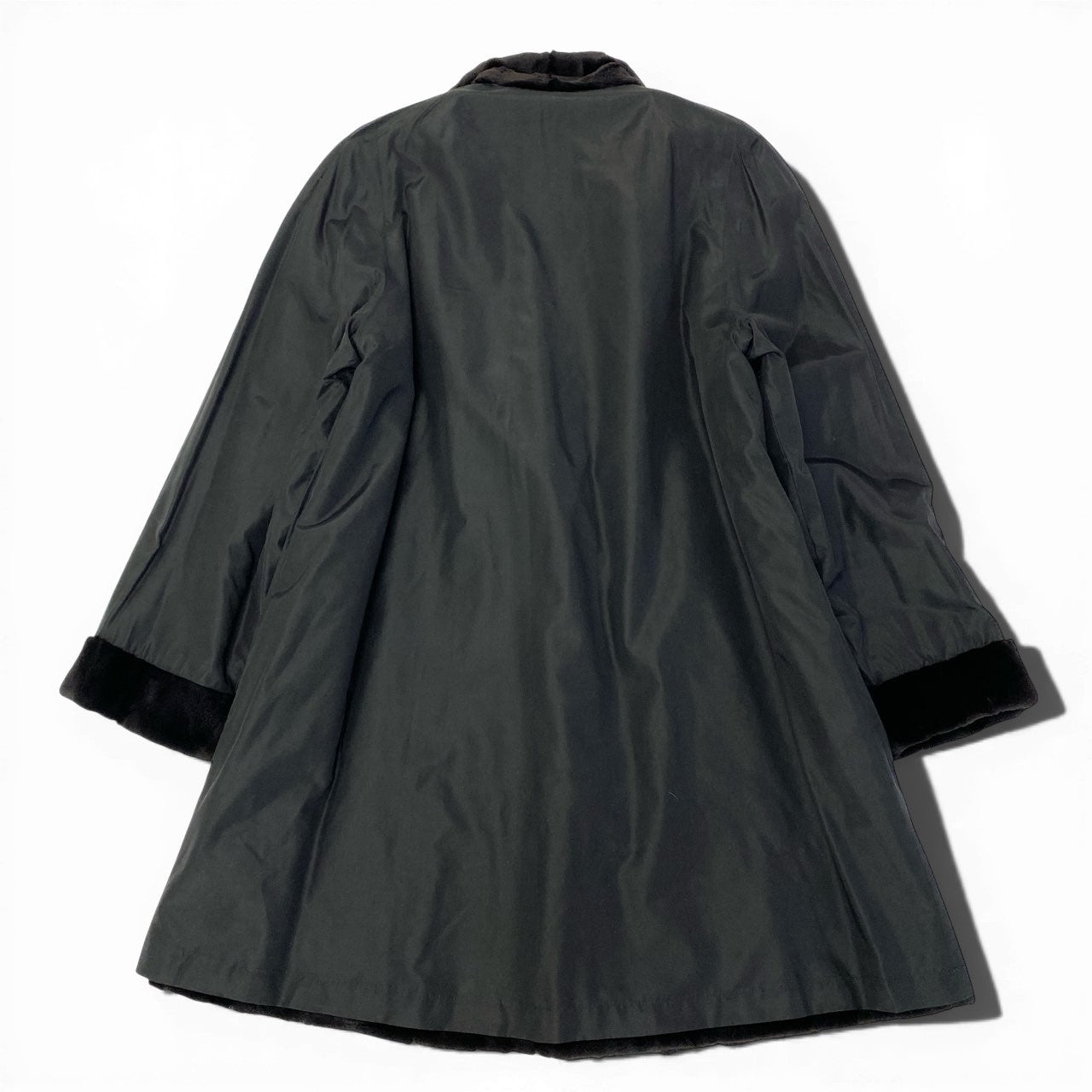 深みのあるブラック系カラーのシェアードミンクとダークミンクを使用した、高級感のあるリバーシブル毛皮コートです。片面はナイロン系のマットな質感、もう片面は毛足の美しいミンク仕様で、シーンに応じて表情を変えて着用できます。ダイヤ模様の切り替えが上品なアクセントになり、落ち着いた華やかさを演出します。通勤やフォーマルシーンはもちろん、冬のお出かけにも活躍する一着です。