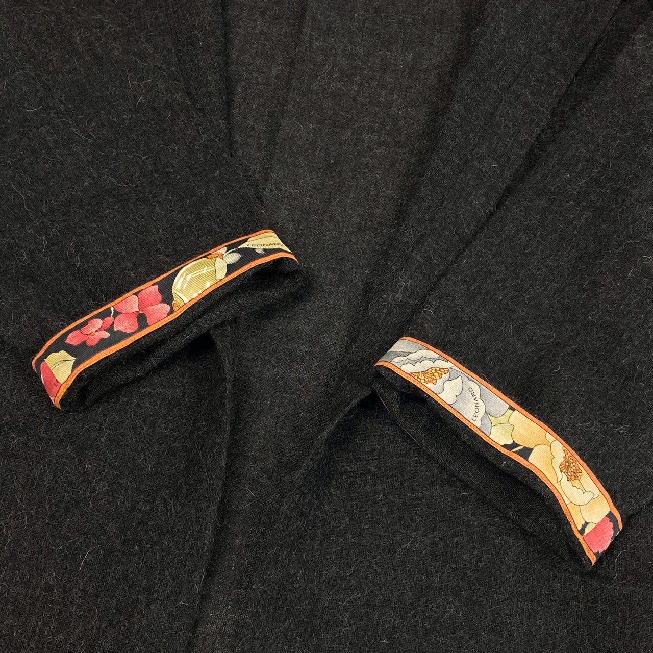 レオナールのロングカーディガンで、上品なチャコール寄りのグレーが落ち着いた印象を与えます。無地デザインに、アルパカ混の薄手で柔らかな素材感が魅力の一着です。袖口に施されたレオナールらしいフラワー柄の配色ディテールがさりげないアクセント。羽織りとして季節の変わり目や室内外の温度調整に活躍し、きれいめからリラックススタイルまで幅広く合わせられます。