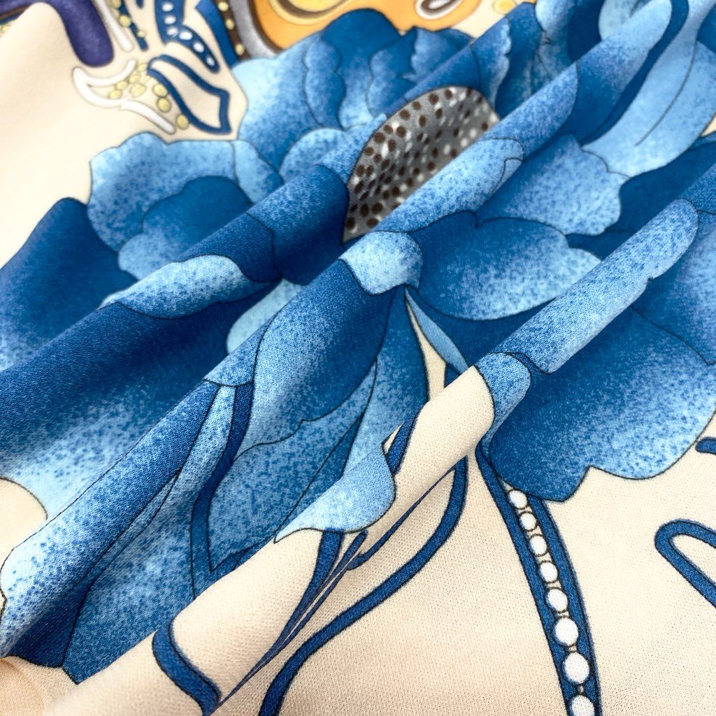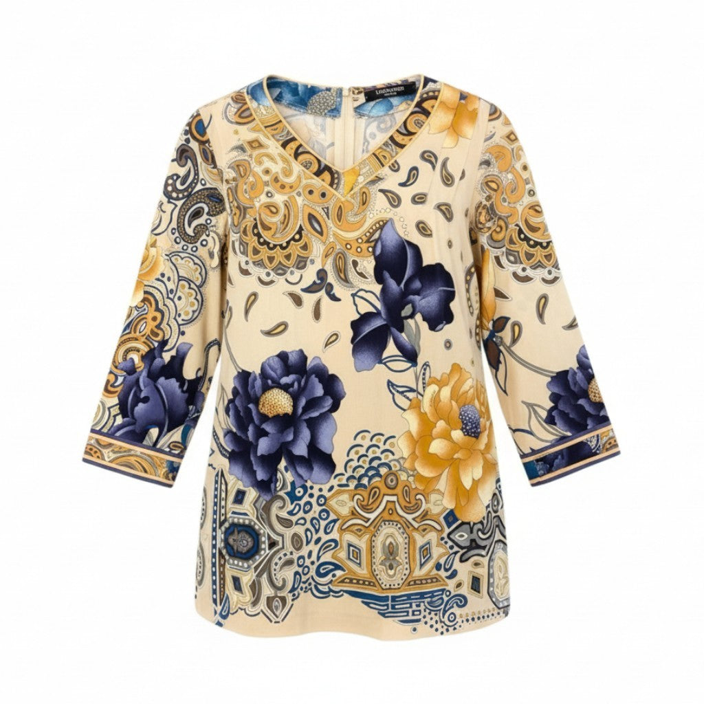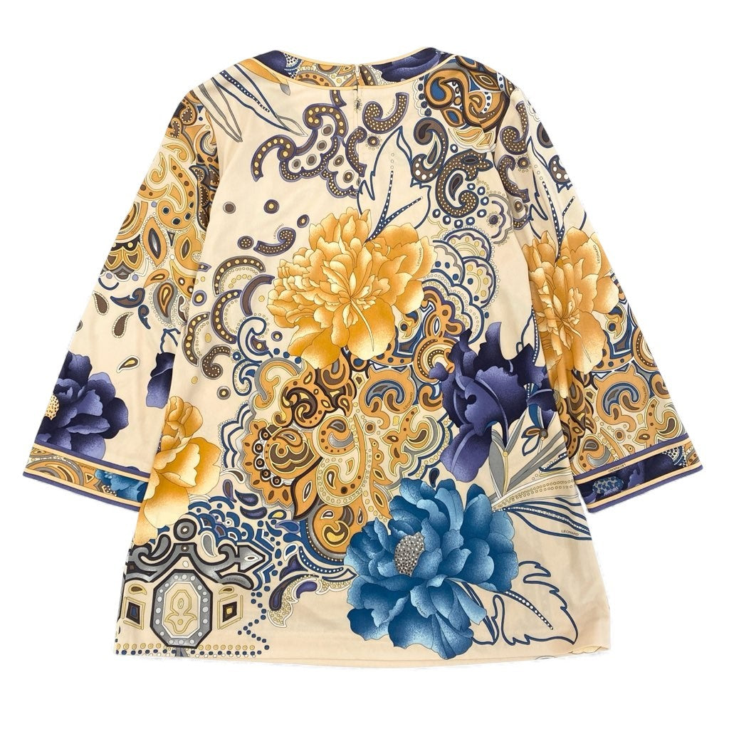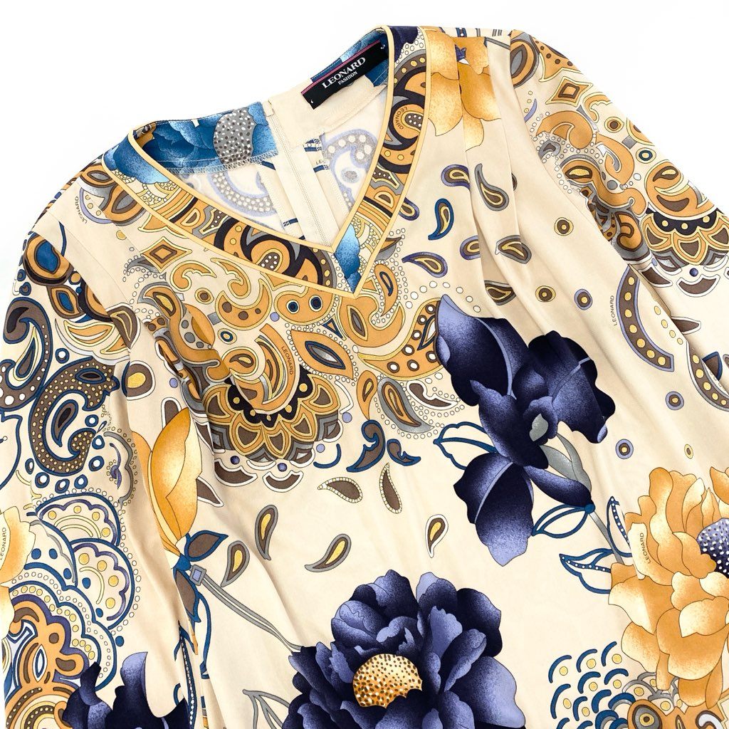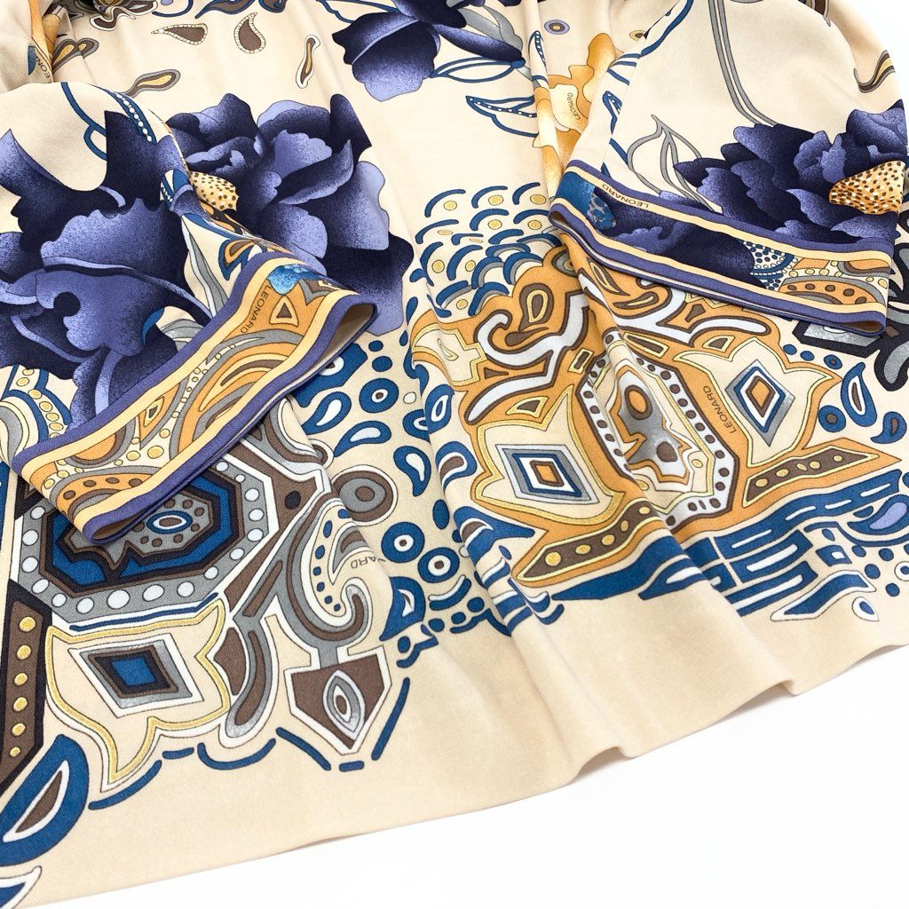 LEONARDらしい華やかさが際立つ、カンカン素材のロングスリーブカットソーです。アイボリーベースにネイビー・マスタード系のフラワーとペイズリー調モチーフを配した総柄デザインが、上品で存在感のある印象を演出します。マットでさらりとしたカンカン素材はシワになりにくく、快適な着心地が魅力です。Vネック仕様で首元をすっきり見せ、デイリーからお出かけ、旅行まで幅広く活躍します。