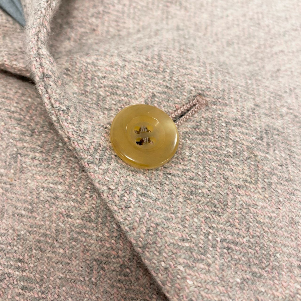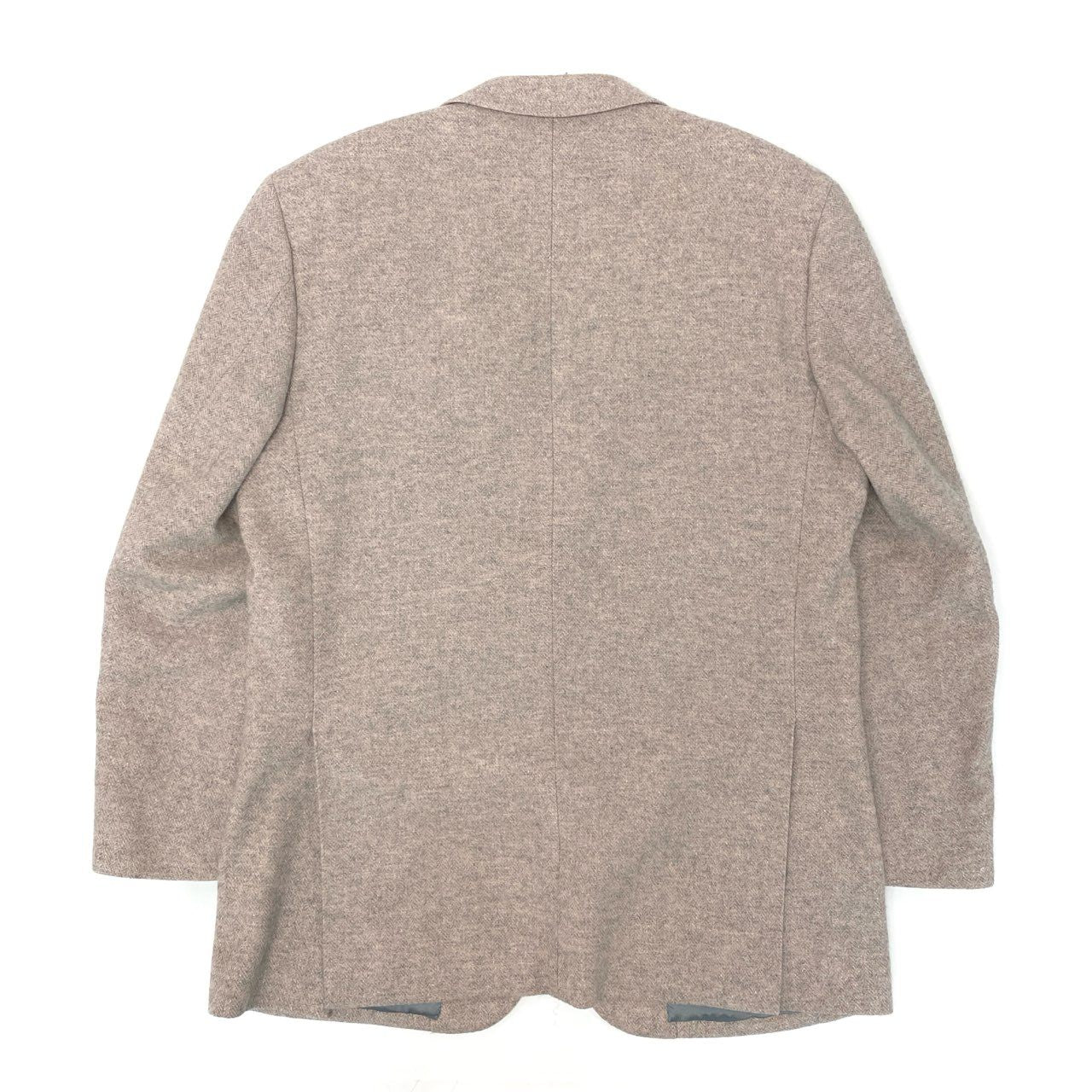 ミラショーンのテーラードジャケットで、上品なライトトープ(ベージュ寄りの落ち着いたグレージュ)に、細かなヘリンボーン柄が織り込まれた高級感ある一着です。カシミヤ×シルク混素材ならではの、しっとりとした柔らかさと軽い着心地が魅力です。ゴールド調のボタンがアクセントとなり、クラシックで洗練された印象に仕上がっています。ビジネスシーンはもちろん、ニットやシャツと合わせて品よくまとめる大人のカジュアルにも最適な万能ジャケットです。