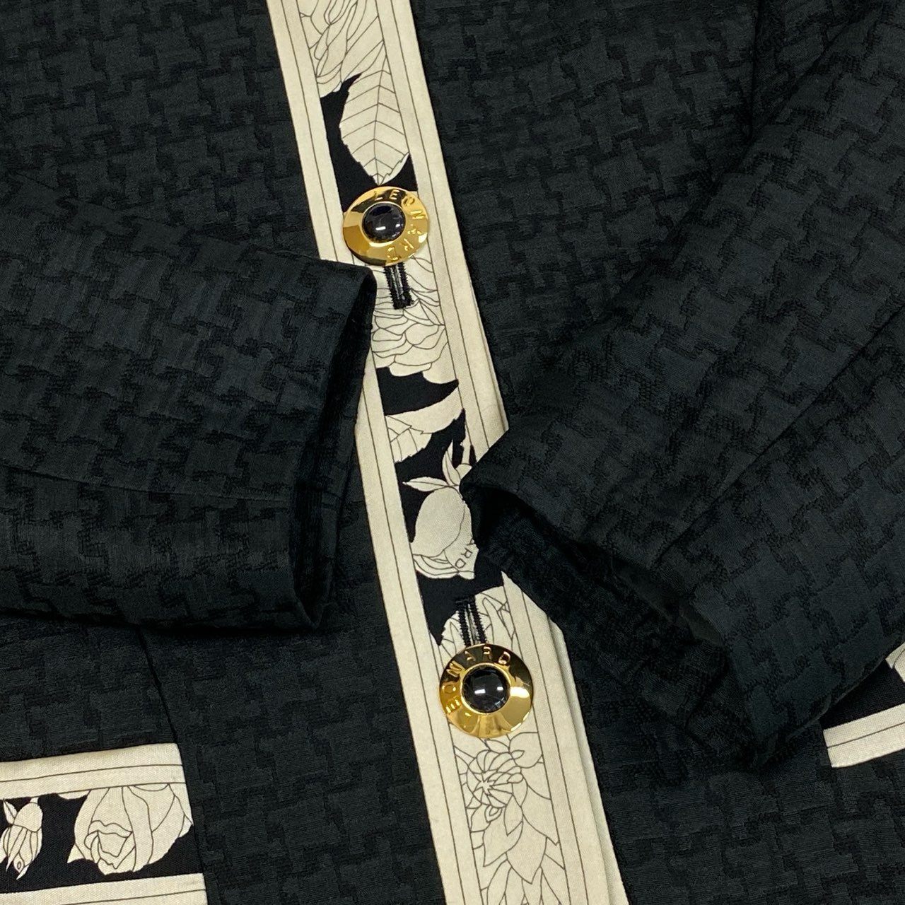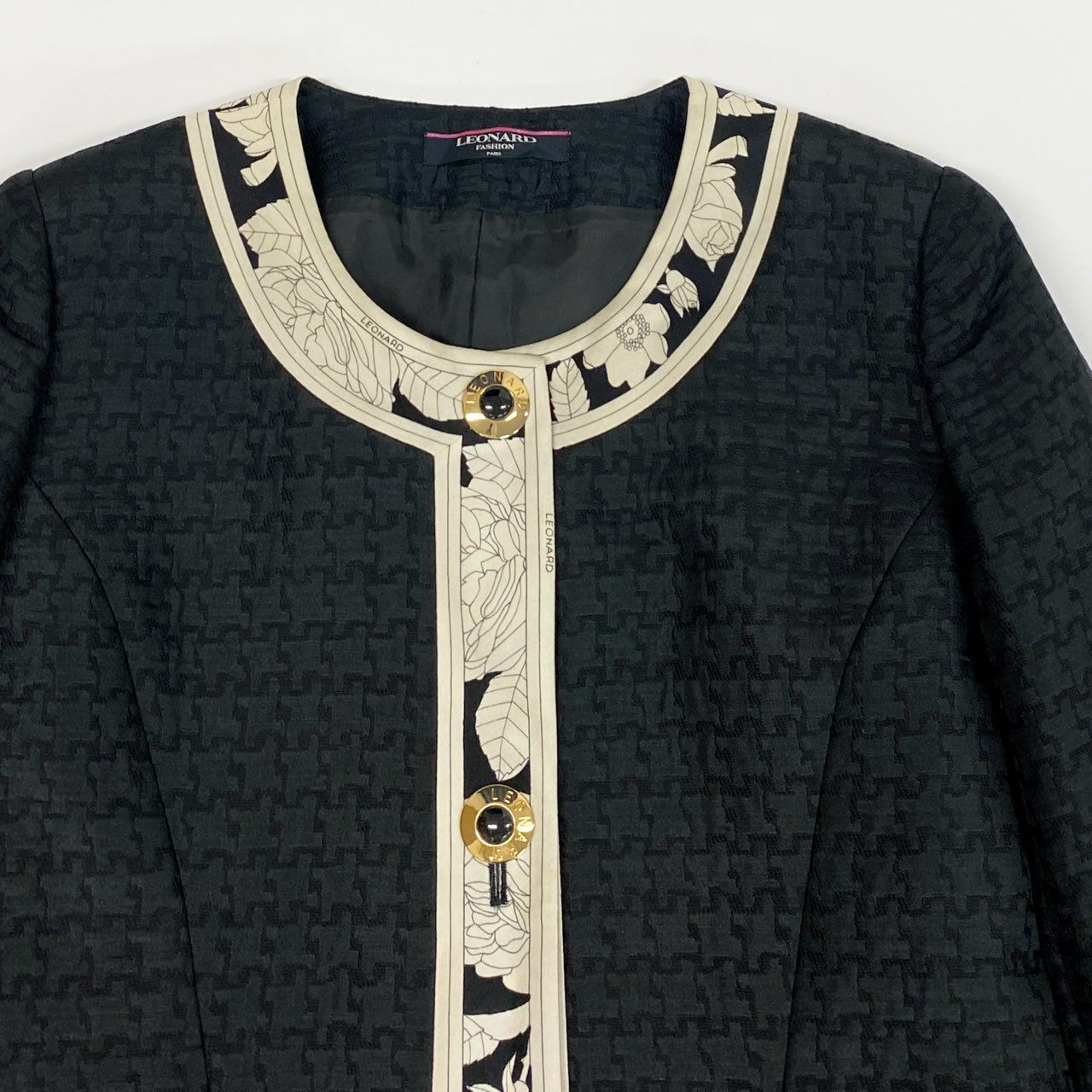 49L8 LEONARD レオナール ノーカラージャケット 美しい花柄プリント 金ボタン 11ARサイズ ブラック レディースo07t
