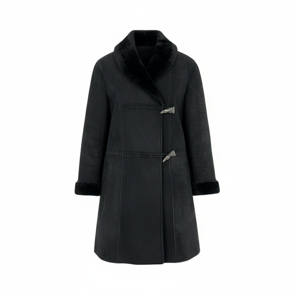 バリーらしい上質感が際立つ、ブラックカラーのムートンコートです。表面はマットで落ち着いたムートン素材、襟元と袖口には毛足のあるムートンが施され、暖かさと高級感を兼ね備えています。フロントはトグルボタン仕様で、クラシックかつ上品な印象。通勤スタイルやきれいめカジュアル、冬のお出かけシーンまで幅広く活躍する一着です。