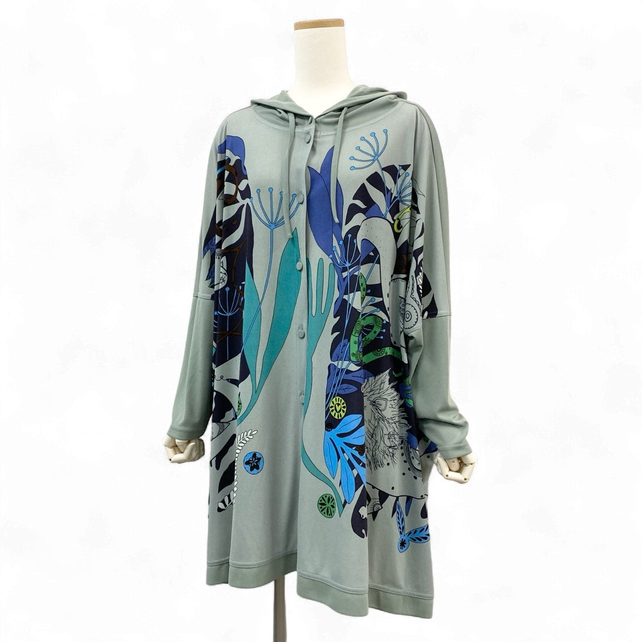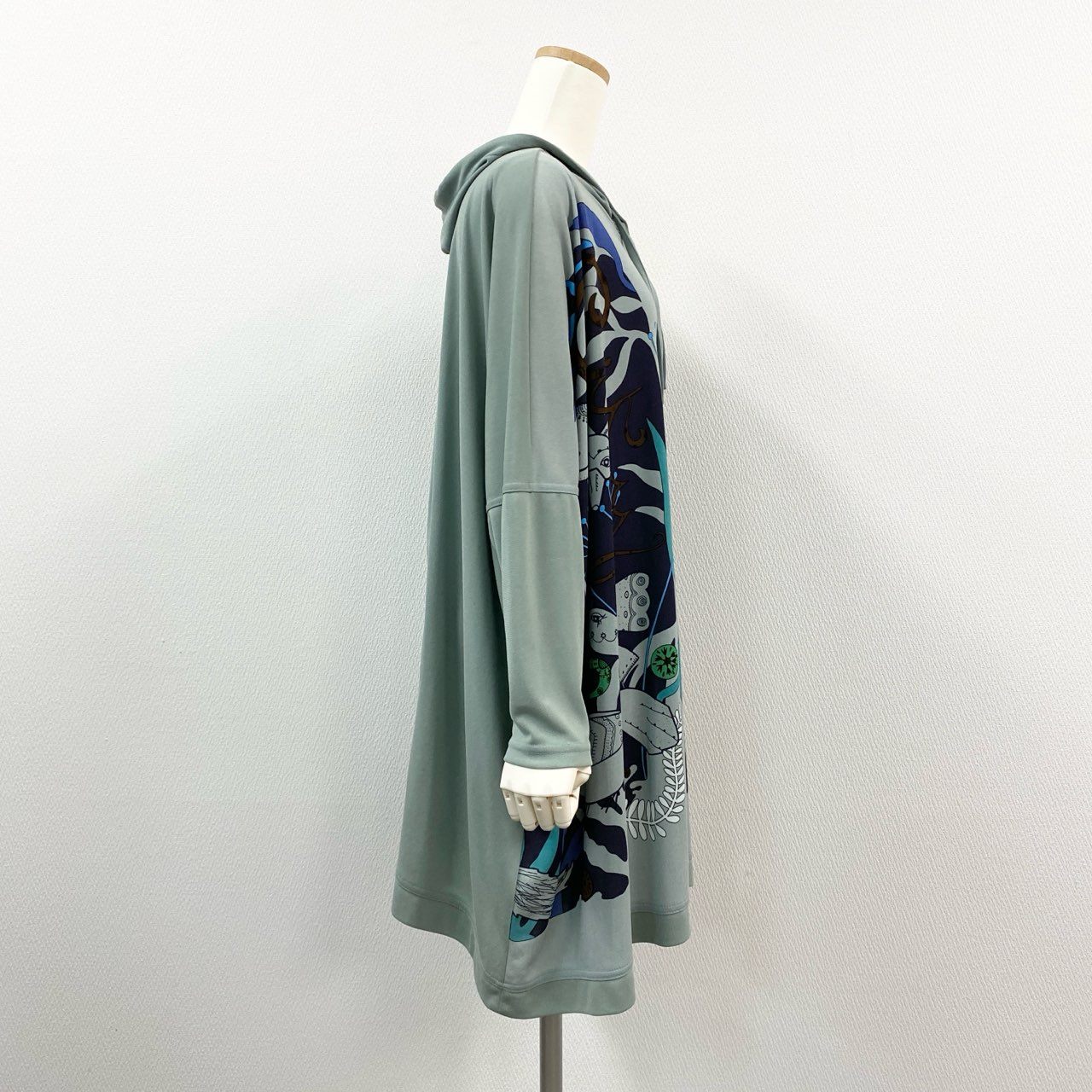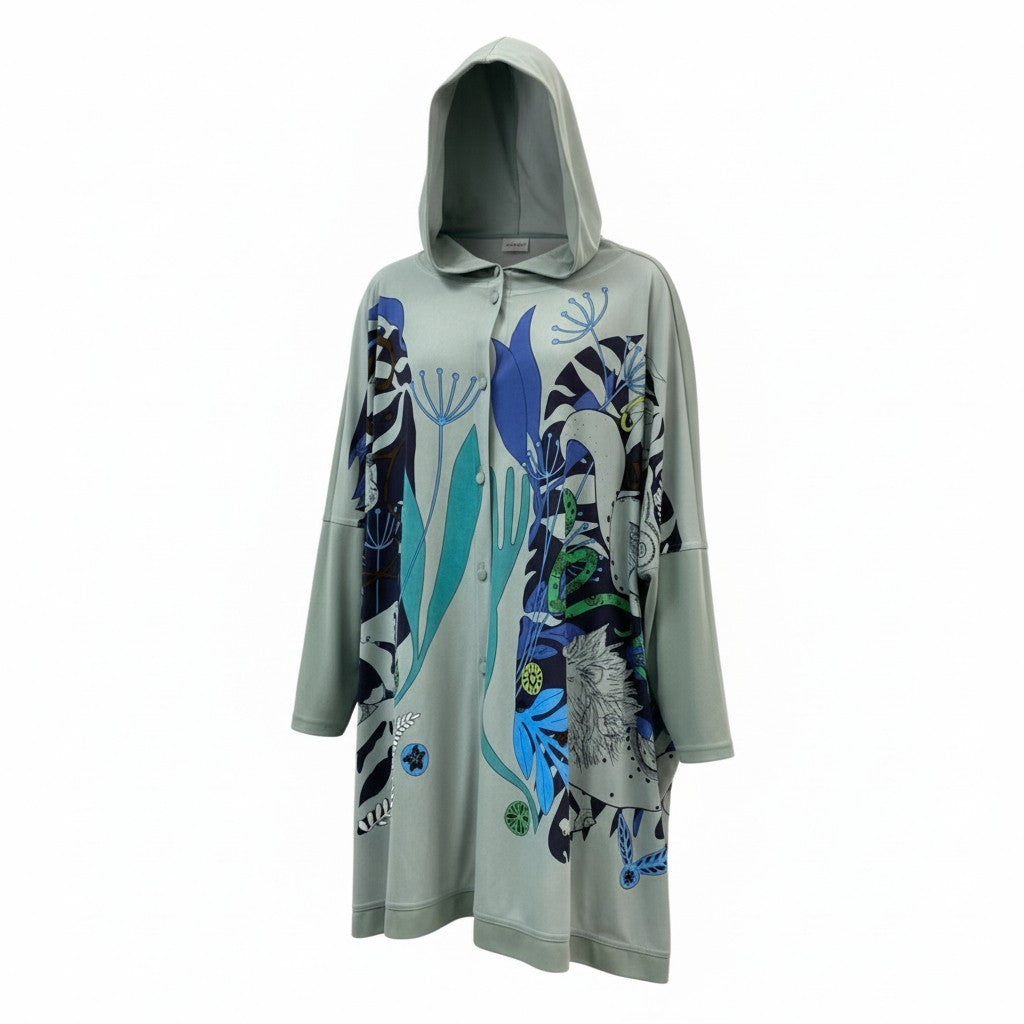スモーキーグリーンをベースに、ブルー・ターコイズ・ブラックなどを使用した抽象的アートプリントが目を引く、TOKUKO 1er VOL らしい個性的なフーディーワンピースです。柔らかく落ち感のある素材で、動くたびに自然なドレープが生まれる軽やかな着心地。フード付きのリラックスデザインながら、華やかなプリントにより一枚で存在感のあるコーデが完成します。デイリーのおしゃれ着はもちろん、旅行・イベント・お出かけシーンにも活躍する万能アイテムです。