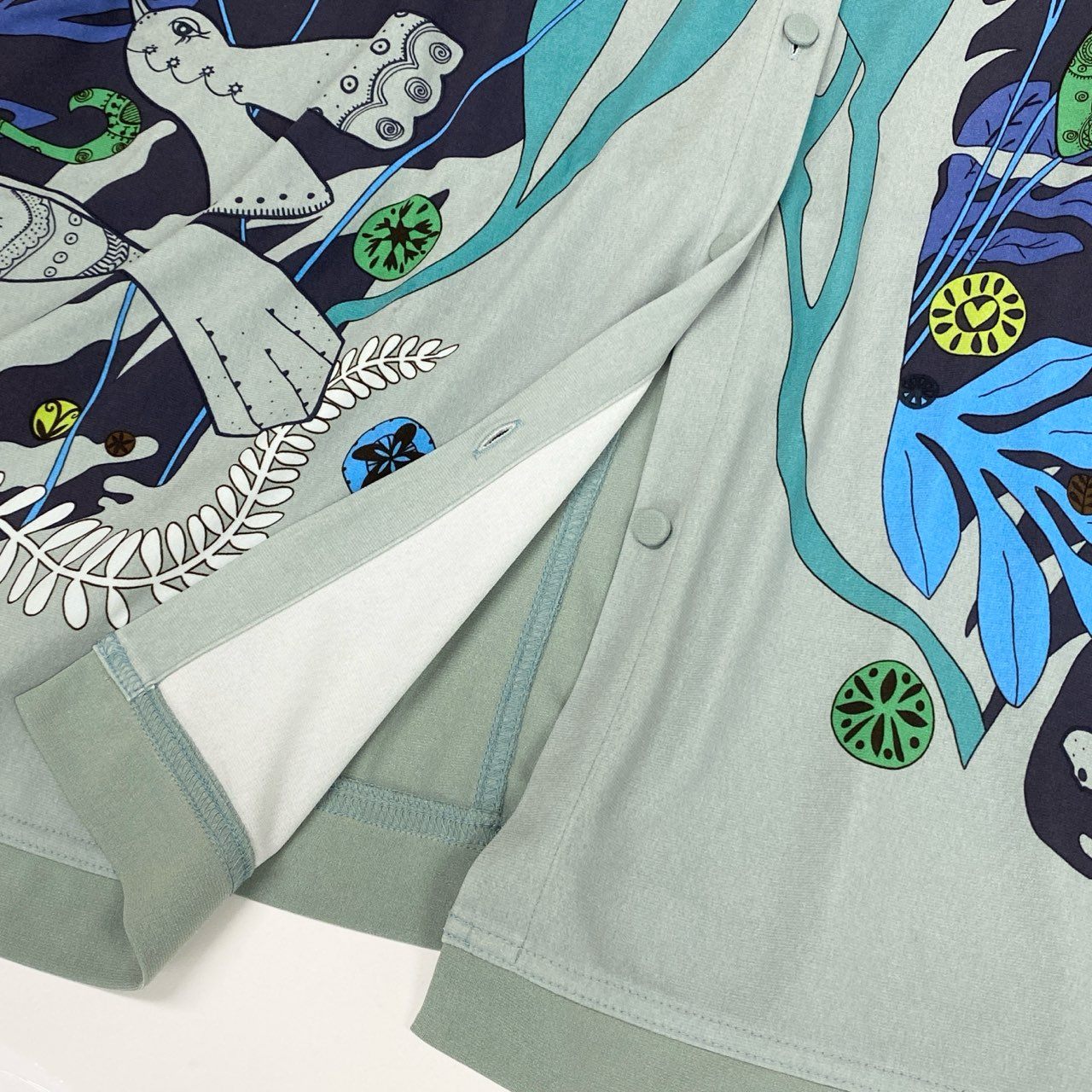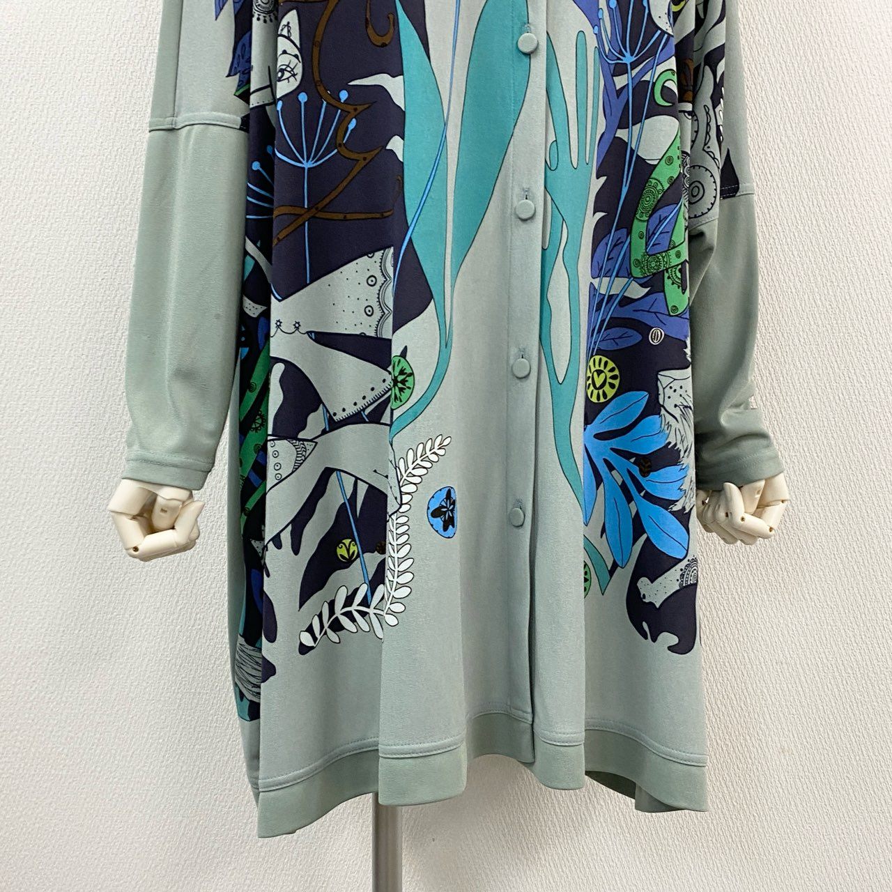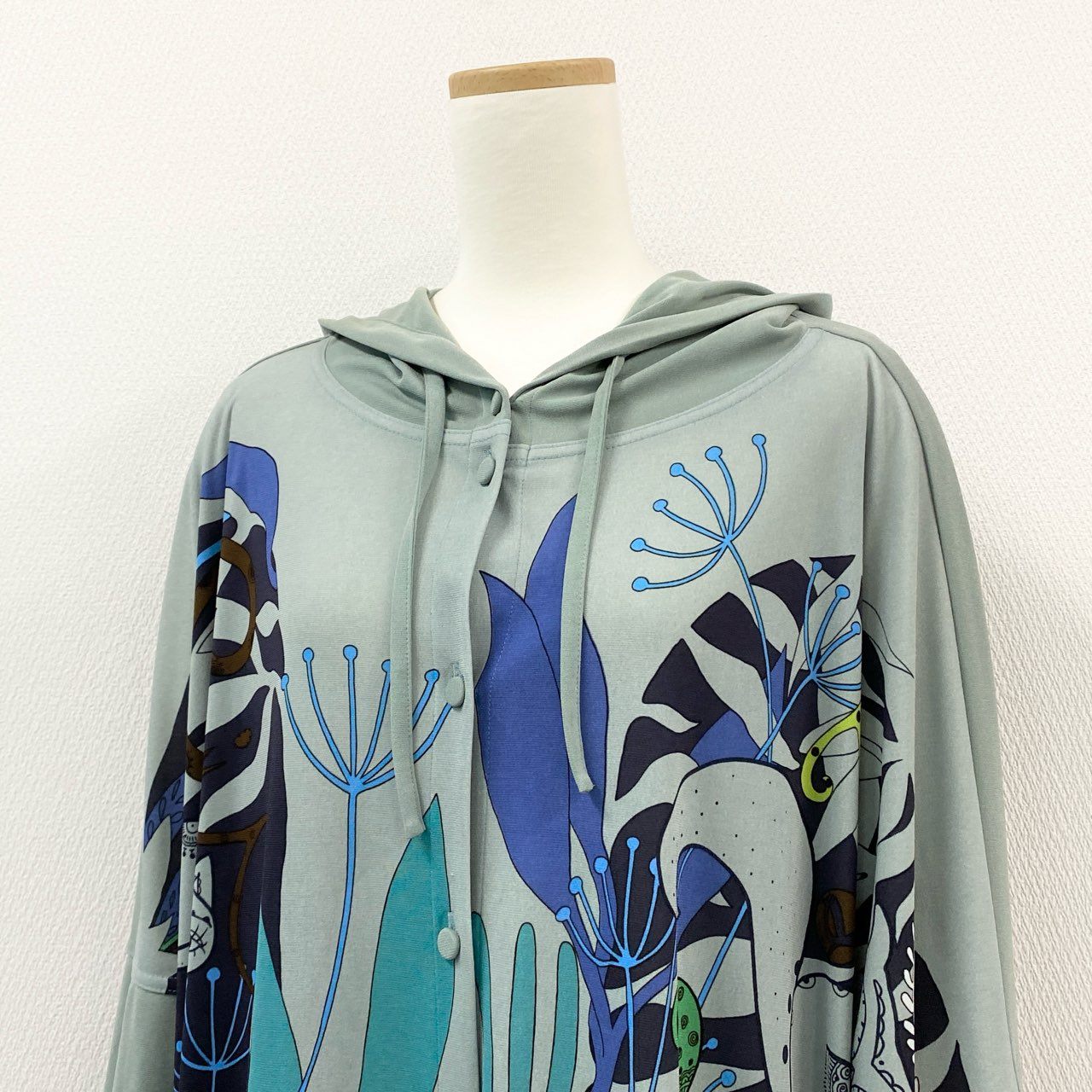 スモーキーグリーンをベースに、ブルー・ターコイズ・ブラックなどを使用した抽象的アートプリントが目を引く、TOKUKO 1er VOL らしい個性的なフーディーワンピースです。柔らかく落ち感のある素材で、動くたびに自然なドレープが生まれる軽やかな着心地。フード付きのリラックスデザインながら、華やかなプリントにより一枚で存在感のあるコーデが完成します。デイリーのおしゃれ着はもちろん、旅行・イベント・お出かけシーンにも活躍する万能アイテムです。