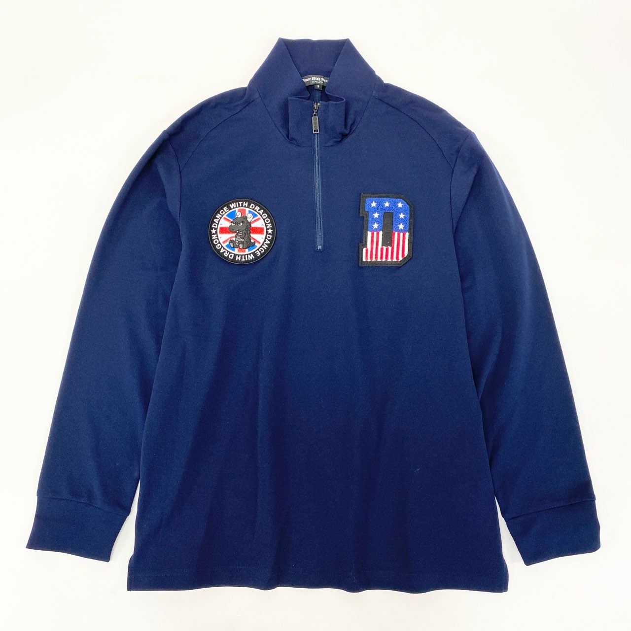 DANCE WITH DRAGON(ダンスウィズドラゴン)のハーフジップ長袖シャツ。ミッドナイトネイビーのボディに、星条旗モチーフの「D」ワッペンとブランドロゴパッチが映えるスポーティなデザインです。マットな質感のポリエステル混素材で、軽量かつ伸縮性に優れ、快適な着心地を実現。襟元のジップで温度調整がしやすく、秋冬のラウンドや練習にも最適な一枚です。