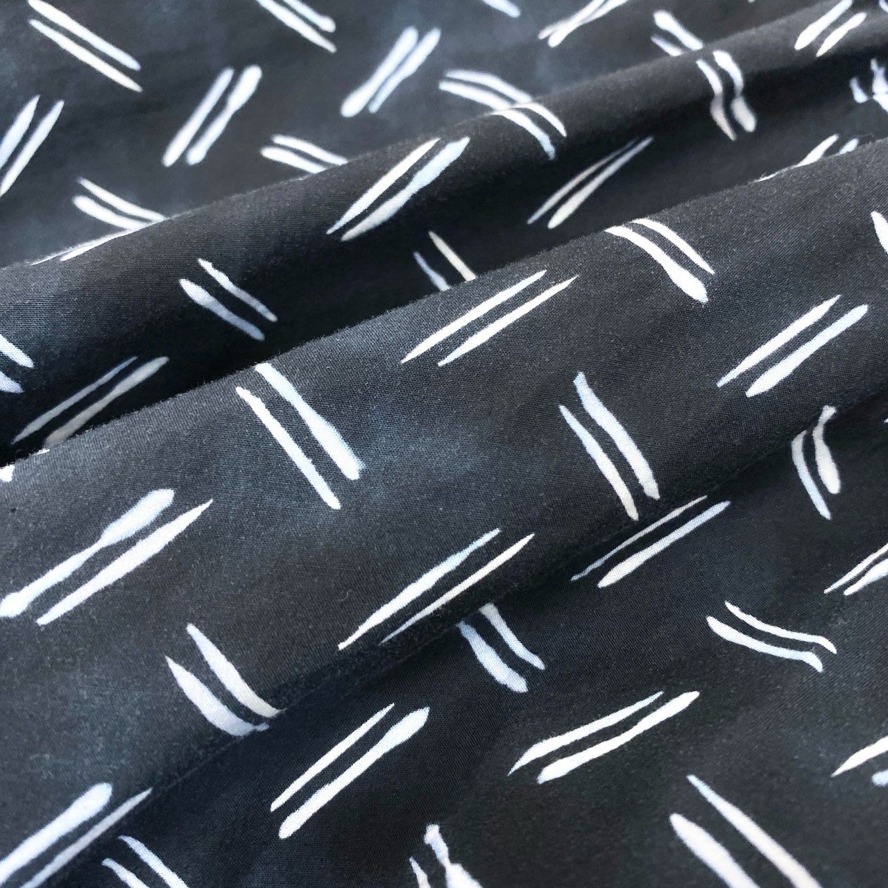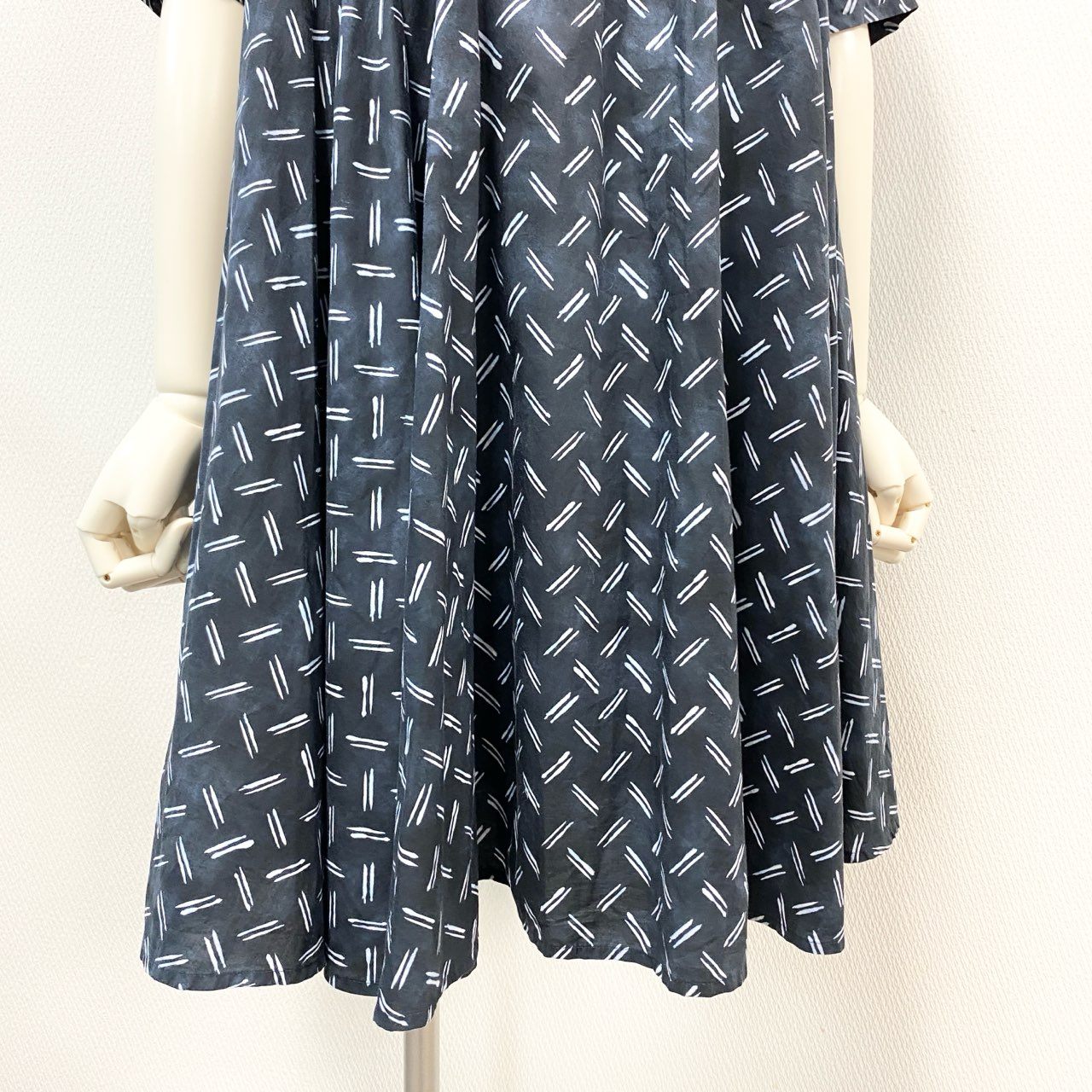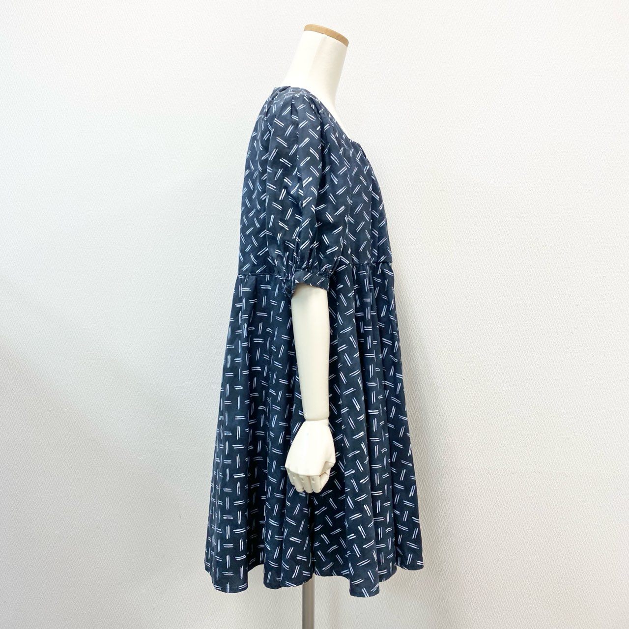 Merlette(マーレット)のコットンワンピース。落ち着いたネイビー地にホワイトの幾何学ストライプ柄が施され、上品でモダンな印象を与えます。マットなコットン素材で通気性が良く、ふんわりと広がるAラインシルエットが女性らしさを引き立てます。スクエアネックとパフスリーブのデザインが特徴で、カジュアルからリゾート、休日のお出かけまで幅広く活躍する一着です。